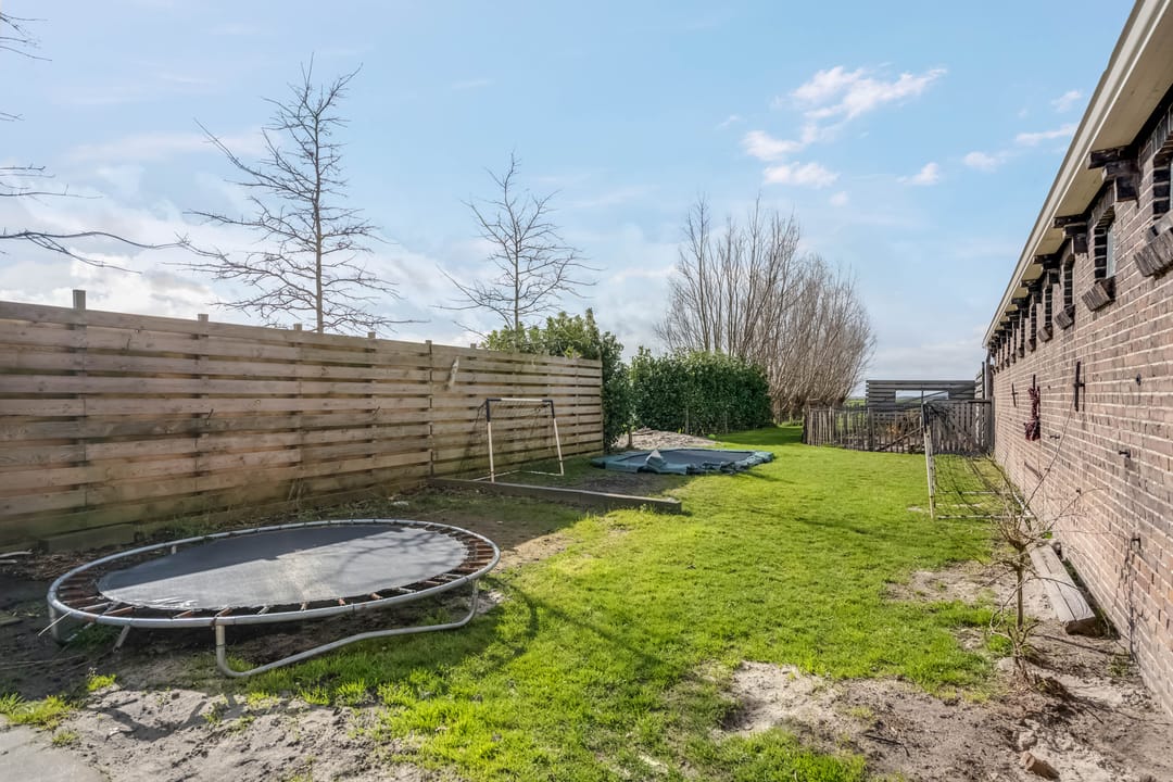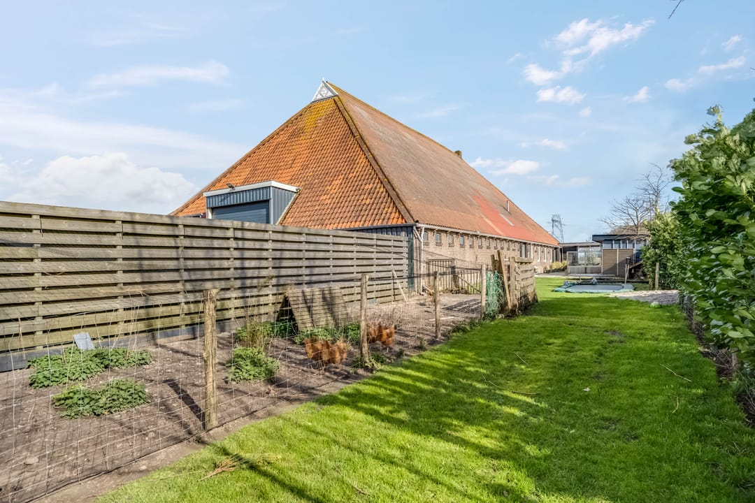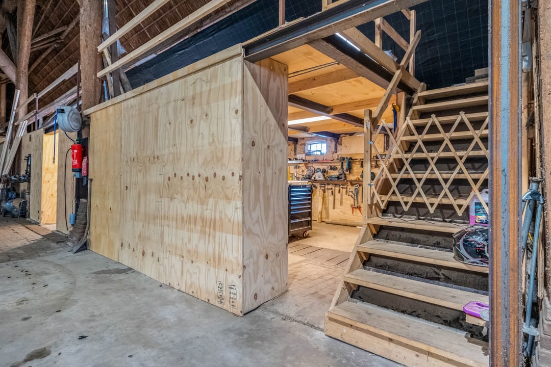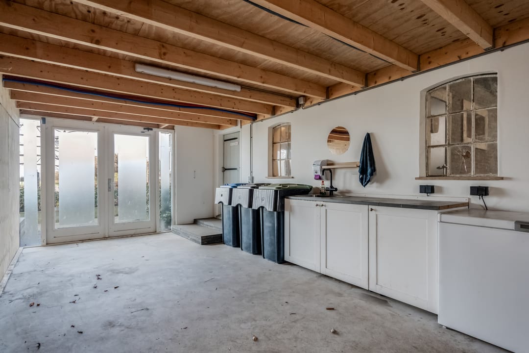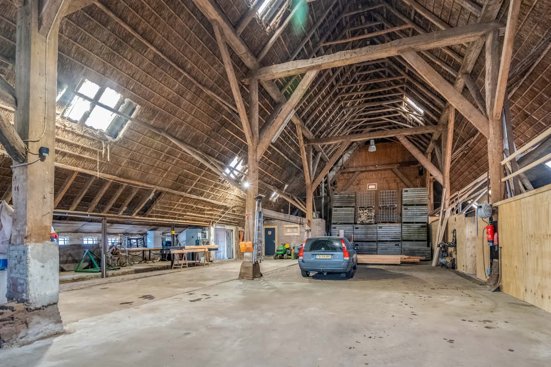 Het achterste gedeelte van de boerderij is ingericht als grote open ruimte met aan de achterzijde een op afstand bedienbare overheaddeur, deze ruimte is zeer geschikt voor bijvoorbeeld het stallen van caravans. Daarnaast zijn er separate opslagruimtes en een kippenverblijf met buitenruimte aanwezig.