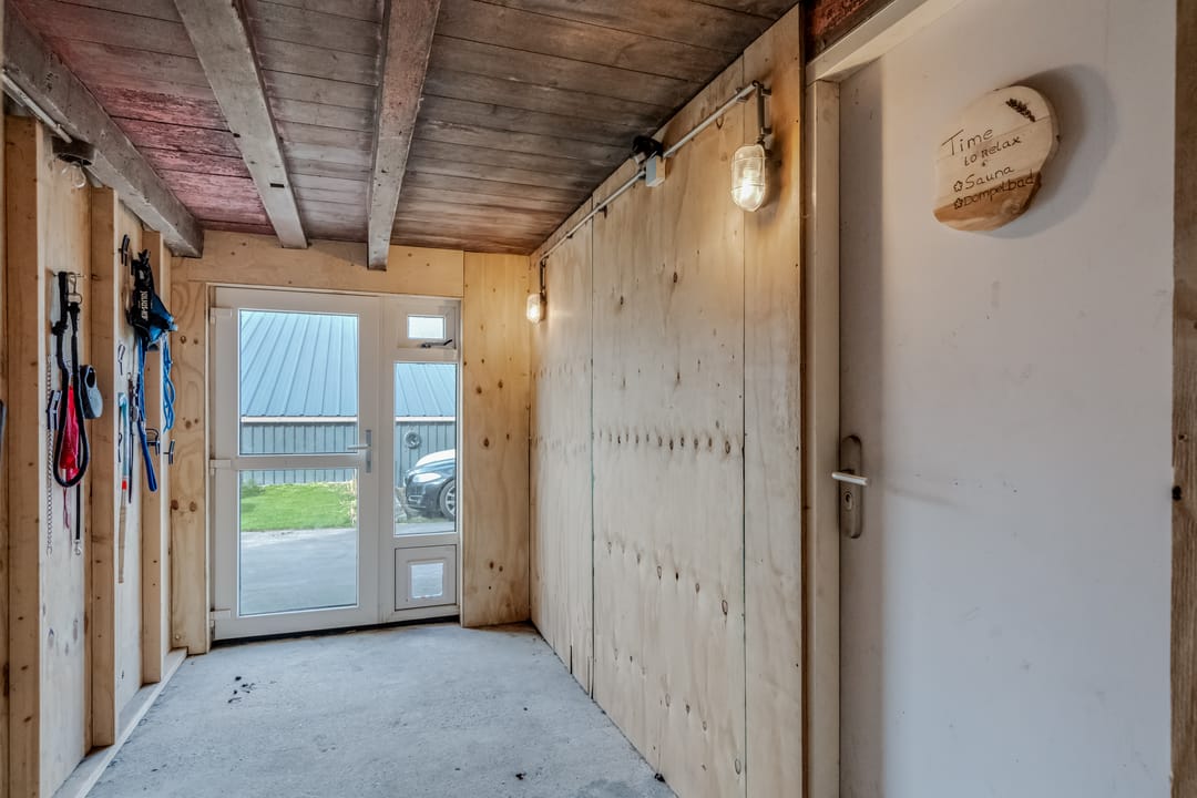 Praktische ruimte met plek voor fietsen en opslag. Aangrenzend bevindt zich een wellnessruimte met een Finse sauna en douchecabine met massagejets, hier tegenover is een aparte opslagruimte voor o.a. de gazon maaier & tuingereedschap.