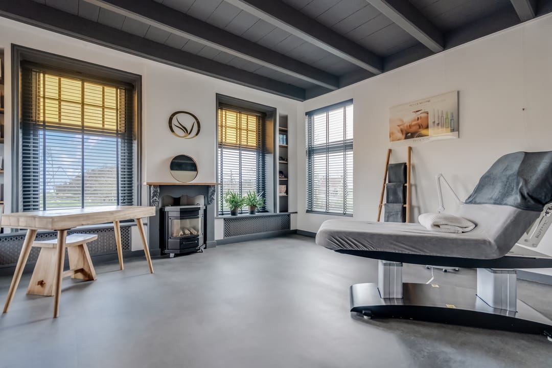 Indeling: eigen entree, hal met toegang tot de praktijkruimte met veel lichtinval door de grote raampartijen, een karakteristieke schouw met haard en balkenplafond. Deze ruimte is momenteel ingericht als schoonheidssalon, maar leent zich uitstekend voor diverse doeleinden.