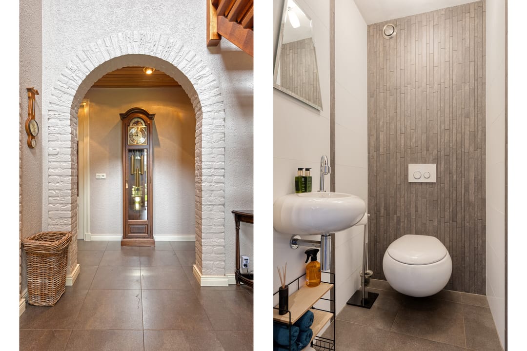 - Begane grond: lichte entree met meterkast, toilet en garderobe; woonkamer met veel raampartijen en toegang tot de tuin; ruime woonkeuken voorzien van moderne apparatuur; bijkeuken met aansluitingen voor was- en droogapparatuur.