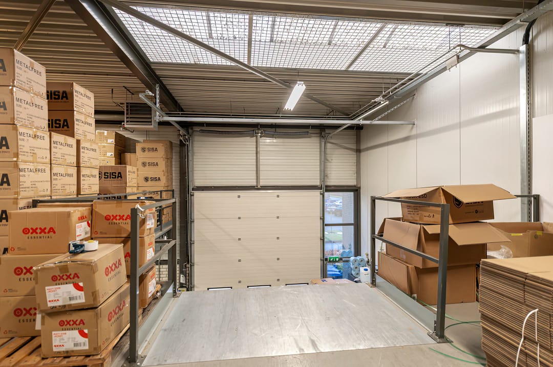 * Bedrijfsruimte met overheaddeur en verdiepingsvloer