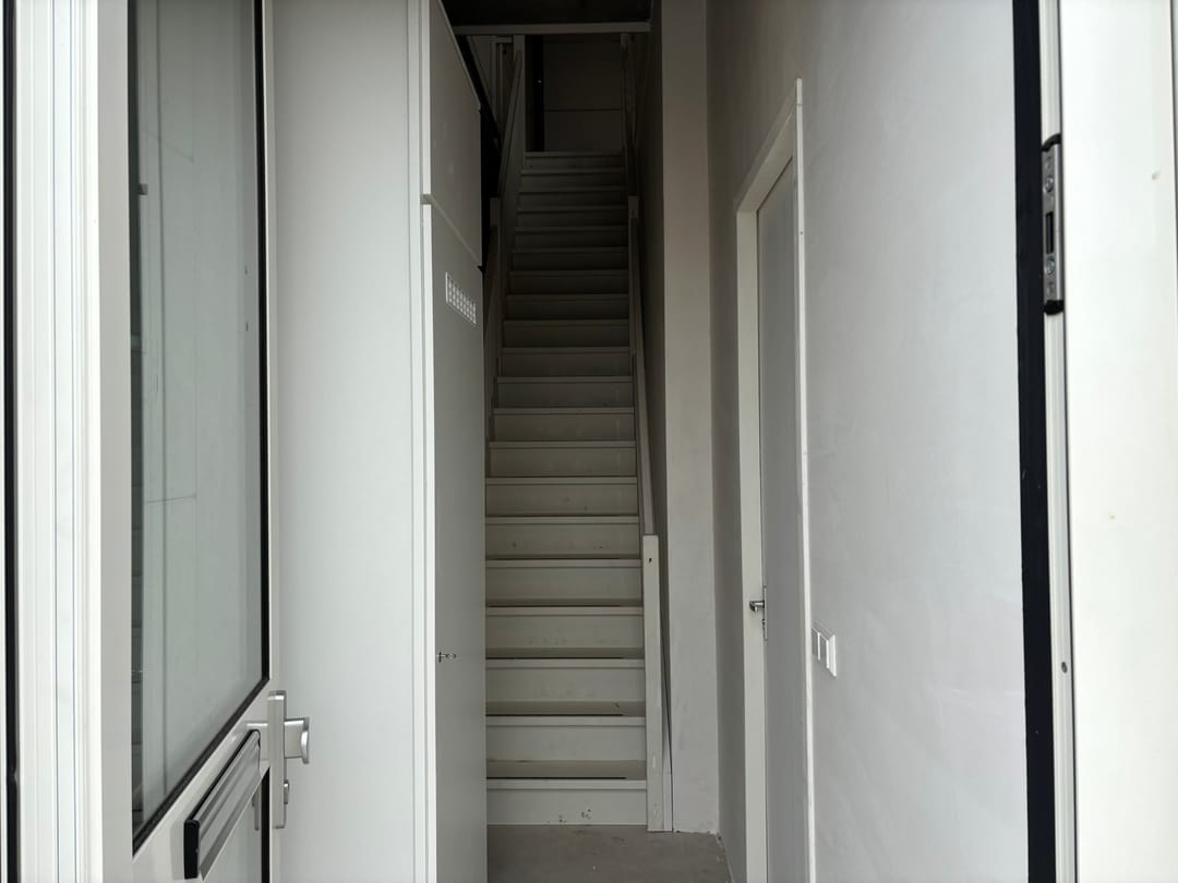 open bedrijfsruimte op de begane grond met meterkast, trapopgang en toilet onder de trap.
