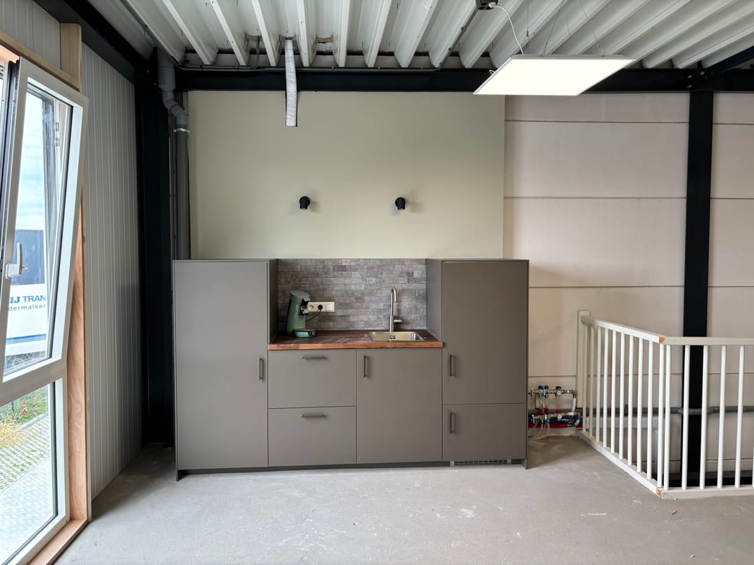 Open kantoorruimte voorzien van keukenblok en systeemplafond met led verlichting.