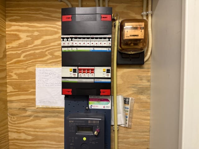- meterkast met 4 lichtgroepen, 1 krachtgroep en 2 aardlekschakelaars.