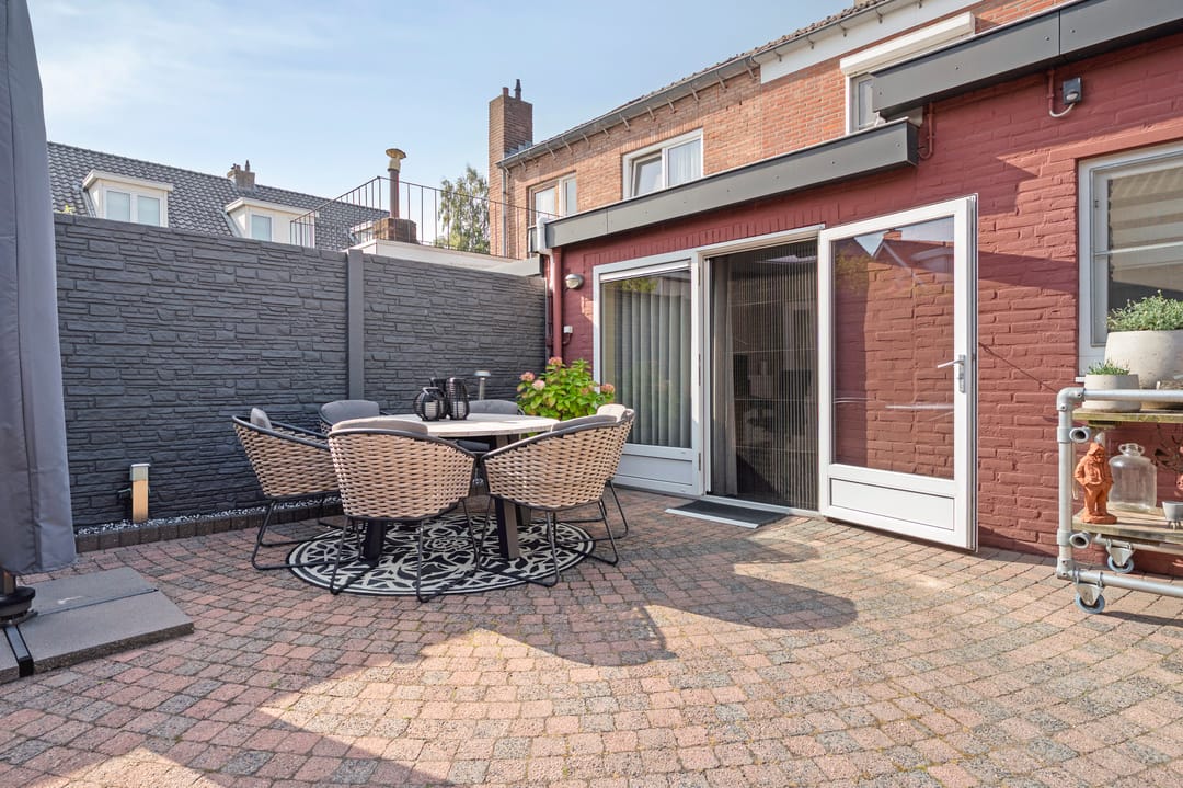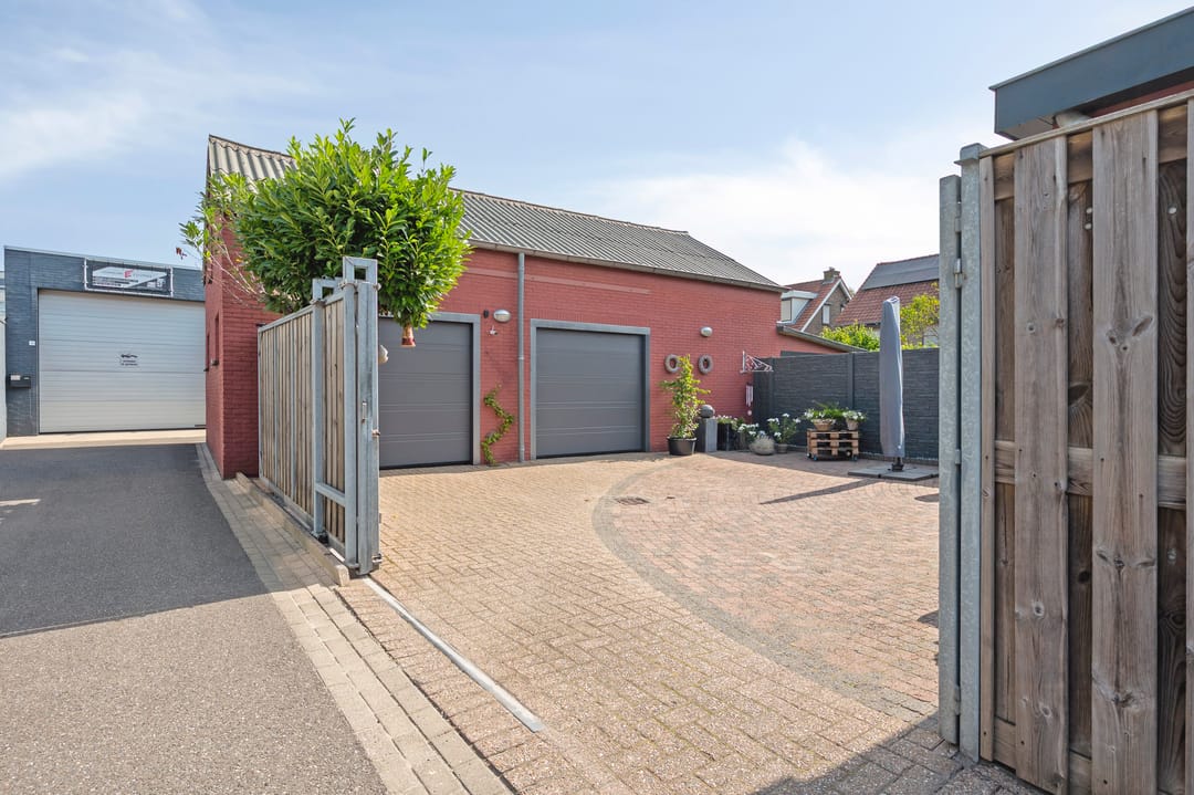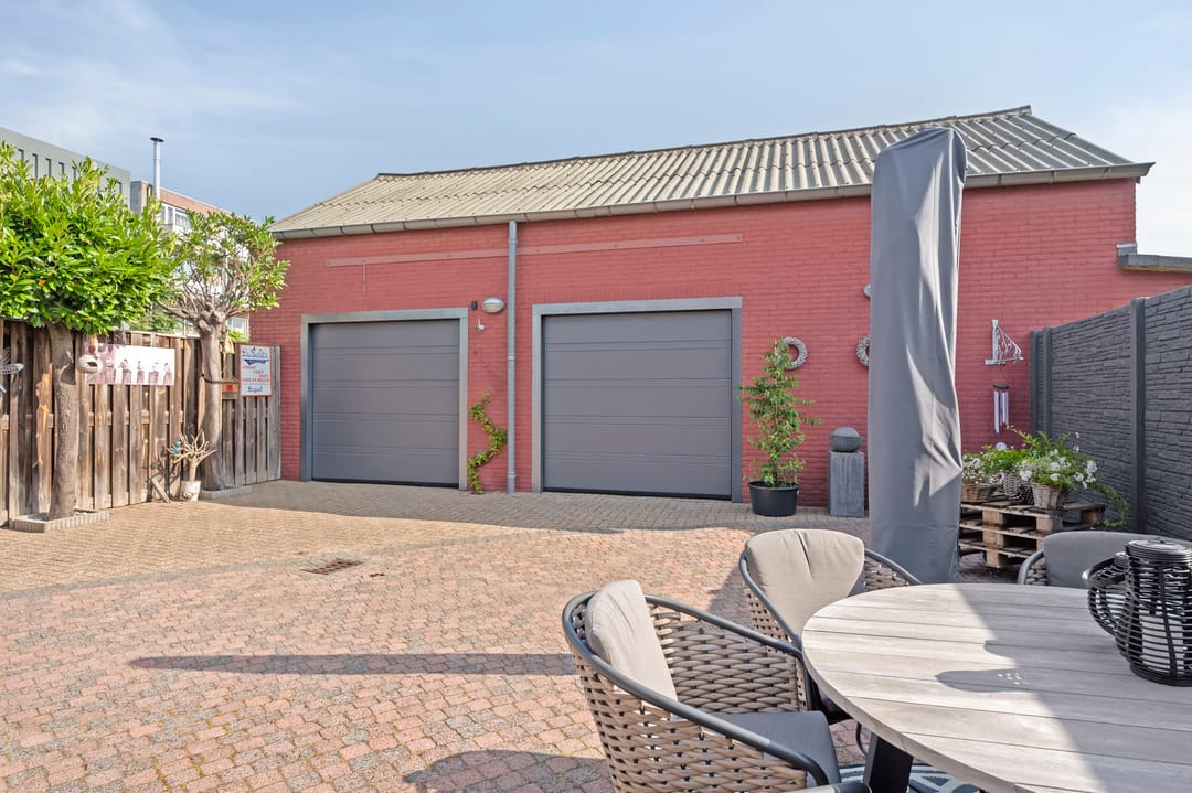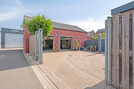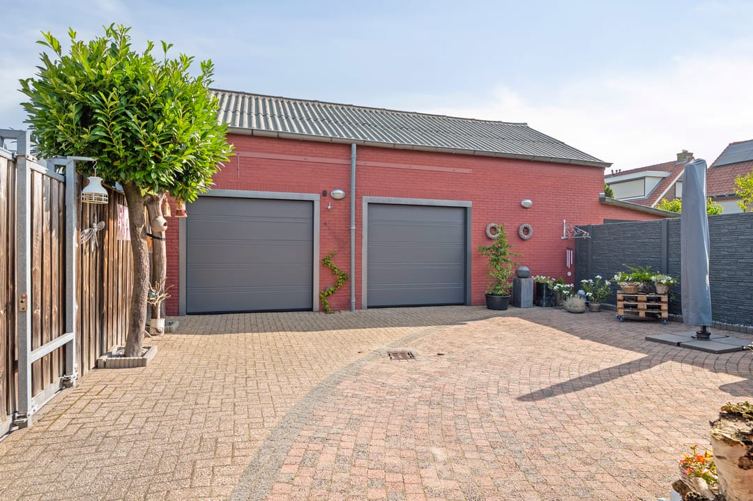 • De onderhoudsvrije zonnige tuin, welke grotendeels beklinkerd is, bereik je via de tuindeur in de leef keuken. Hier kom je ook te voet of met voertuigen via de geasfalteerde (doodlopende) weg langs de zijkant van de woning. Via de loopdeur en de schuifpoort kun je hierdoor gemakkelijk 2 auto’s (of bestelbussen) overdekt parkeren in de vrijstaande garage / multifunctionele ruimte.