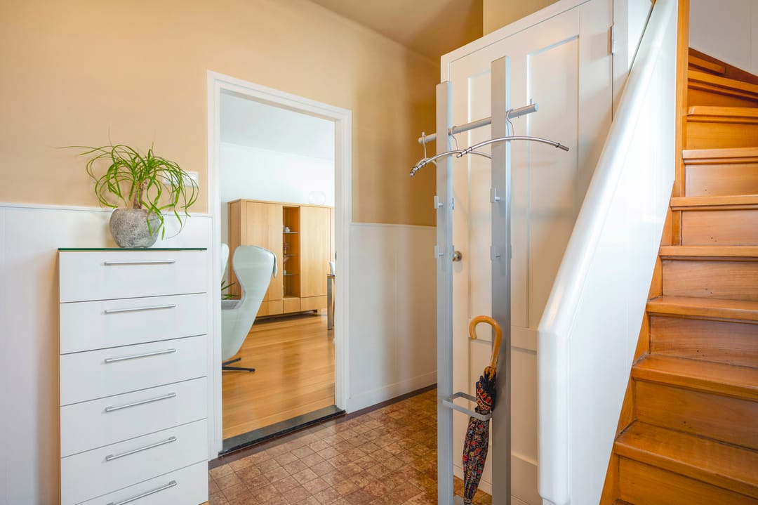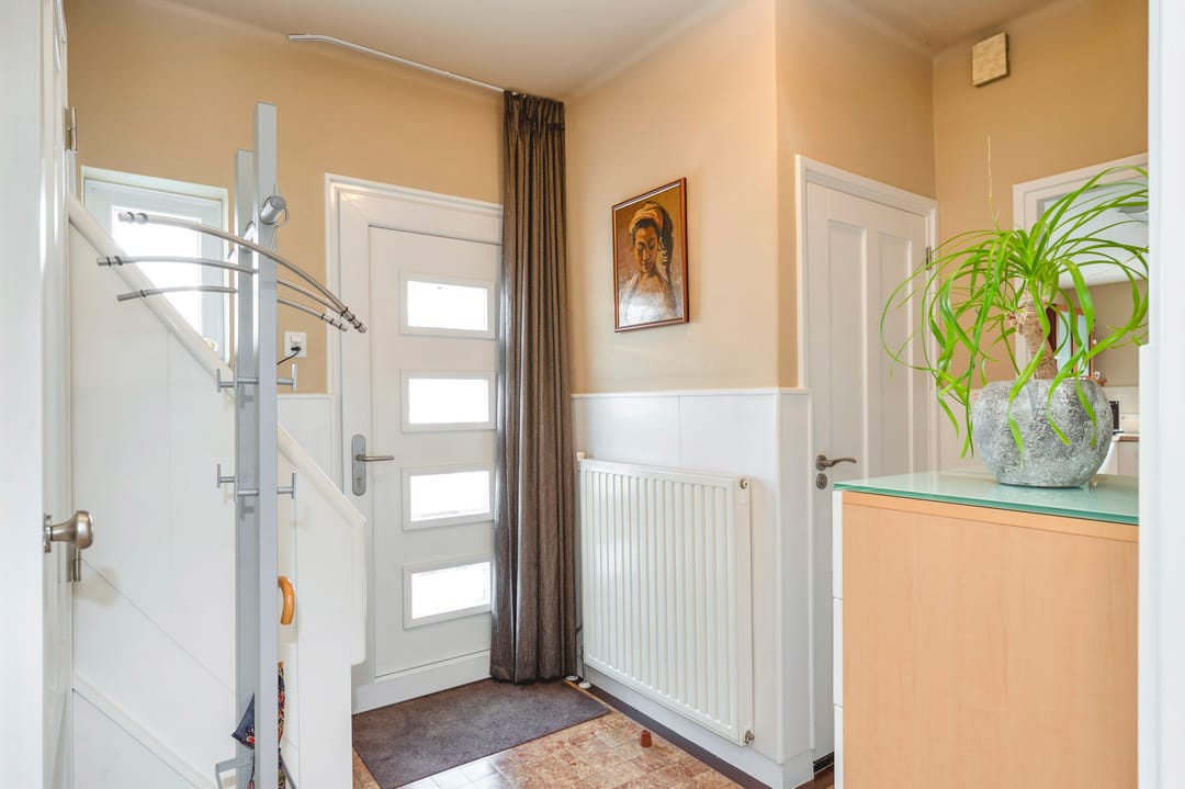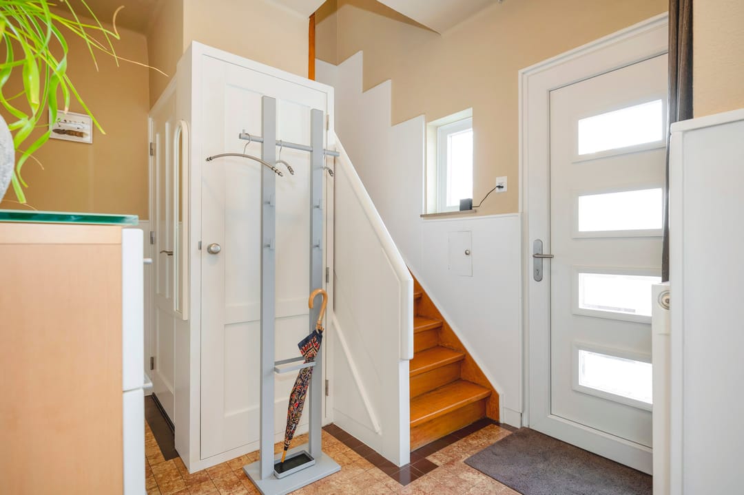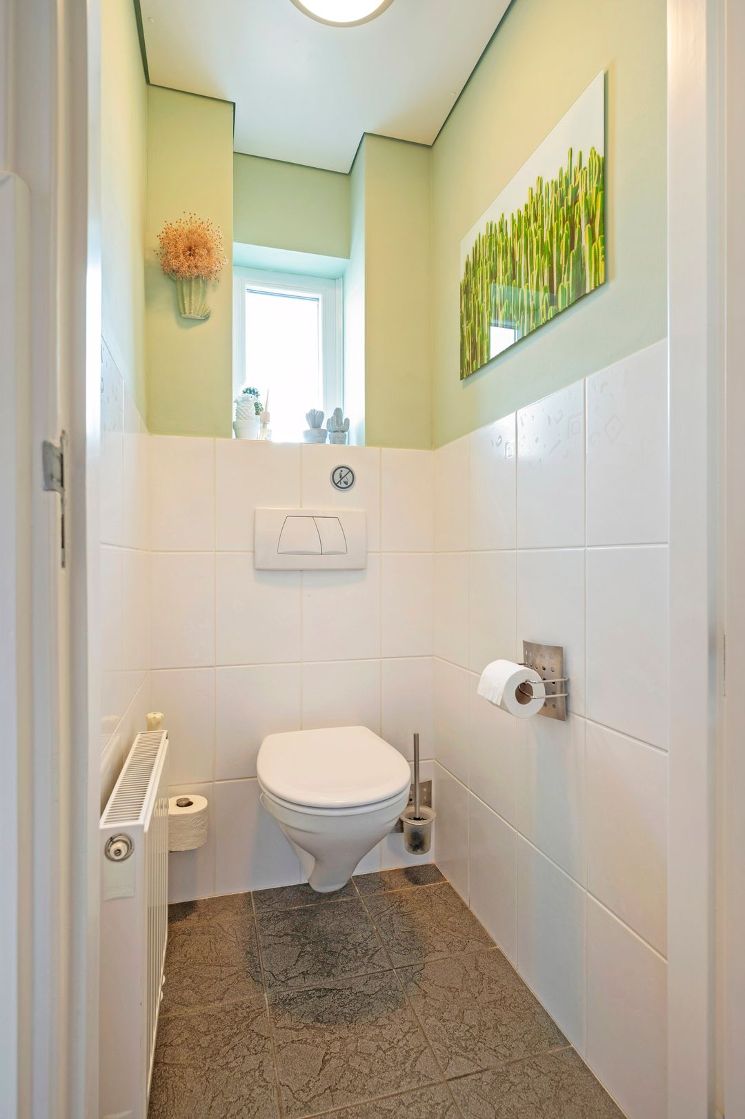 • Op de begane grond ligt de hal met originele tegelvloer, de half betegelde toiletruimte met hangcloset en