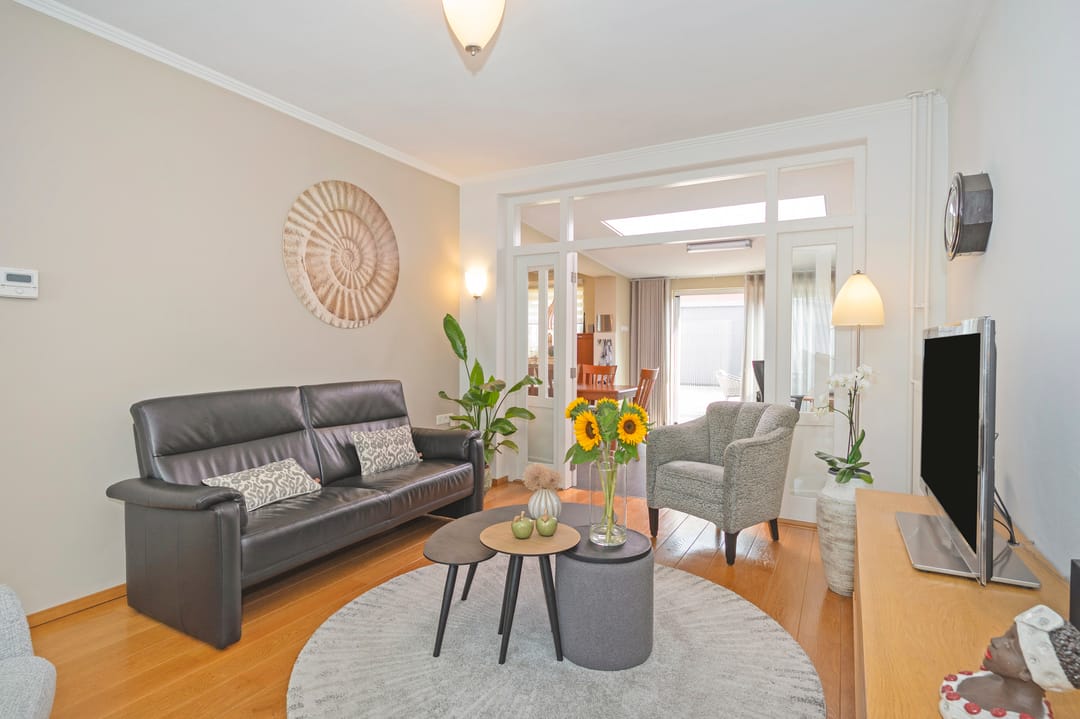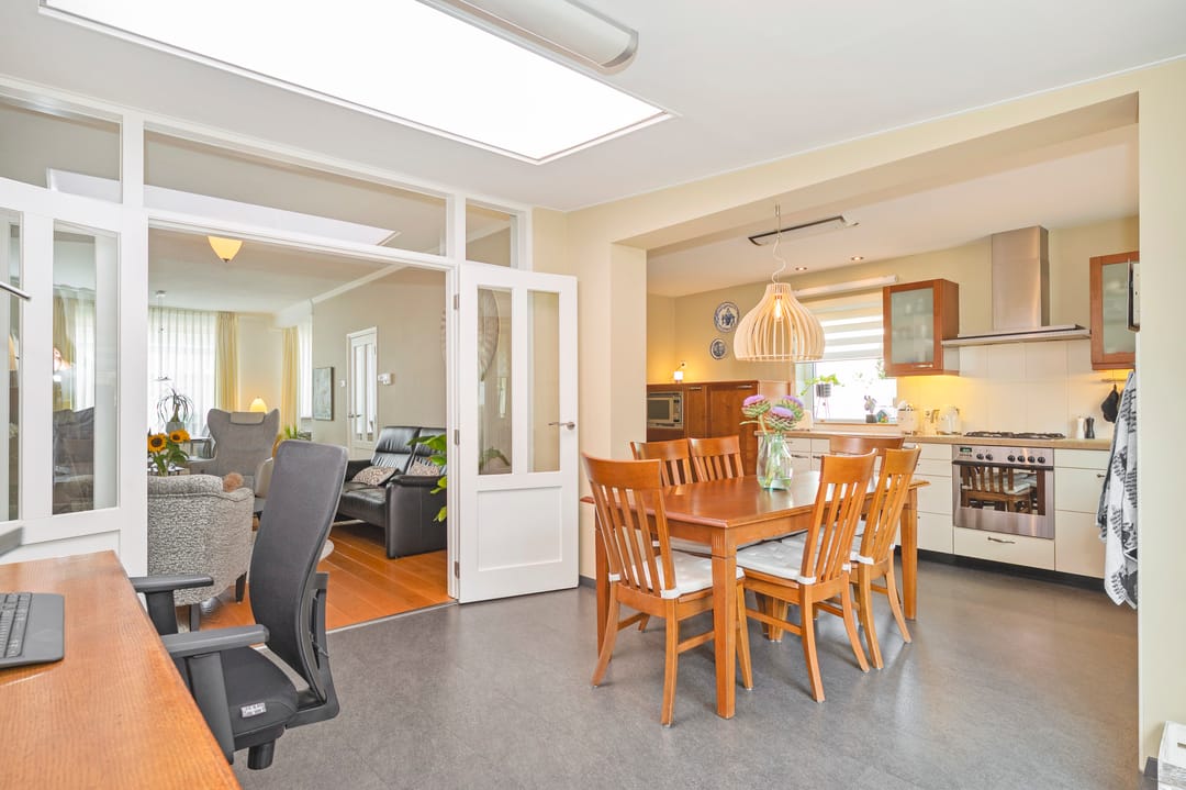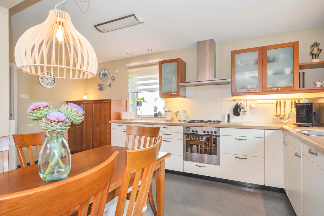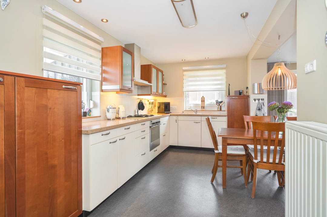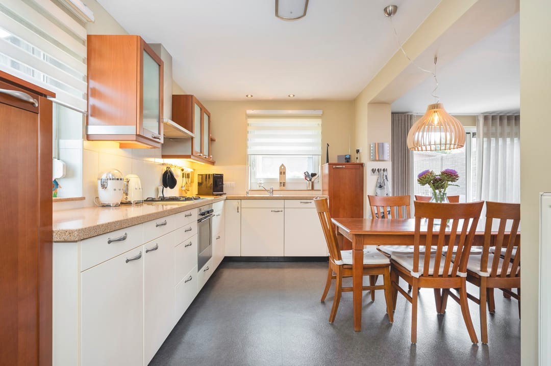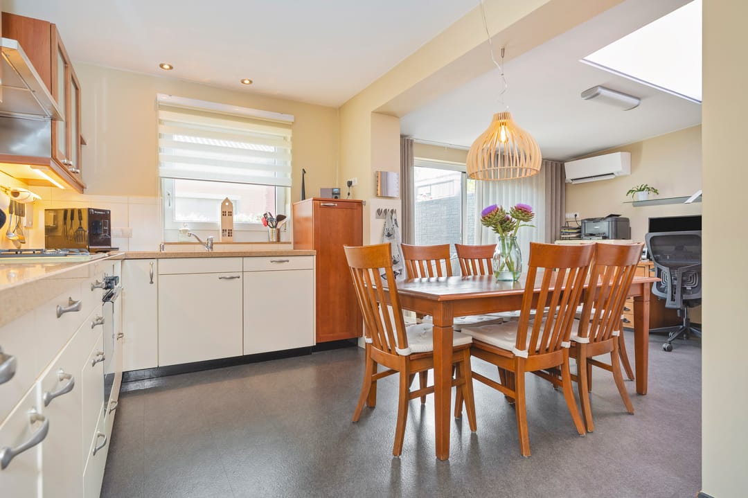 meterkast (10 groepen en 3 aardlekschakelaar(s). Vanuit de hal kom je in de gezellige L-vormige woonkamer met eiken parketvloer, stucwerk wanden en stucwerk plafond. Via een andere deur in de hal kom je in de goed uitgeruste en ruime leefkeuken met met airco unit, openslaande deur naar de tuin, pvc vloer, lichtkoepel en stucwerk wanden. De aanbouwkeuken in hoek-opstelling heeft een composiet werkblad en A merk gaskookplaat, rvs afzuigkap, koelkast, vrieskast (3 laden), vaatwasser, elektrische oven en magnetron. Het spanplafond in het open keukengedeelte heeft inbouwspots.