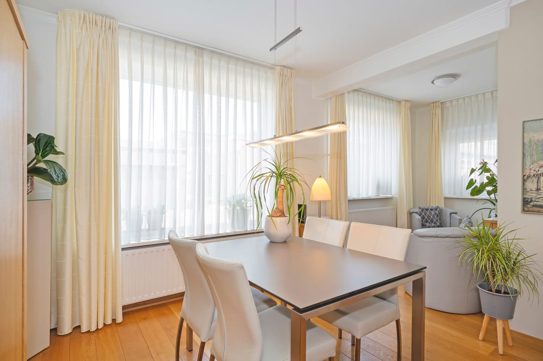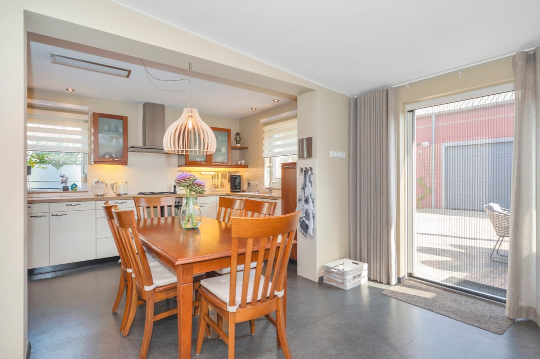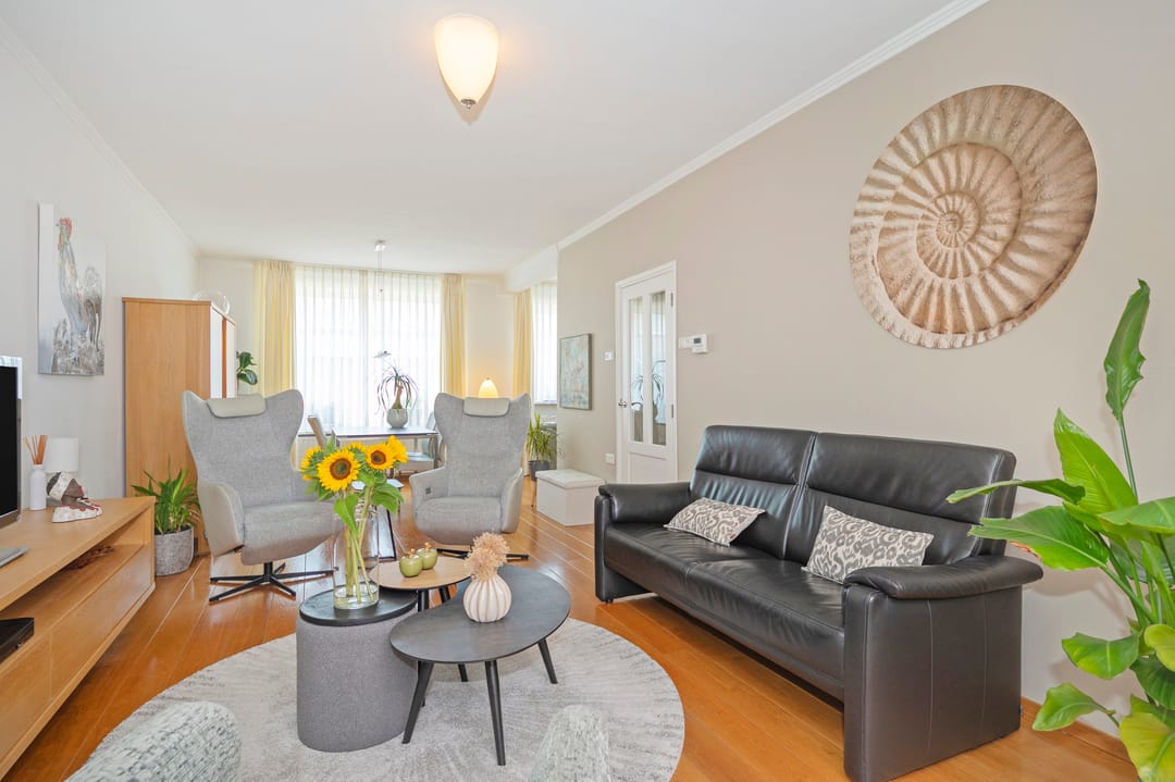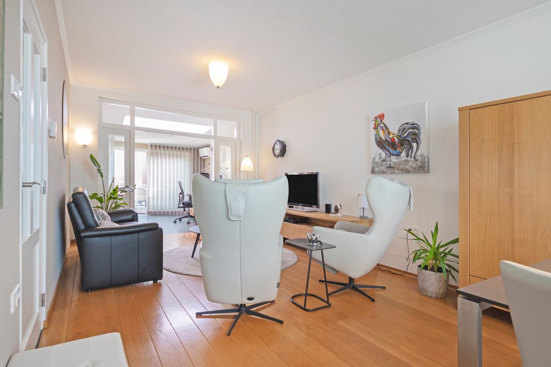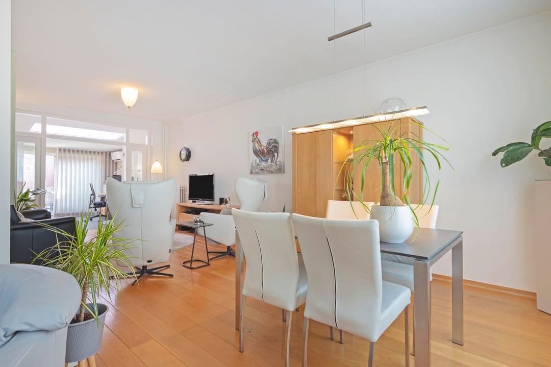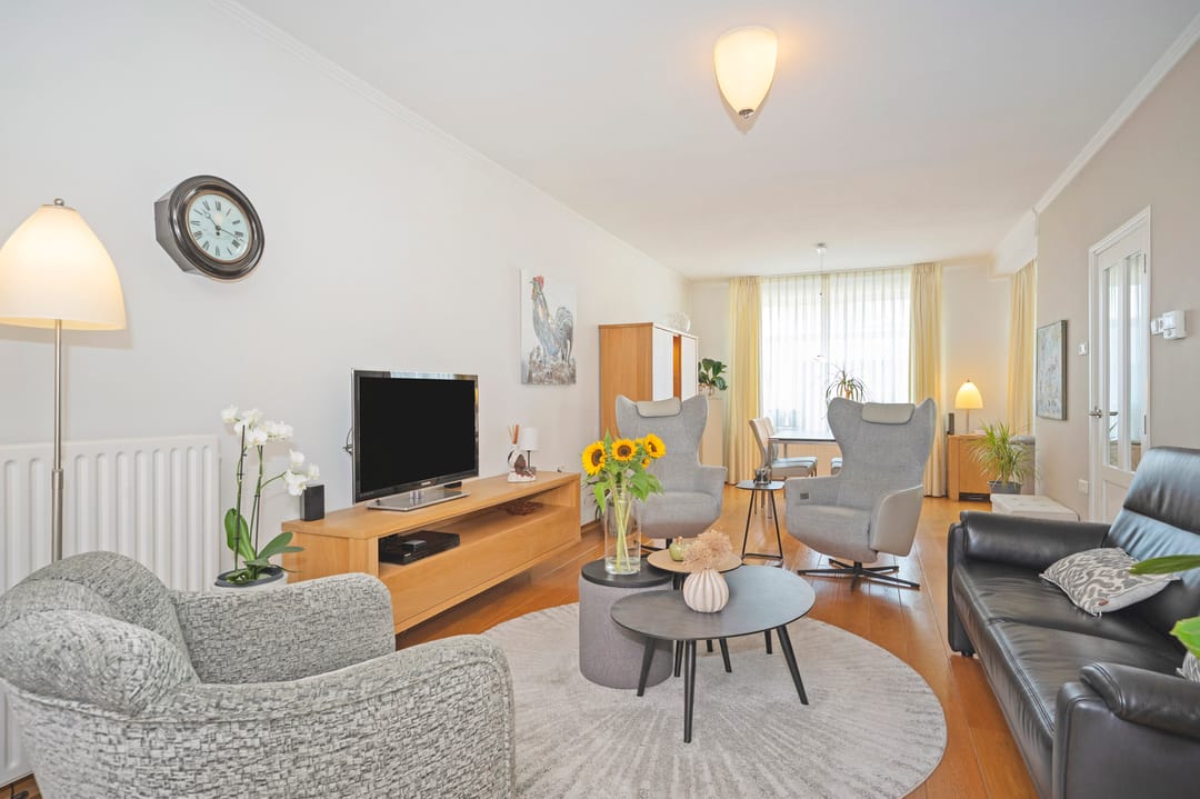 meterkast (10 groepen en 3 aardlekschakelaar(s). Vanuit de hal kom je in de gezellige L-vormige woonkamer met eiken parketvloer, stucwerk wanden en stucwerk plafond. Via een andere deur in de hal kom je in de goed uitgeruste en ruime leefkeuken met met airco unit, openslaande deur naar de tuin, pvc vloer, lichtkoepel en stucwerk wanden. De aanbouwkeuken in hoek-opstelling heeft een composiet werkblad en A merk gaskookplaat, rvs afzuigkap, koelkast, vrieskast (3 laden), vaatwasser, elektrische oven en magnetron. Het spanplafond in het open keukengedeelte heeft inbouwspots.