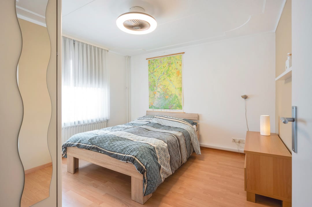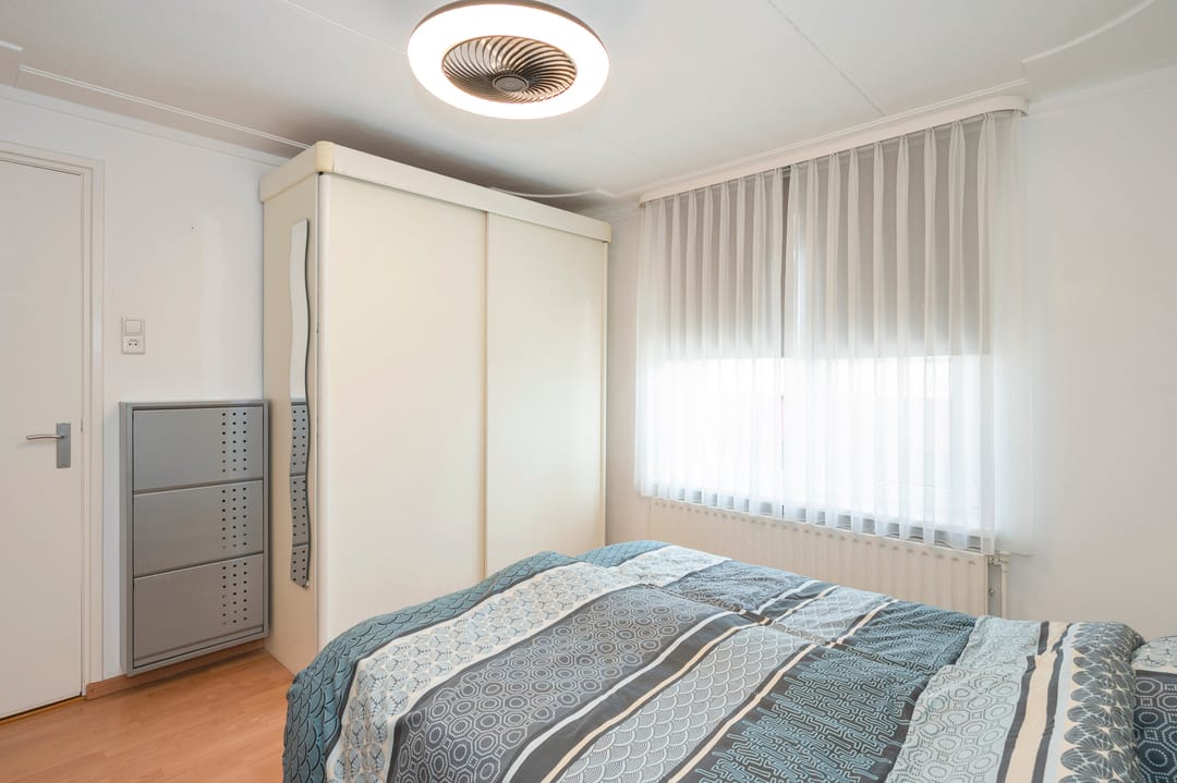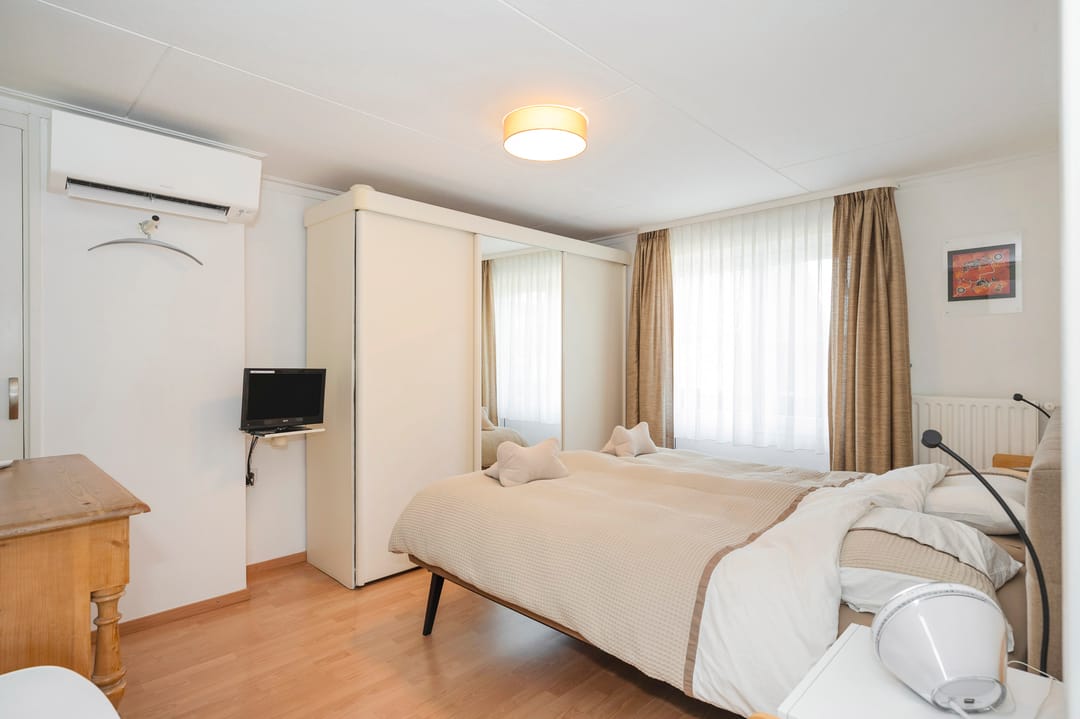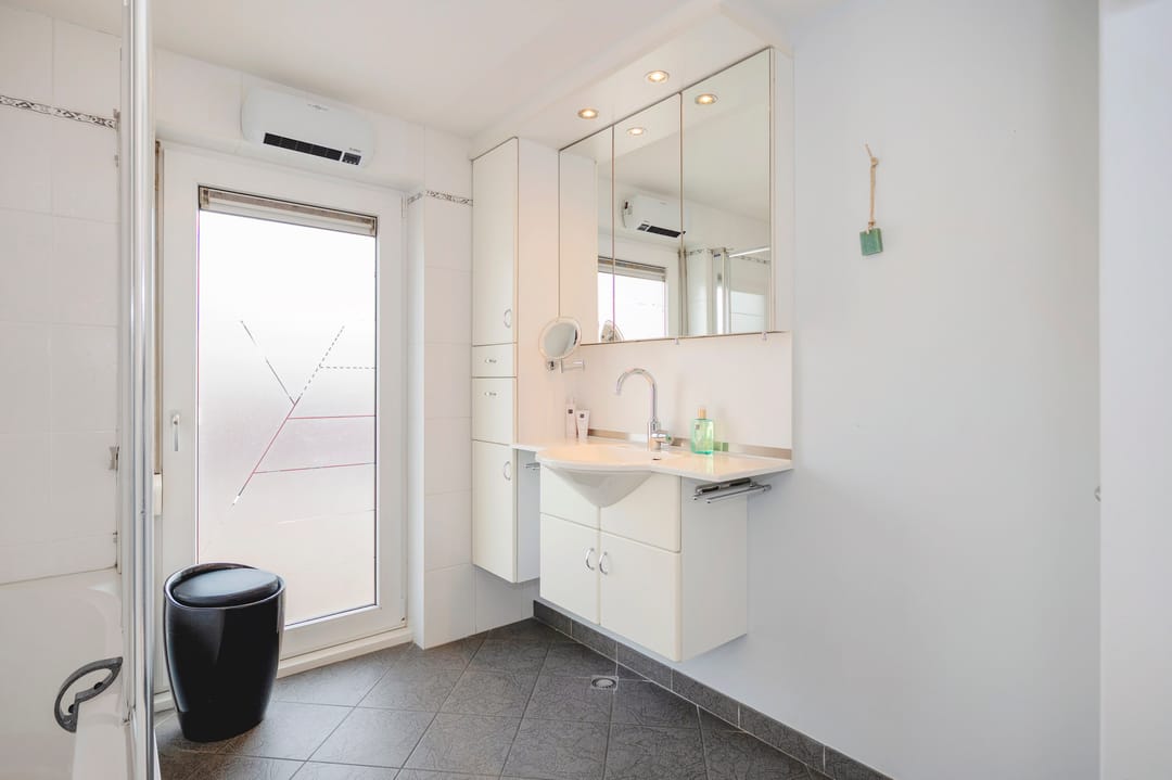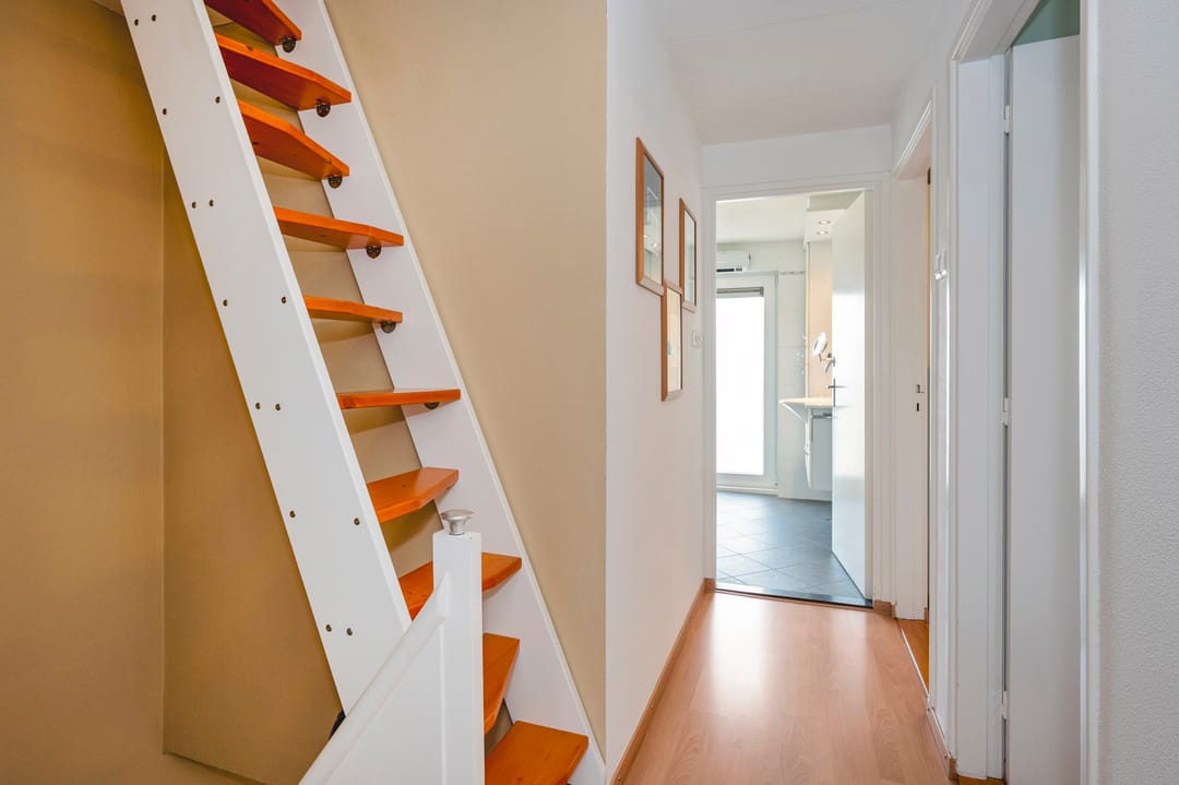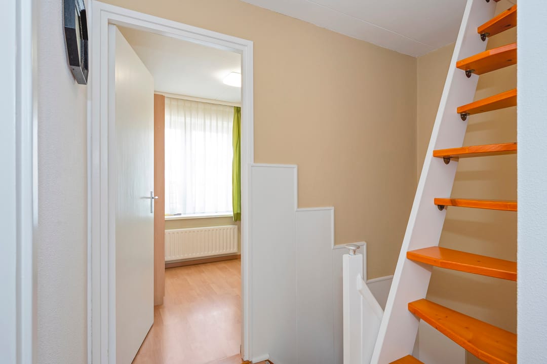 • Via de originele houten trap kom je vanuit de hal op de 1e verdieping. De overloop en de 3 slaapkamers zijn voorzien van een laminaatvloer. De grootste slaapkamer is voorzien van een airco unit. De geheel betegelde badkamer met spanplafond heeft inbouwspots en een opbouwarmatuur. Er is een speciaal gevormd ligbad met separate douchegedeelte (scheidingswand), een wandmeubel met vaste wasbak en een vrijhangend toilet. De wasmachine en wasdroger vinden een ergonomische plaats op een verhoging in een hoek van de badkamer, met daaronder 2 ruime lades.