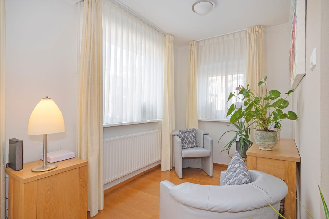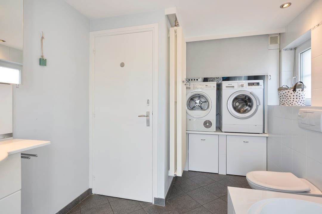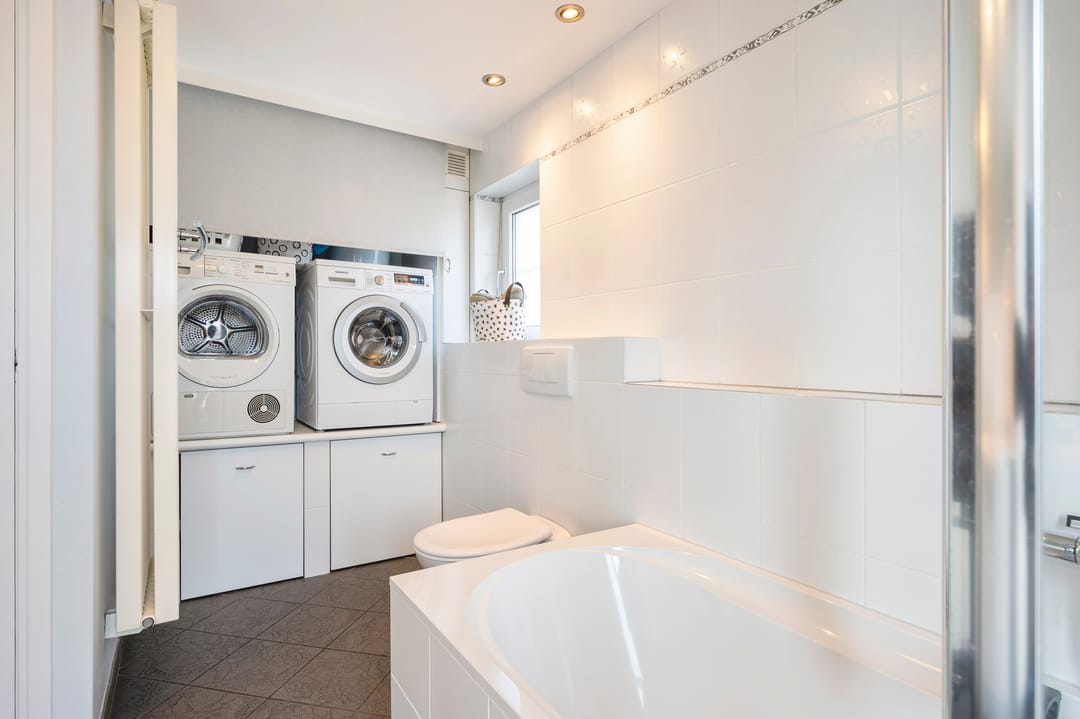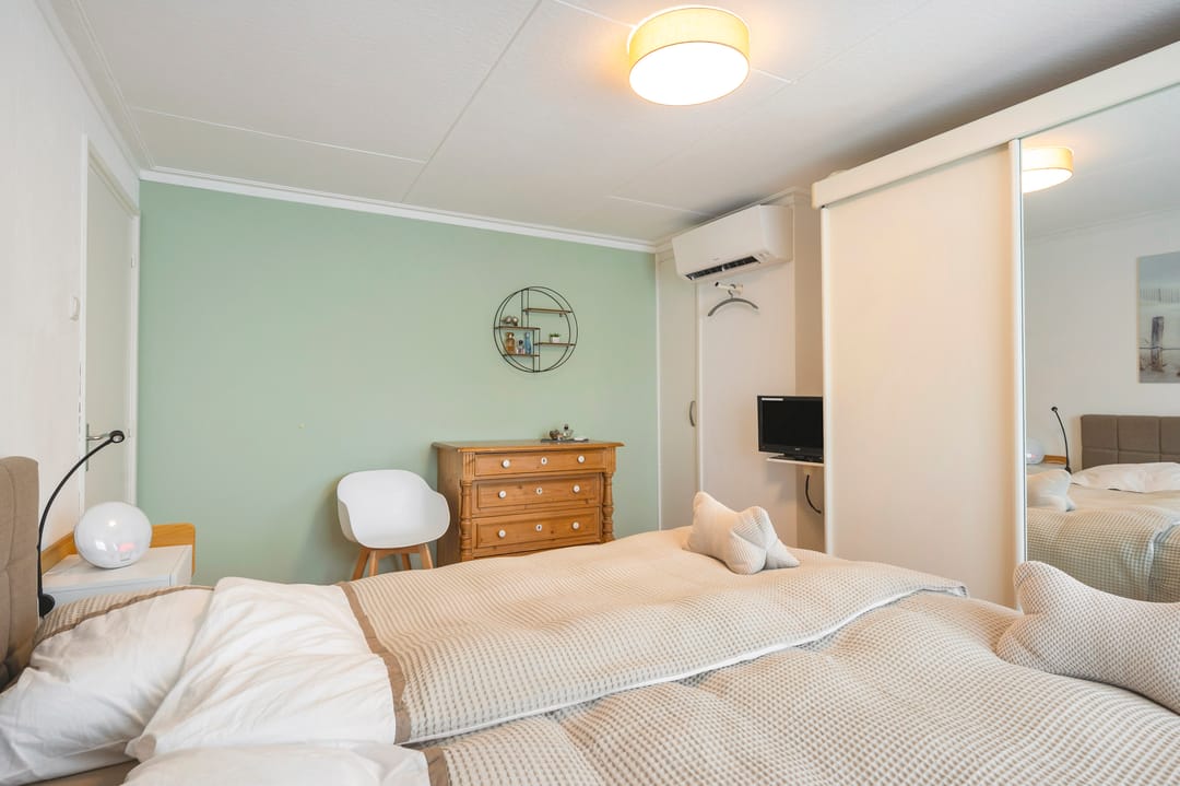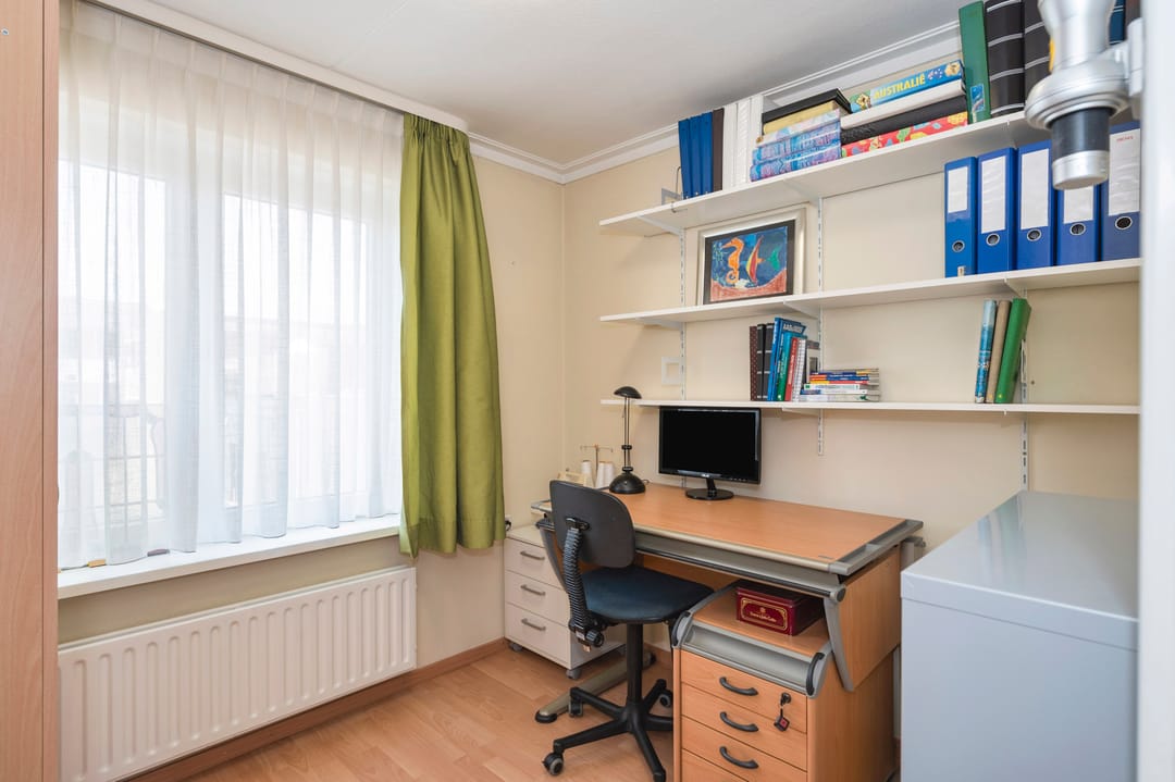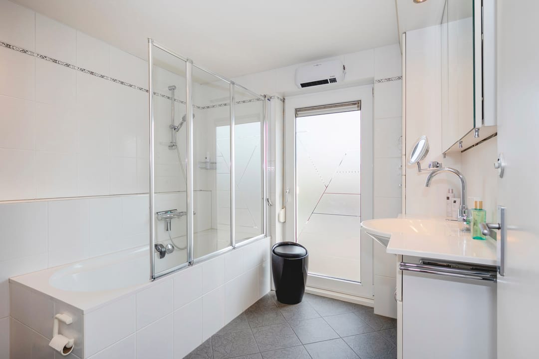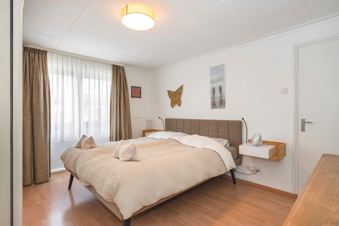 • Via de originele houten trap kom je vanuit de hal op de 1e verdieping. De overloop en de 3 slaapkamers zijn voorzien van een laminaatvloer. De grootste slaapkamer is voorzien van een airco unit. De geheel betegelde badkamer met spanplafond heeft inbouwspots en een opbouwarmatuur. Er is een speciaal gevormd ligbad met separate douchegedeelte (scheidingswand), een wandmeubel met vaste wasbak en een vrijhangend toilet. De wasmachine en wasdroger vinden een ergonomische plaats op een verhoging in een hoek van de badkamer, met daaronder 2 ruime lades.