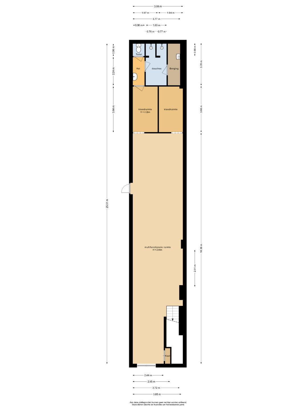 Via de entree met meterkast betreedt u het pand, waarna een centrale hal toegang biedt tot de diverse ruimten. De bedrijfsruimte beschikt over een langgerekte multifunctionele hoofdruimte van circa 3,85 x 22,51 meter.