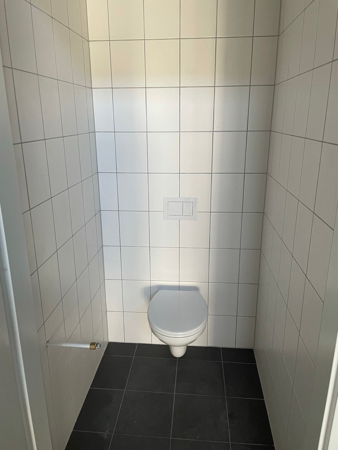 - Toilet met fonteintje en voorzien van vloertegels en wanden tot plafond betegeld;