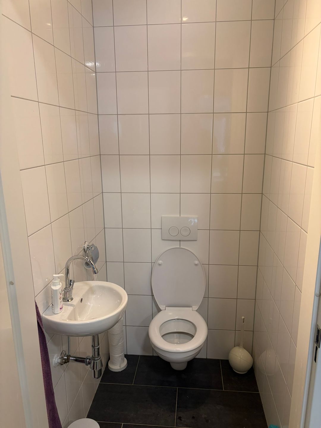 - Toilet met fonteintje en voorzien van vloertegels en wanden tot plafond betegeld;