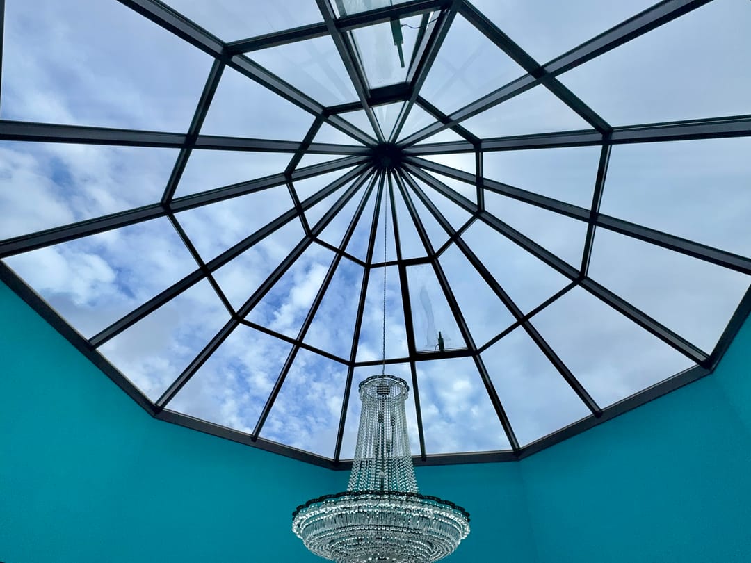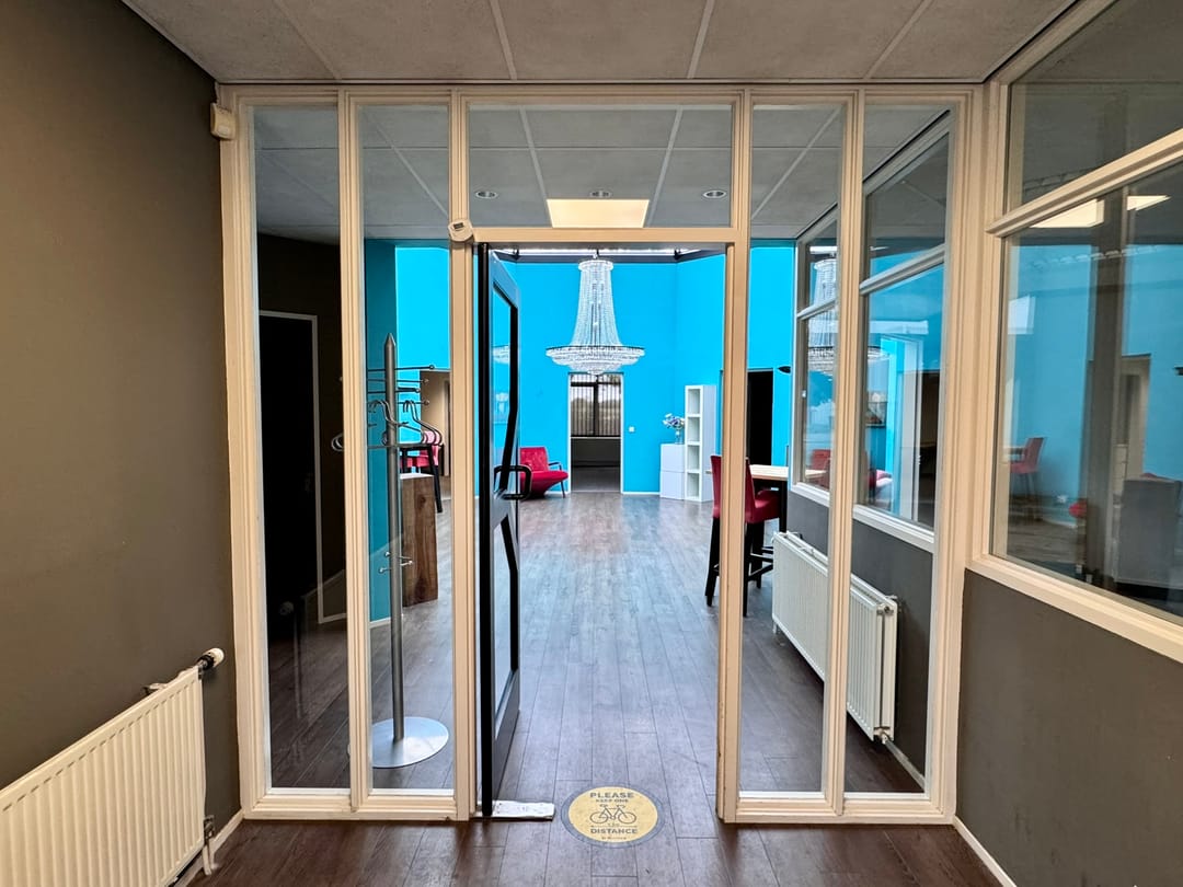 Entree/vestibule met meterkast, karakteristieke achthoekige centrale hal, showroom of ontvangstruimte met het fraaie glazen tentdak met daaromheen meerdere, thans onderling verbonden kantoor-, werk, -demo of showruimten, gang, 2 toiletten, kantine v.v. pantry met aansluitend tuinkamer/kantoor, een multifunctionele vergaderruimte, CV-ruimte, bergingen/magazijn en een mooie werkplaats v.v. roldeur.