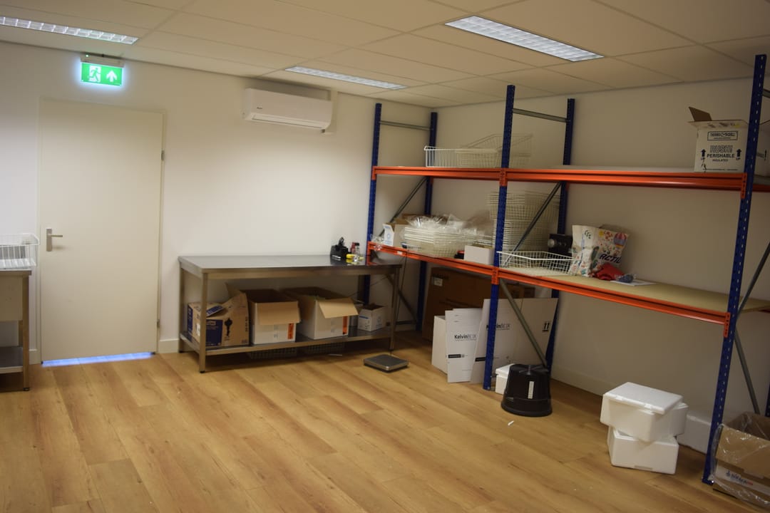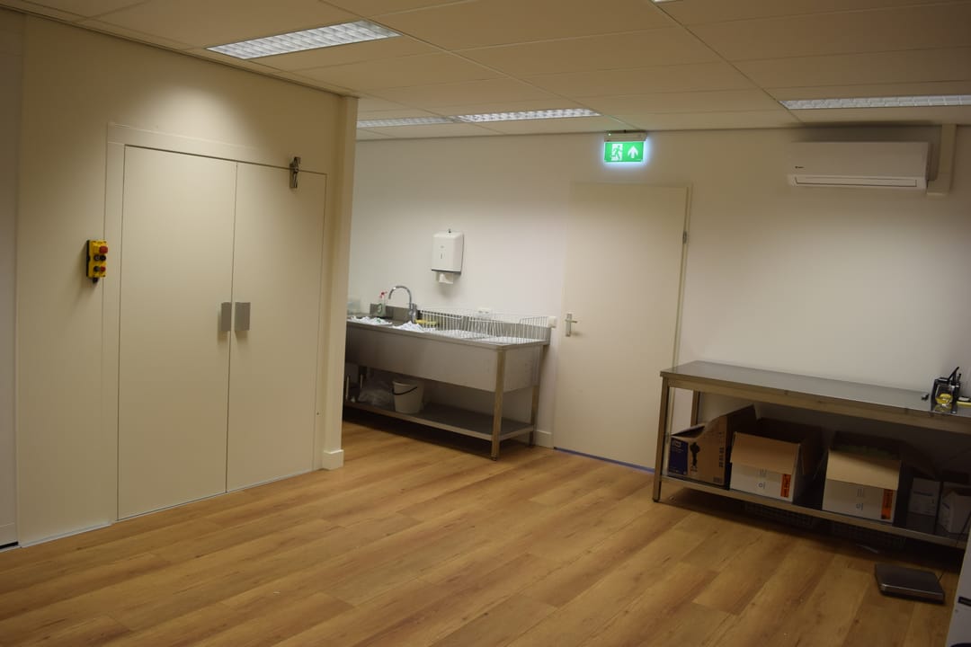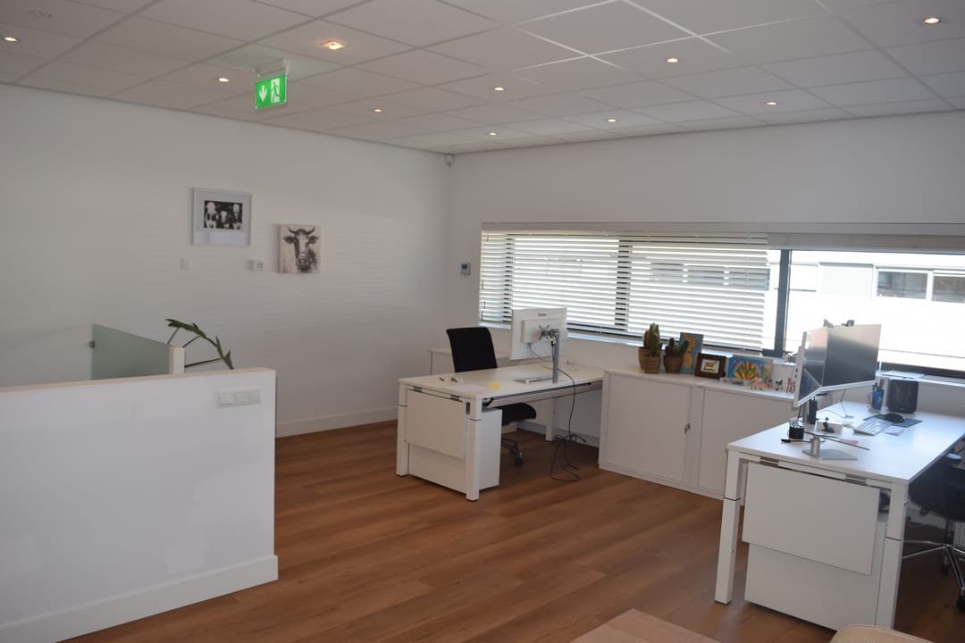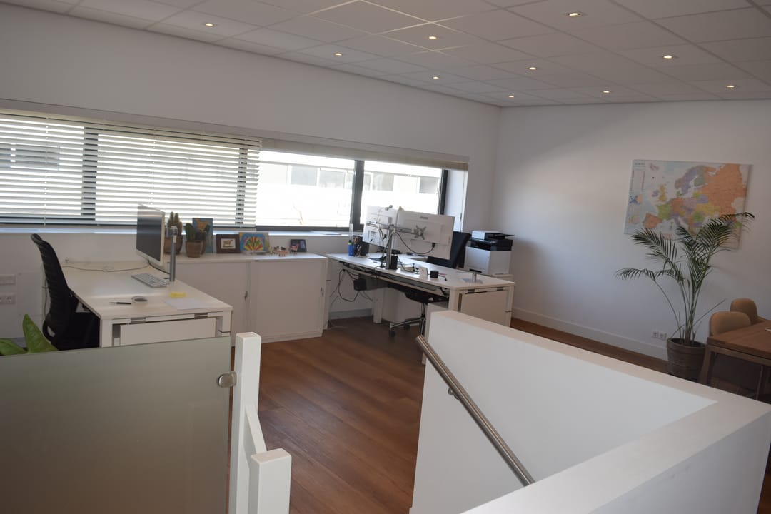 Open kantoorruimte ca. 42,5m2 voorzien van laminaat vloerafwerking, inbouwspots en open keukenruimte met koel/vriescombinatie, vaatwasser en close-in boiler. Werk-/opslag-/archiefruimte ca. 52,5m2 voorzien van airconditioning.