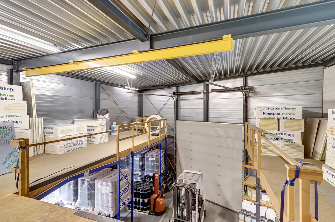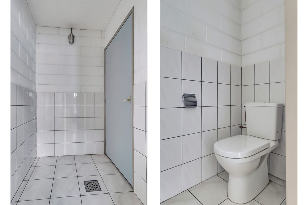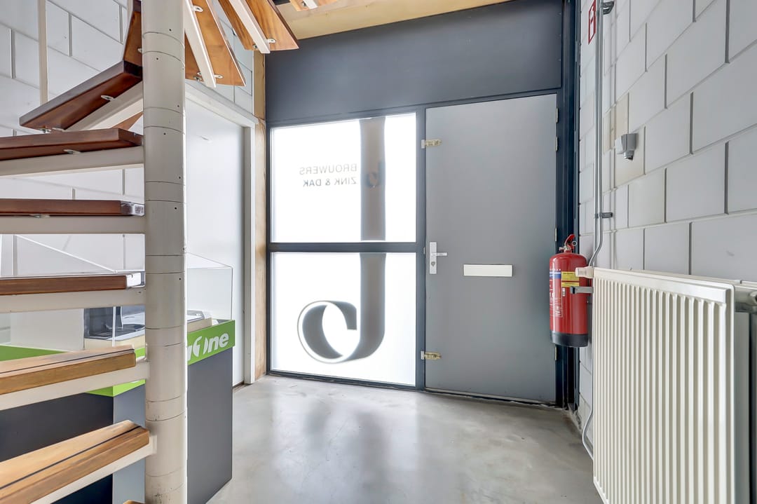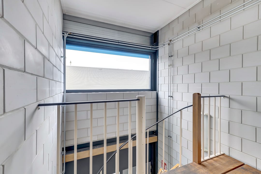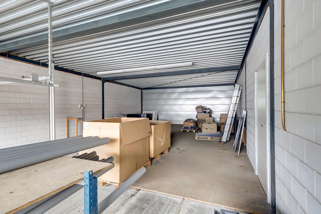 Verder op de begane grond de hal met toegang tot de verdieping, toiletruimte en een afgesloten magazijnruimte van ca. 62m². Ook deze ruimtes zijn praktisch en robuust afgewerkt. De aanwezige overheaddeuren en loopdeuren zorgen voor een efficiënte goederenstroom en optimale toegankelijkheid voor uw bedrijfsvoering.