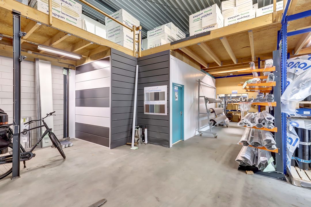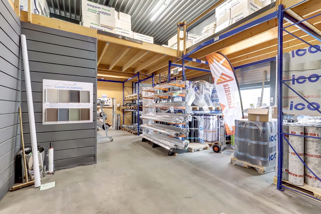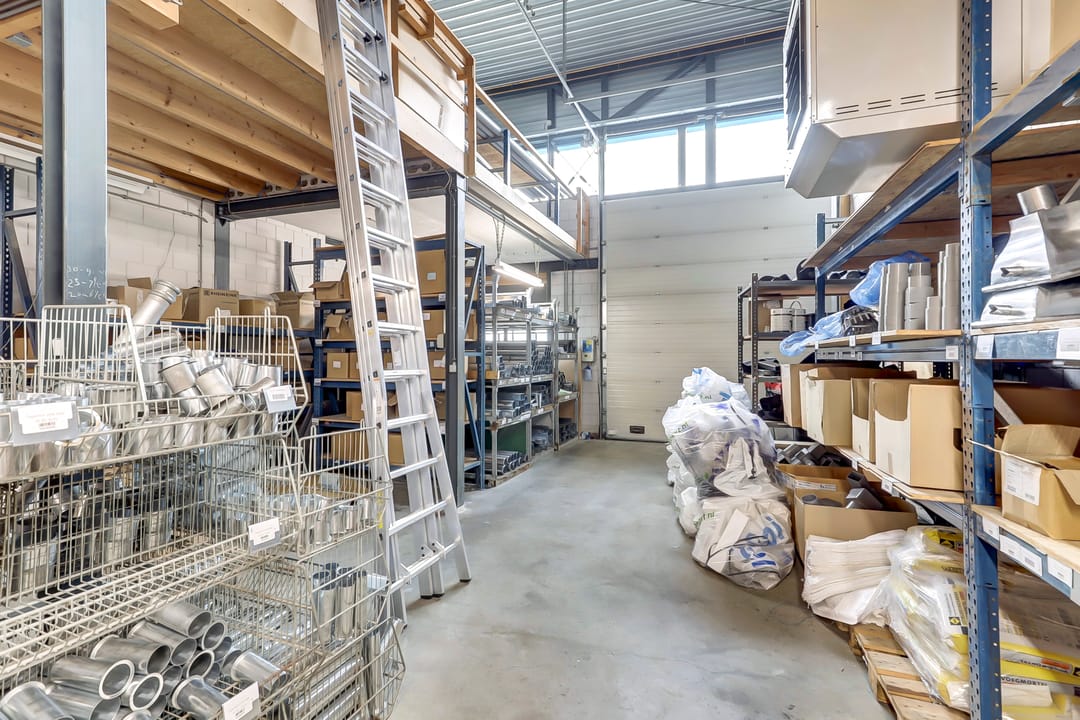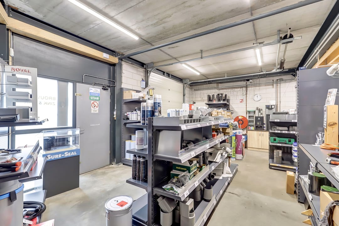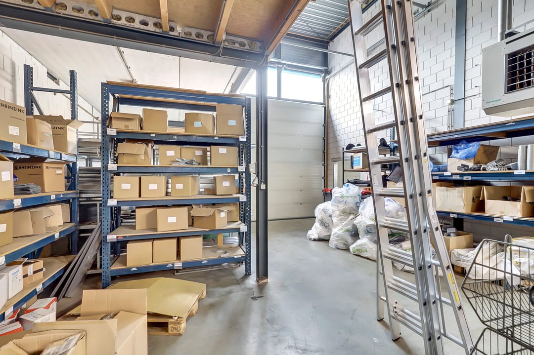 De eerste verdieping biedt extra ruimte en flexibiliteit met meerdere magazijnruimtes met een totaal oppervlak van ca. 270m², ideaal voor aanvullende opslag of ondersteunende werkzaamheden. Deze verdieping is deels open, waardoor er een visuele en functionele verbinding bestaat met de onderliggende werkruimte. De magazijnruimtes zijn voorzien van een degelijk afgewerkte vloer en strakke wanden, wat bijdraagt aan een nette en functionele uitstraling.