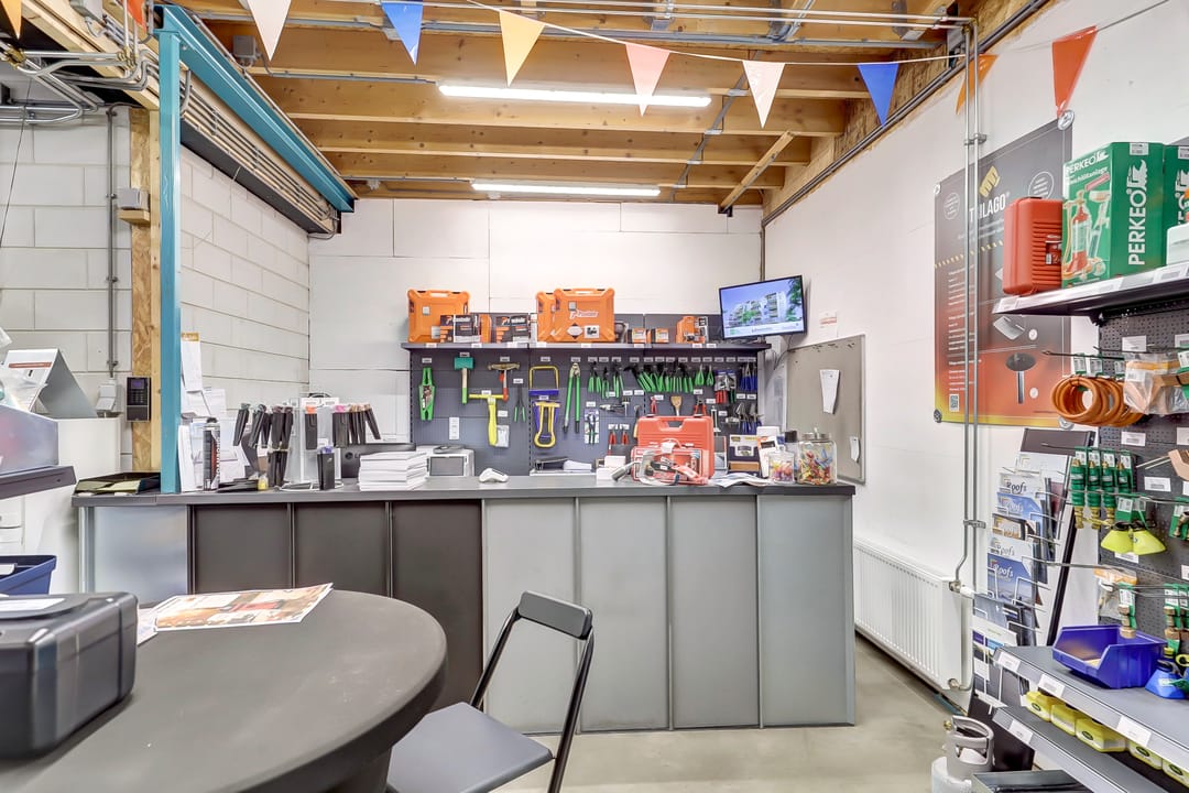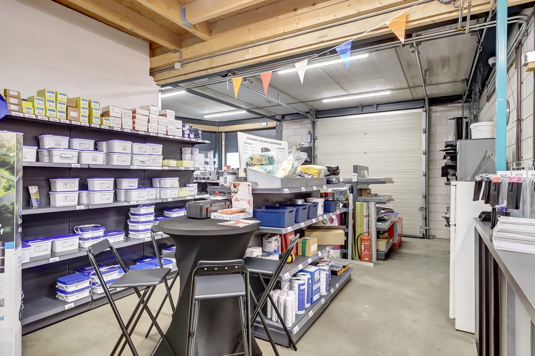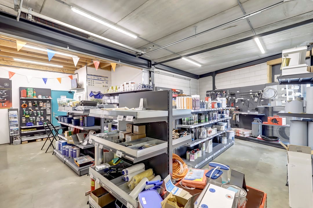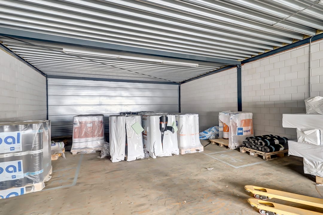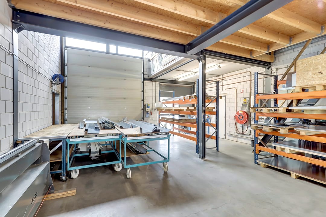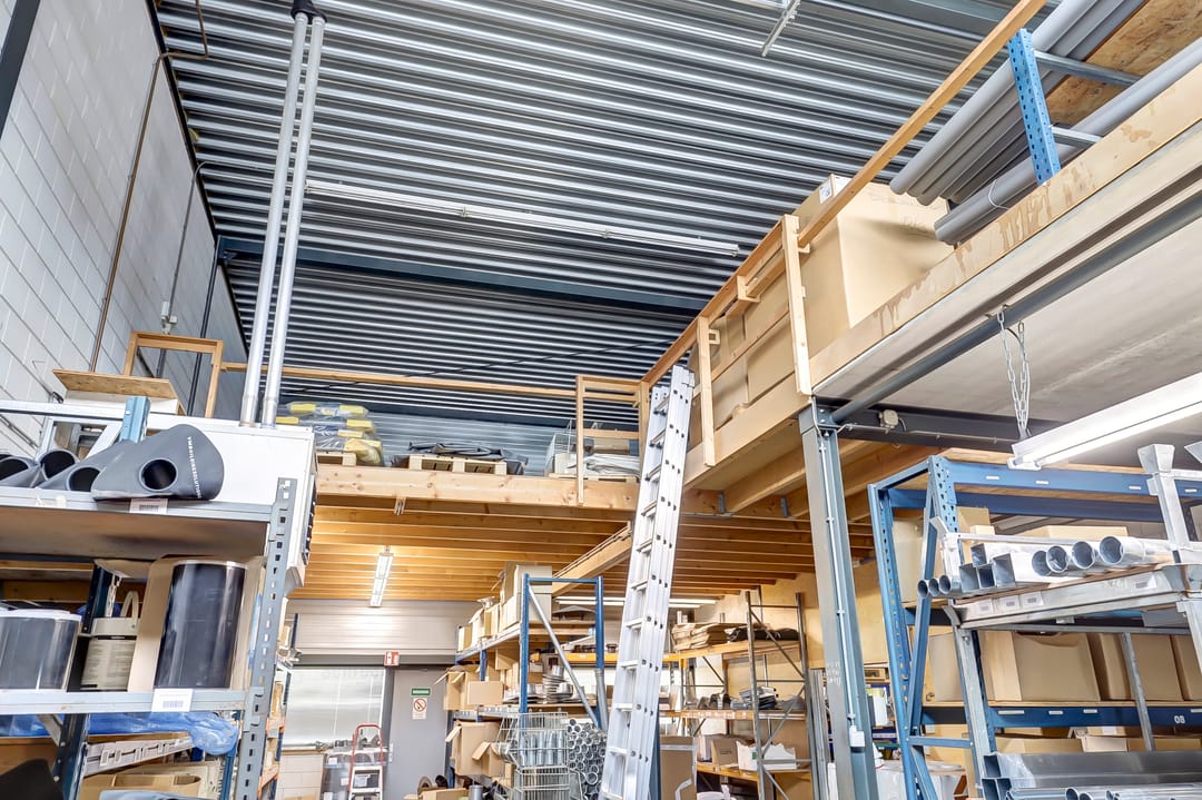 De eerste verdieping biedt extra ruimte en flexibiliteit met meerdere magazijnruimtes met een totaal oppervlak van ca. 270m², ideaal voor aanvullende opslag of ondersteunende werkzaamheden. Deze verdieping is deels open, waardoor er een visuele en functionele verbinding bestaat met de onderliggende werkruimte. De magazijnruimtes zijn voorzien van een degelijk afgewerkte vloer en strakke wanden, wat bijdraagt aan een nette en functionele uitstraling.