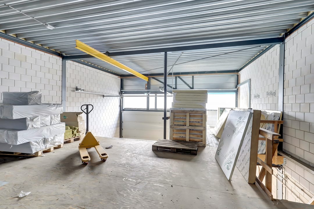 - Lichtstraten, overheaddeuren, betonvloer, heater, toilet, pantry en te openen ramen