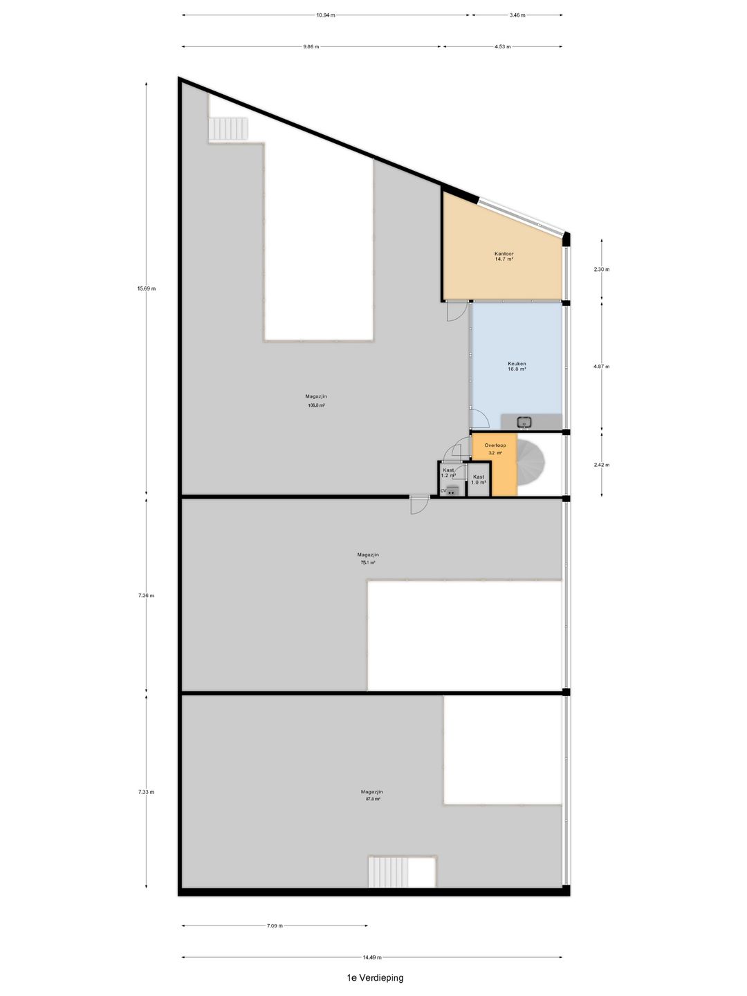 De totale oppervlakte is ca. 690m², verdeeld over twee werkplaatsen (ca. 210m² en 105m²) en magazijnruimte (ca. 62m²) op de begane grond en drie magazijnruimtes (ca. 107m², 88m² en 75m²), kantoorruimte (ca. 15m²) en pantry (ca. 17m²) op de verdieping.
