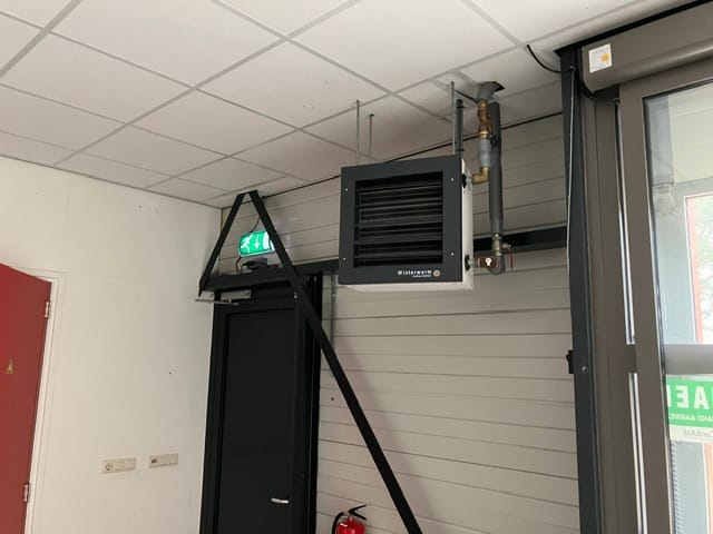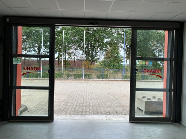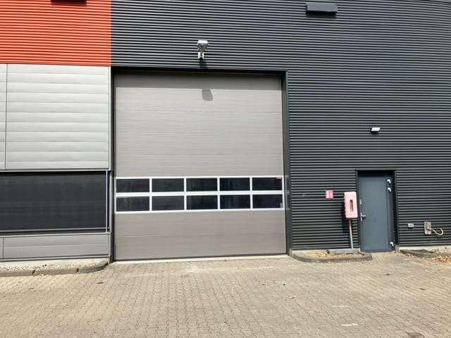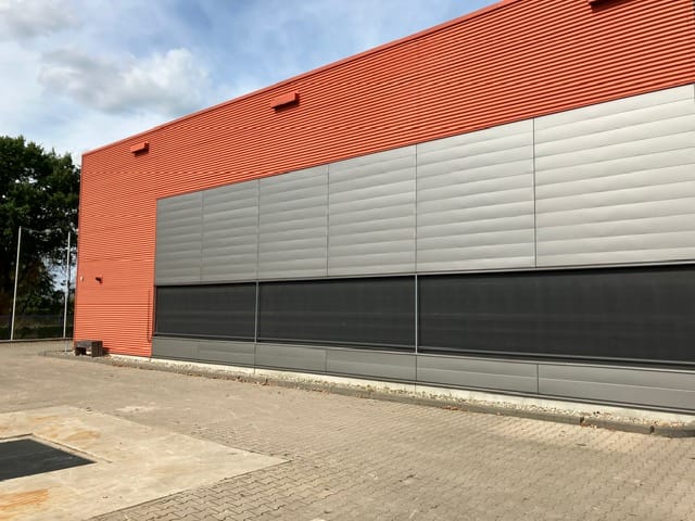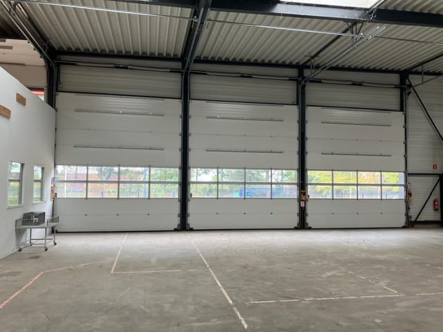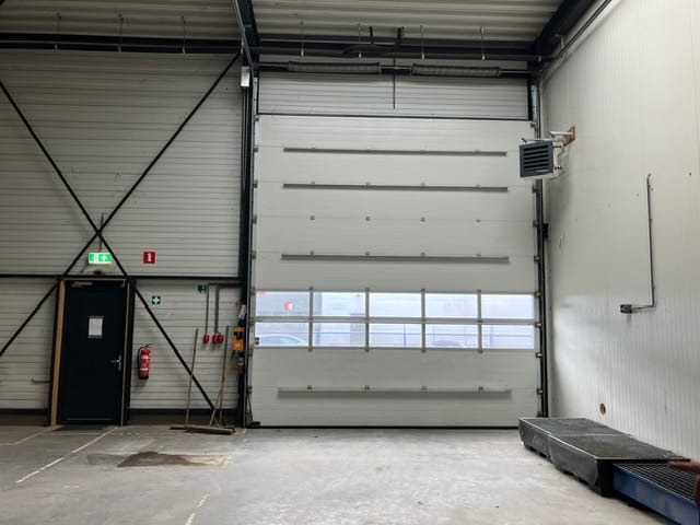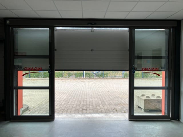 De linker overheaddeur, gezien af wegzijde, is voorzien van een automatische schuifdeur om de warmte beter binnen te houden.