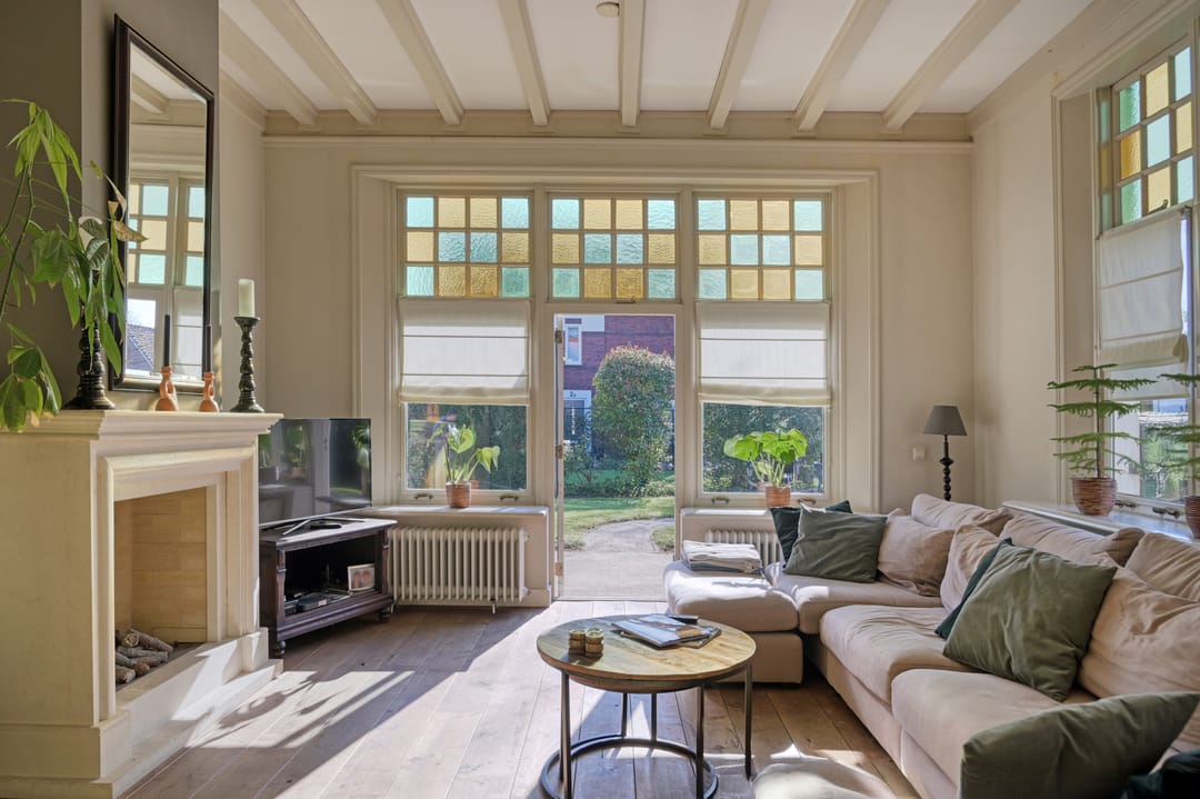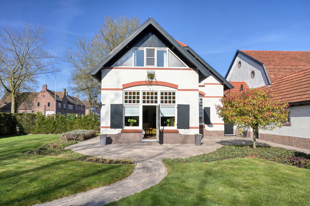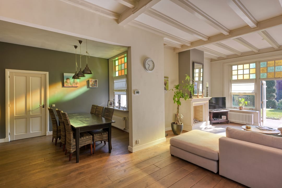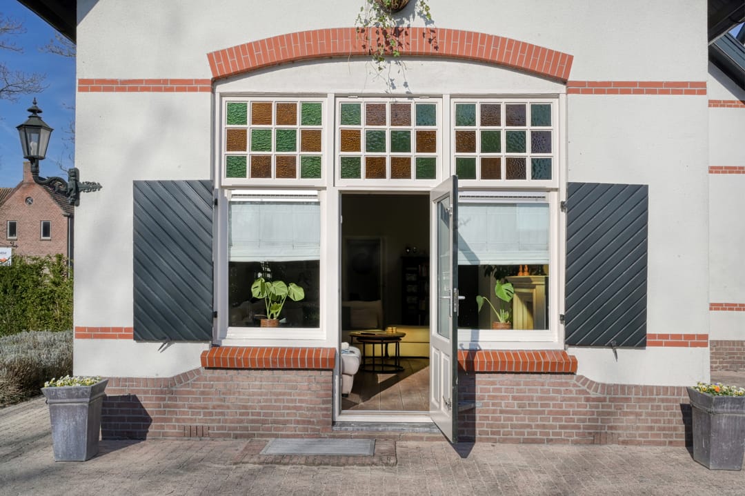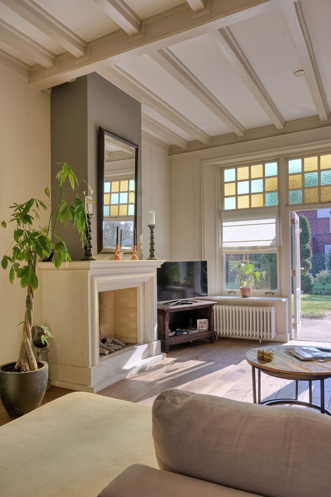 De charme van dit huis komt niet alleen naar voren in de uitstraling van het exterieur, maar ook in het interieur, waar originele elementen behouden zijn. Denk hierbij aan de oude plavuizen in de gang, het warme licht dat door de glas-in-loodramen valt, en de robuuste eiken gebinten die bijdragen aan de sfeer. Het huis werd in 1914 gebouwd als een statig pand en is sindsdien door de jaren heen gerenoveerd, met behoud van zijn karakter.
