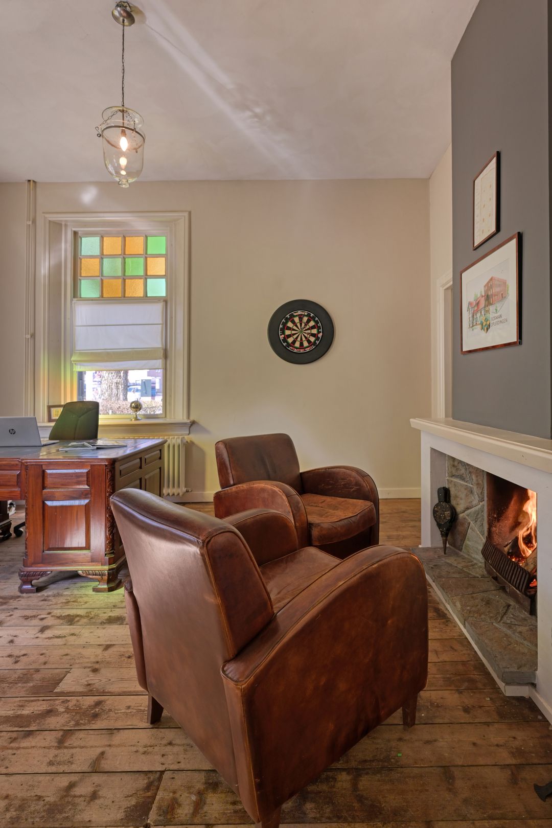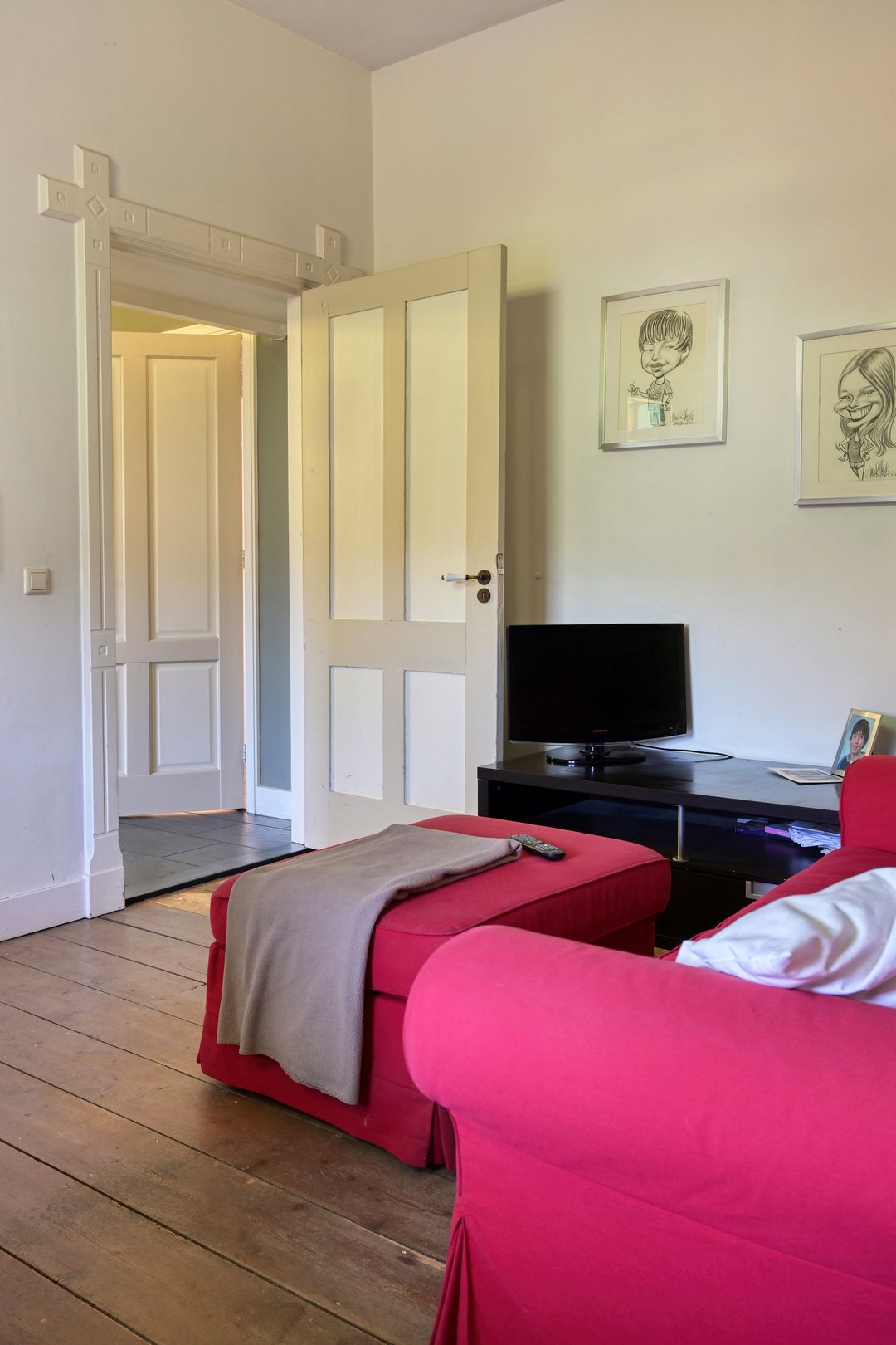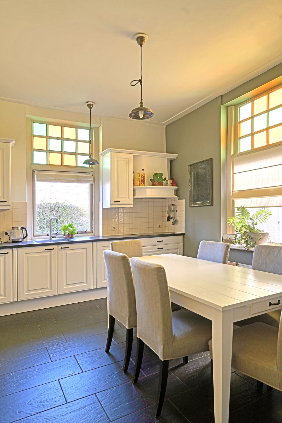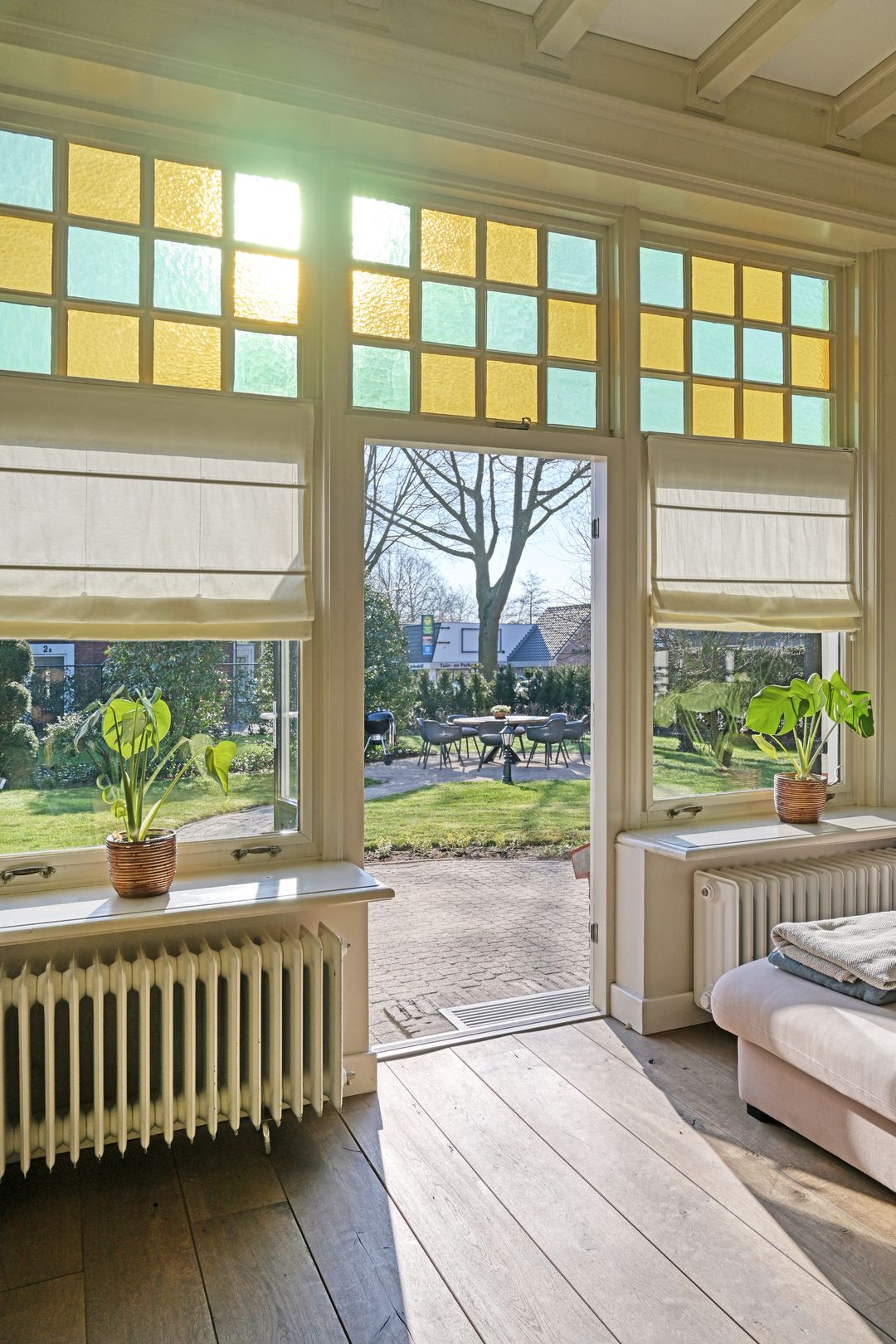 De charme van dit huis komt niet alleen naar voren in de uitstraling van het exterieur, maar ook in het interieur, waar originele elementen behouden zijn. Denk hierbij aan de oude plavuizen in de gang, het warme licht dat door de glas-in-loodramen valt, en de robuuste eiken gebinten die bijdragen aan de sfeer. Het huis werd in 1914 gebouwd als een statig pand en is sindsdien door de jaren heen gerenoveerd, met behoud van zijn karakter.