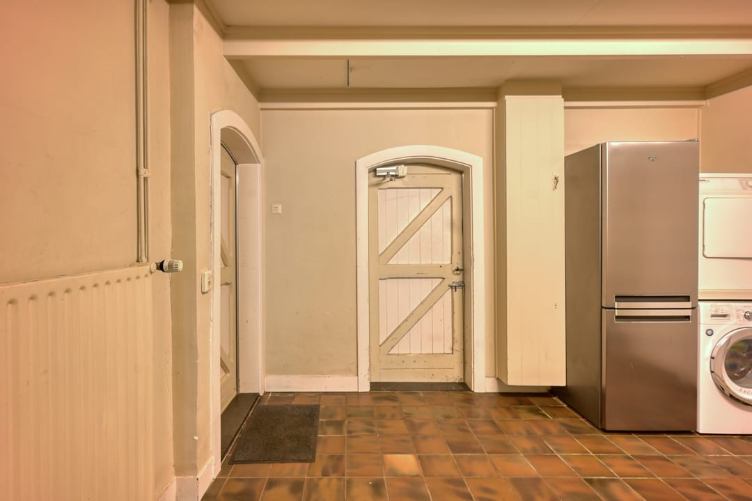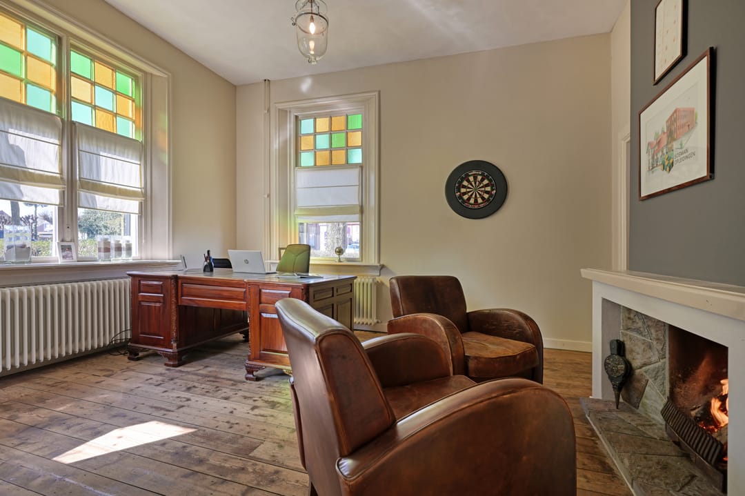 Aan de andere zijde van de hal bevindt zich een ruime studeerkamer met originele schouw en een houtgestookte open haard. De sfeervolle woonkeuken is voorzien van een landelijke keuken met inbouwapparatuur. Aangrenzend vindt u een gezellige TV- of chillkamer waar kinderen zich kunnen vermaken. Vroeger was dit de ouderslaapkamer.