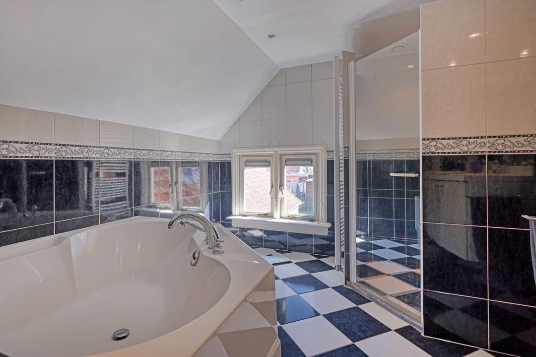 Op de overloop bevinden zich 3 ruime en 2 kleinere slaapkamers. De ruime badkamer is voorzien van een ligbad, inloopdouche, badmeubel met dubbele wastafels en een toilet. Er is een vaste trap naar de zolder.