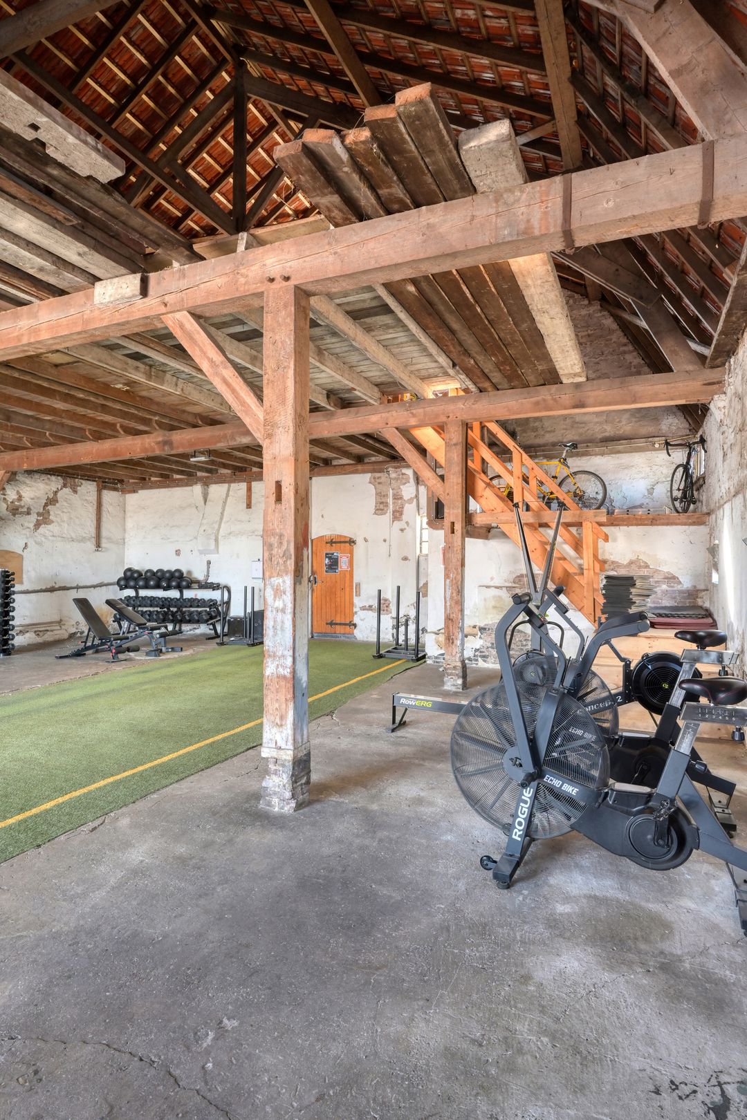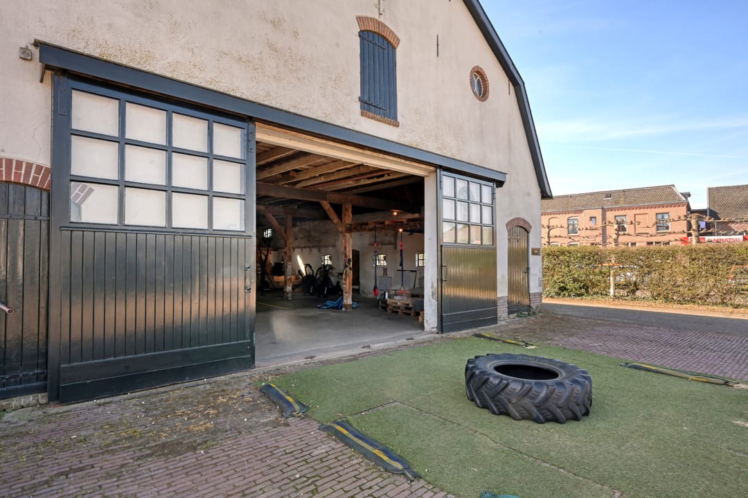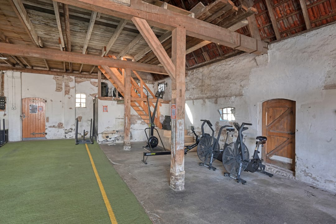 De deel is nu een fitnessruimte met een vaste trap naar de grote bevloerde zolder. De ruimte is geschikt te maken voor een woonfunctie, maar kan ook dienen voor het stallen van oldtimers of als atelier of opslagruimte.