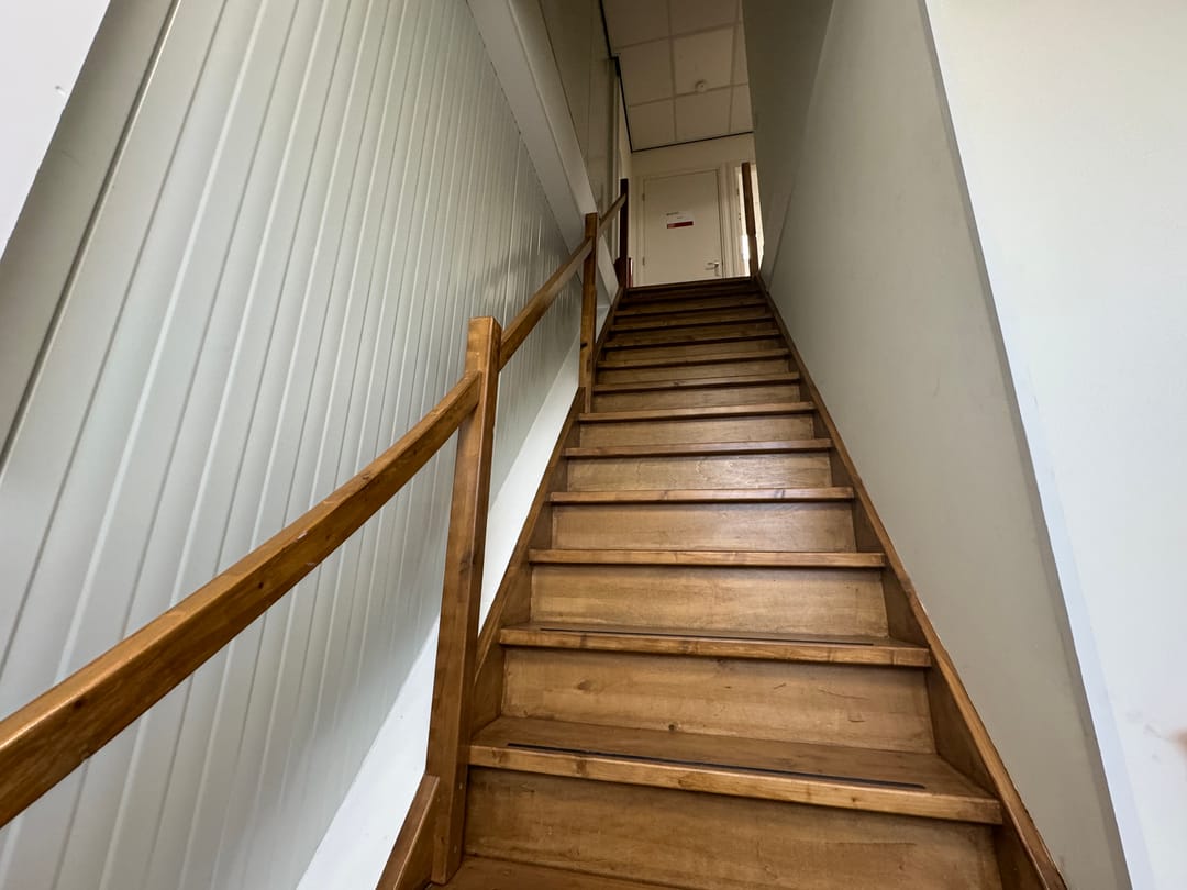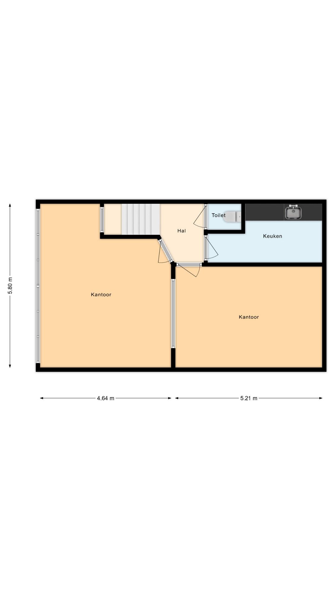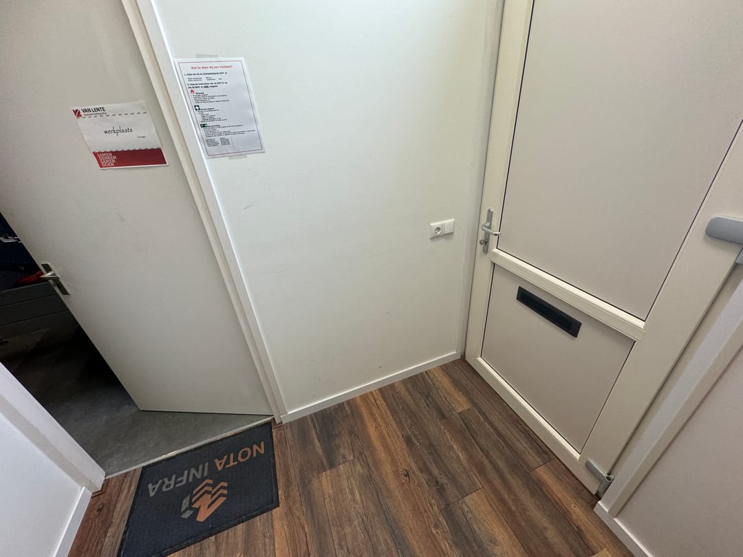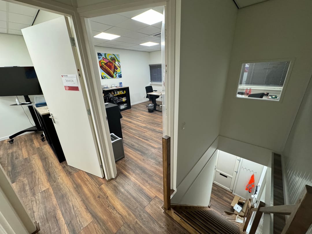 Entree met trapopgang naar verdieping en doorgang naar bedrijfsruimte met eigen overheaddeur. Op de verdieping bevinden zich twee kantoorruimtes, een pantry en een toilet.