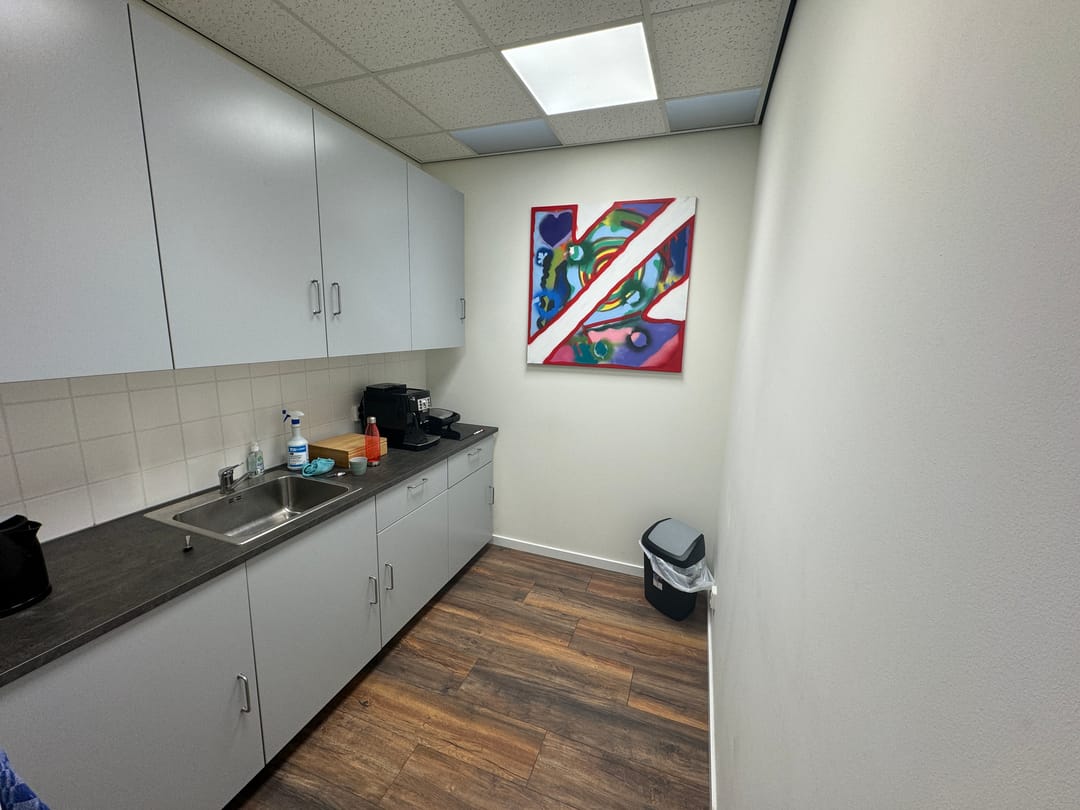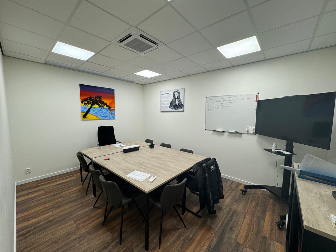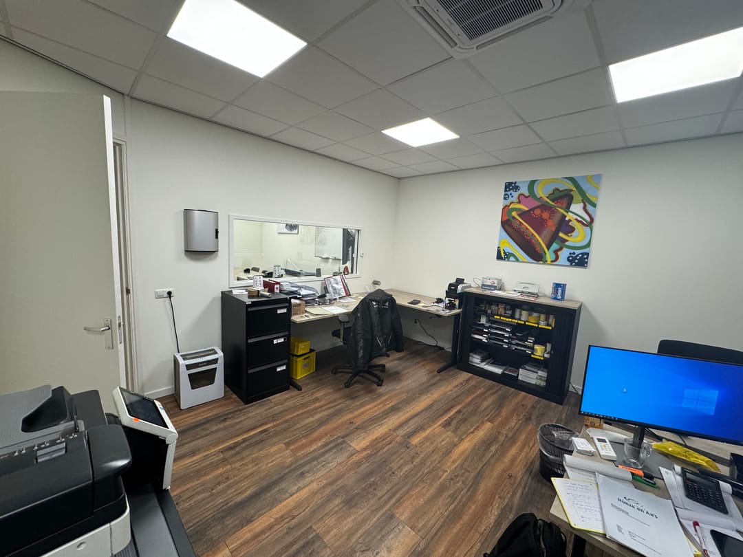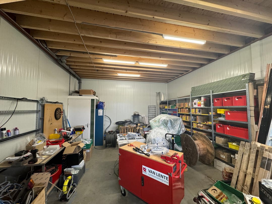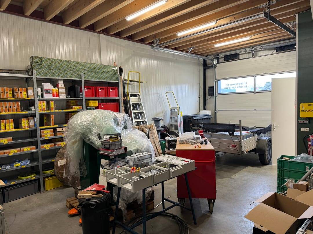 Overheaddeur, elektra, wateraansluiting, airco, systeemplafond bovenverdieping, keuken en twee toiletten.