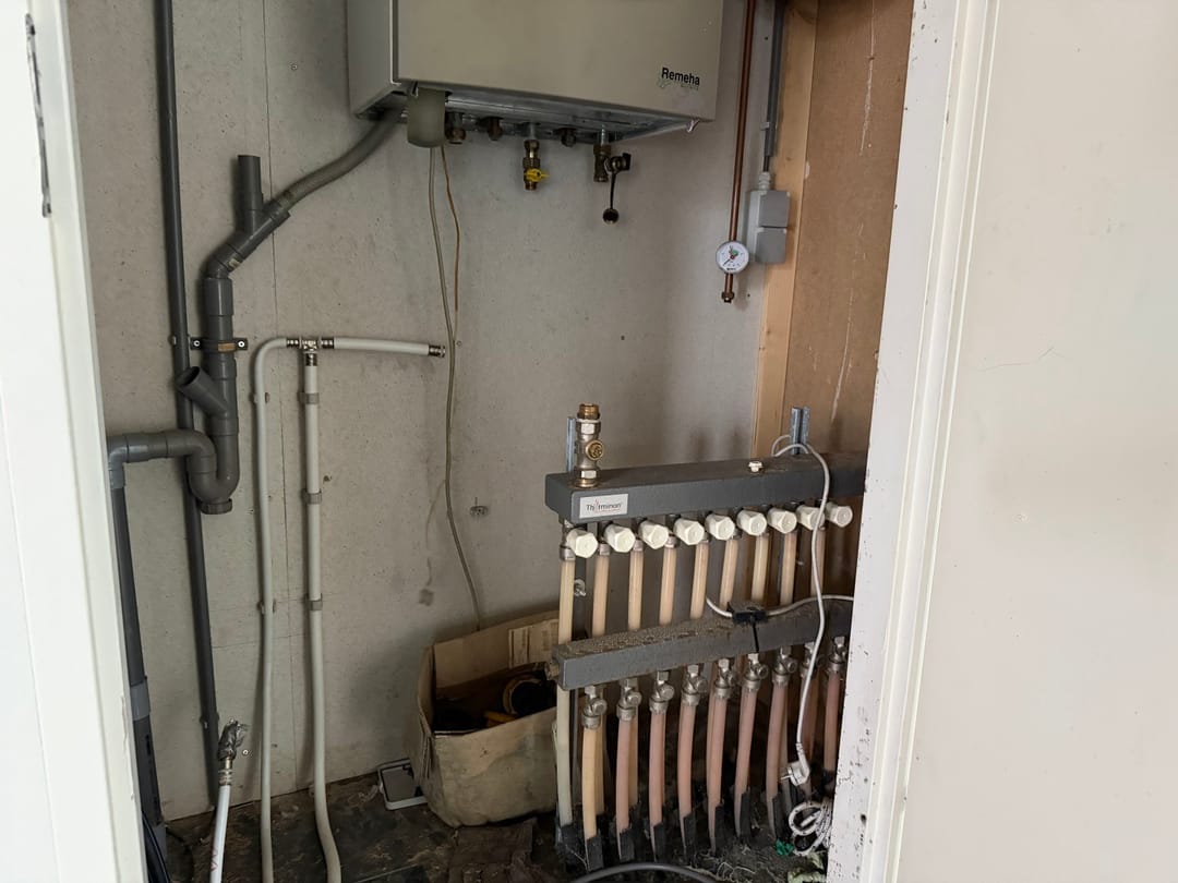 Op de begane grond zijn in de vloer (deels) buizen gelegd voor vloerverwarming.