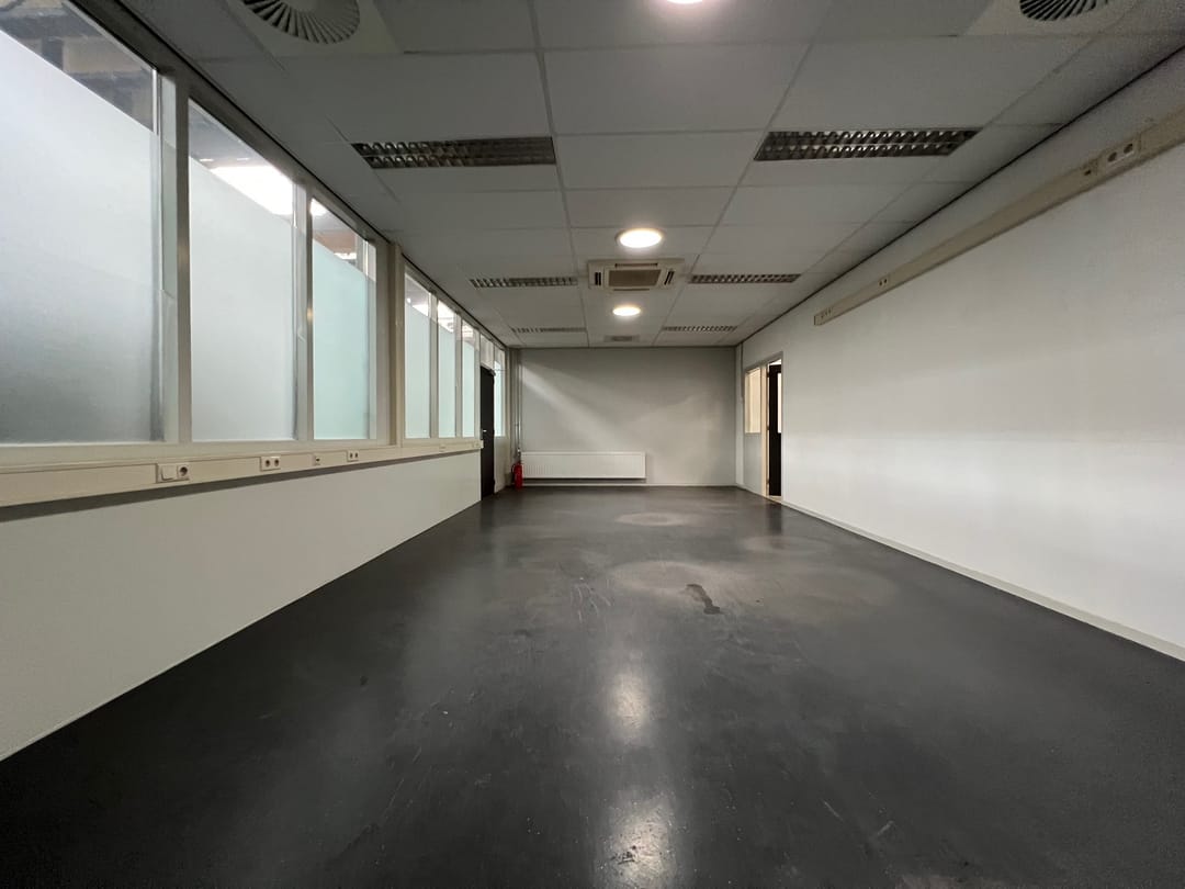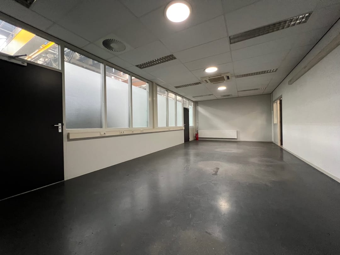 De inpandige kantoorruimte bevindt zich achterin de bedrijfsruimte en is o.a. voorzien van een systeemplafond met verlichtingsarmaturen, indirecte daglichttoetreding en verwarming door middel van radiatoren.