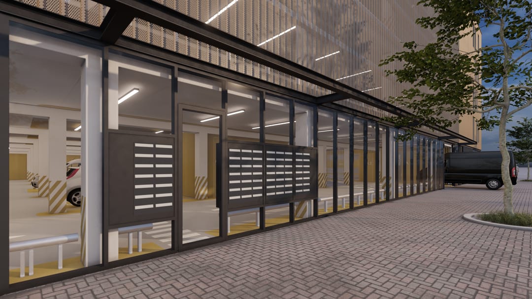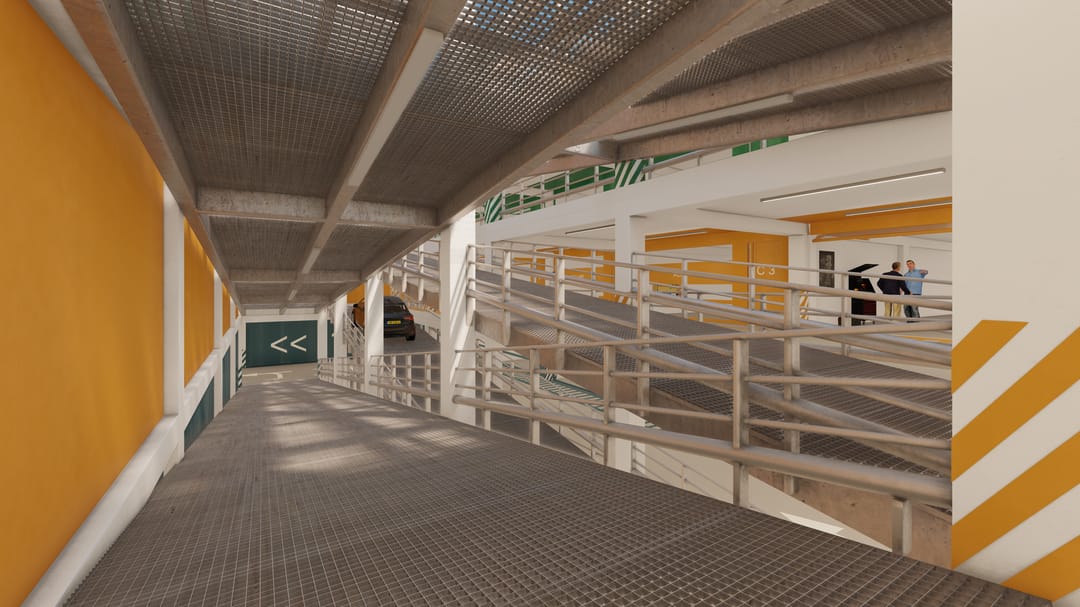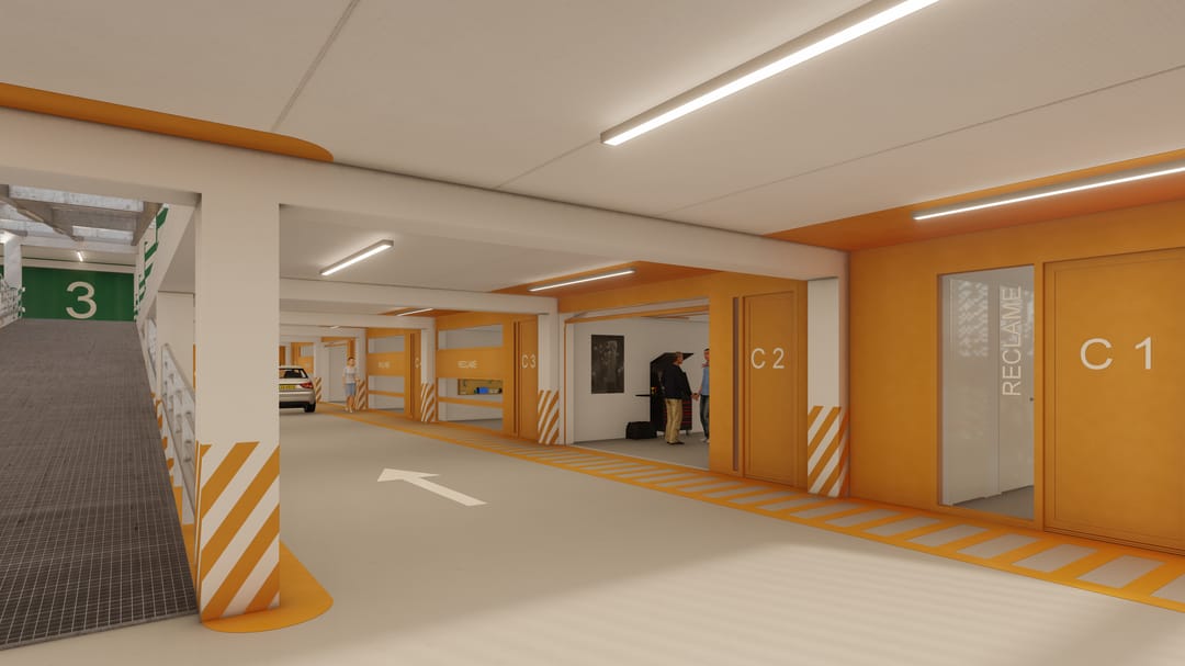 Alle verdiepingen zijn bereikbaar met auto of busje via een overdekte hellingbaan (3,1 meter breed)