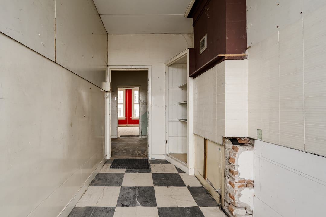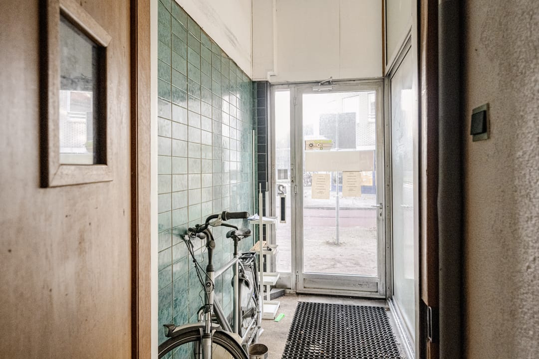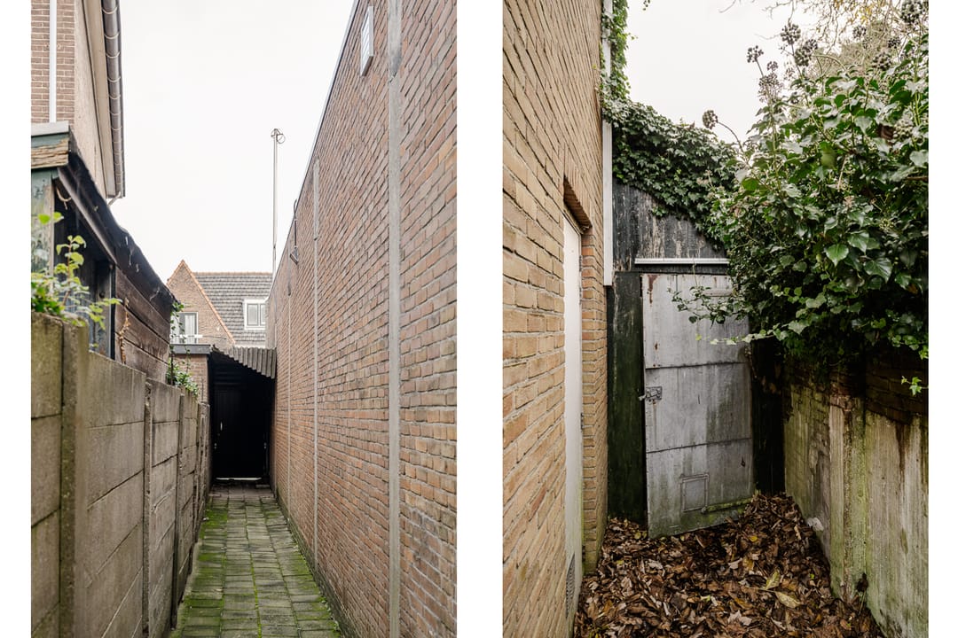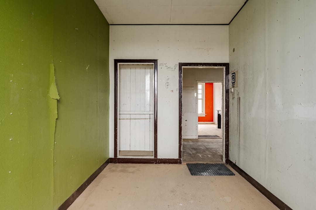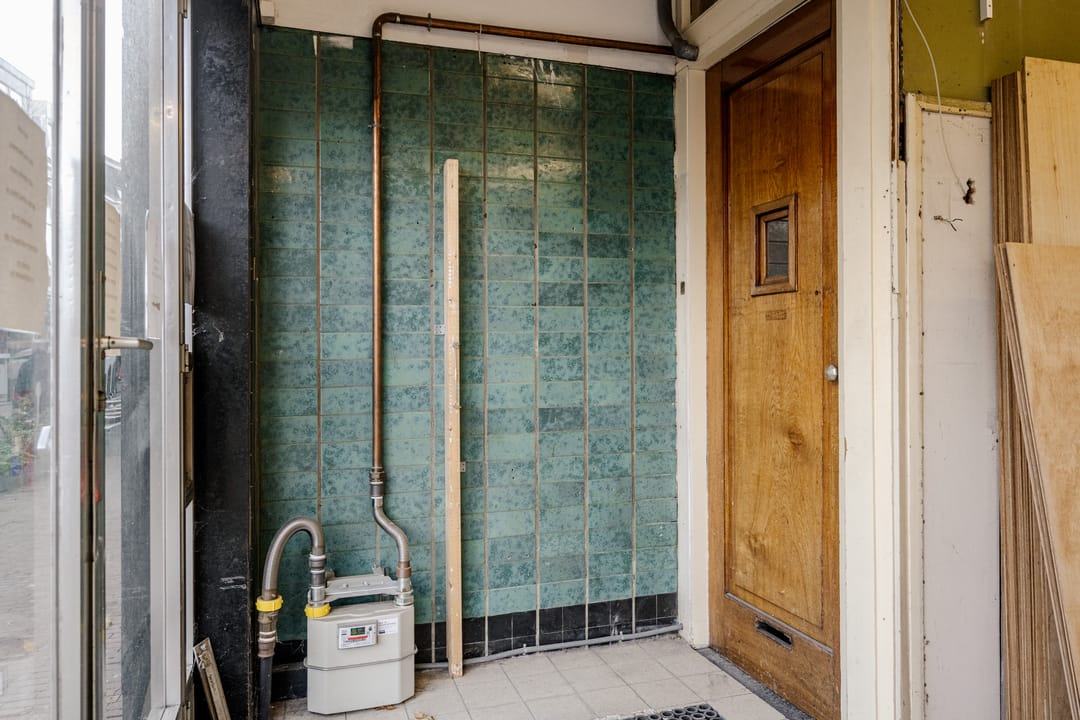 Entree aan de linkerzijde voor de bedrijfsruimte, evenals de entree voor de eerste en tweede verdieping van de linker voormalige woning thans opslagruimte. Aan het begin bevindt zich ook de gasmeter.