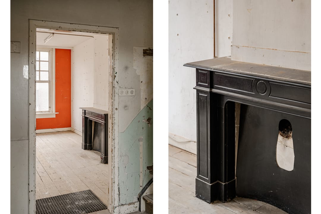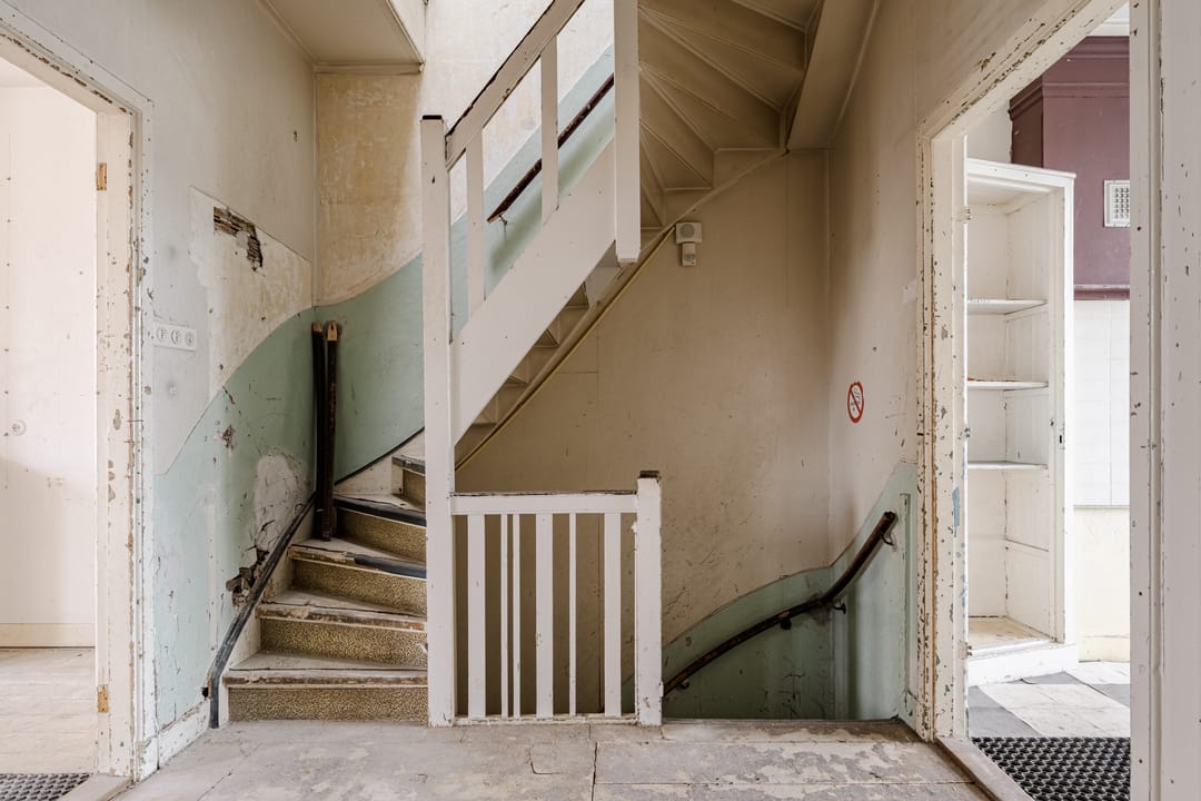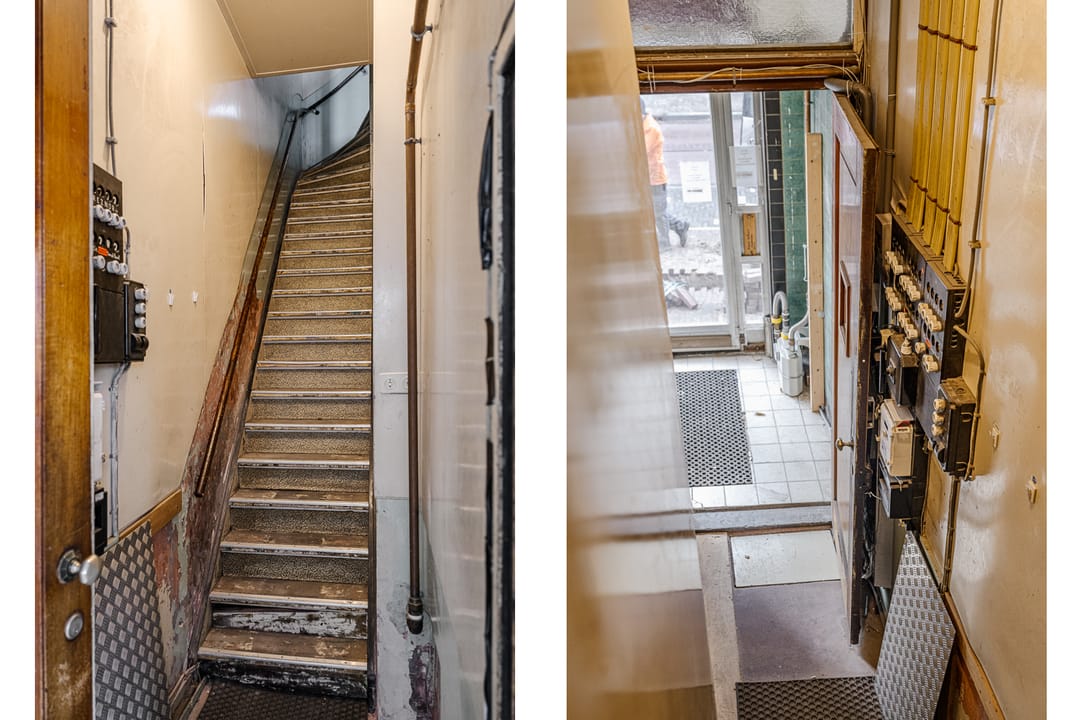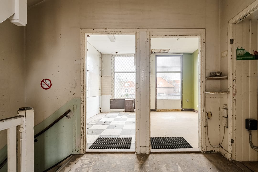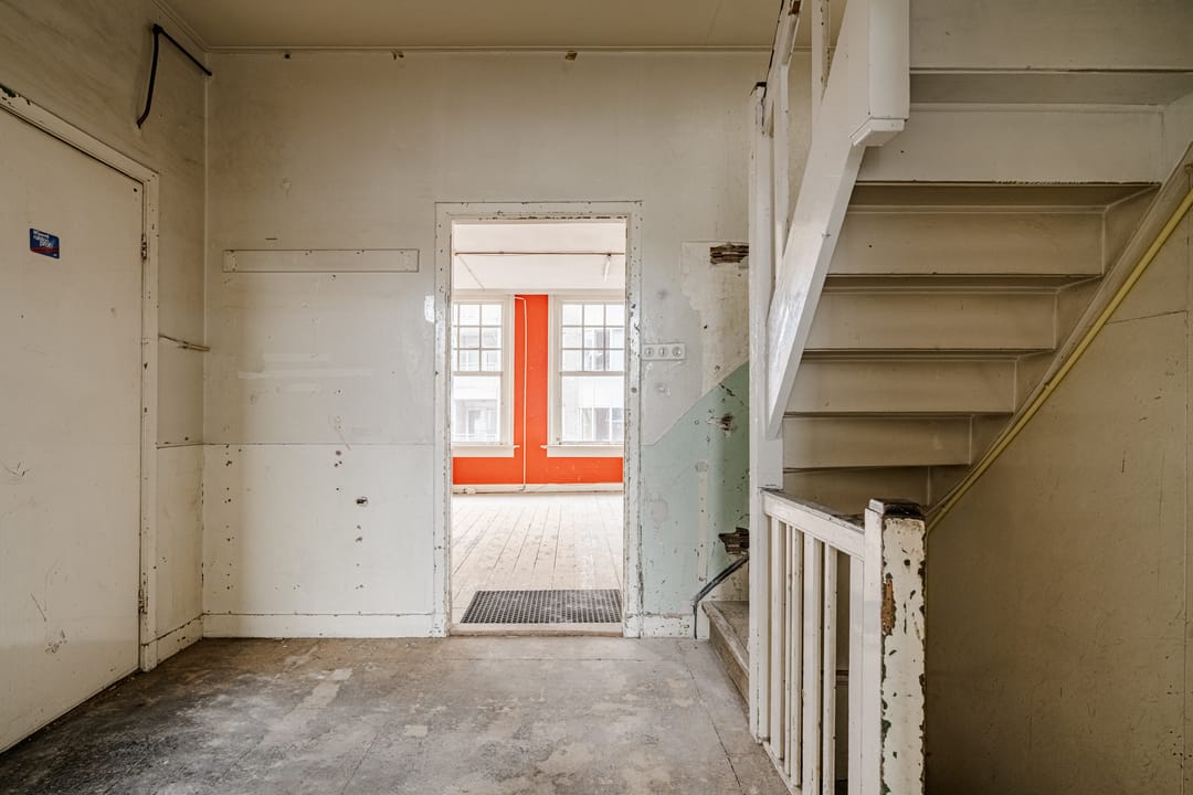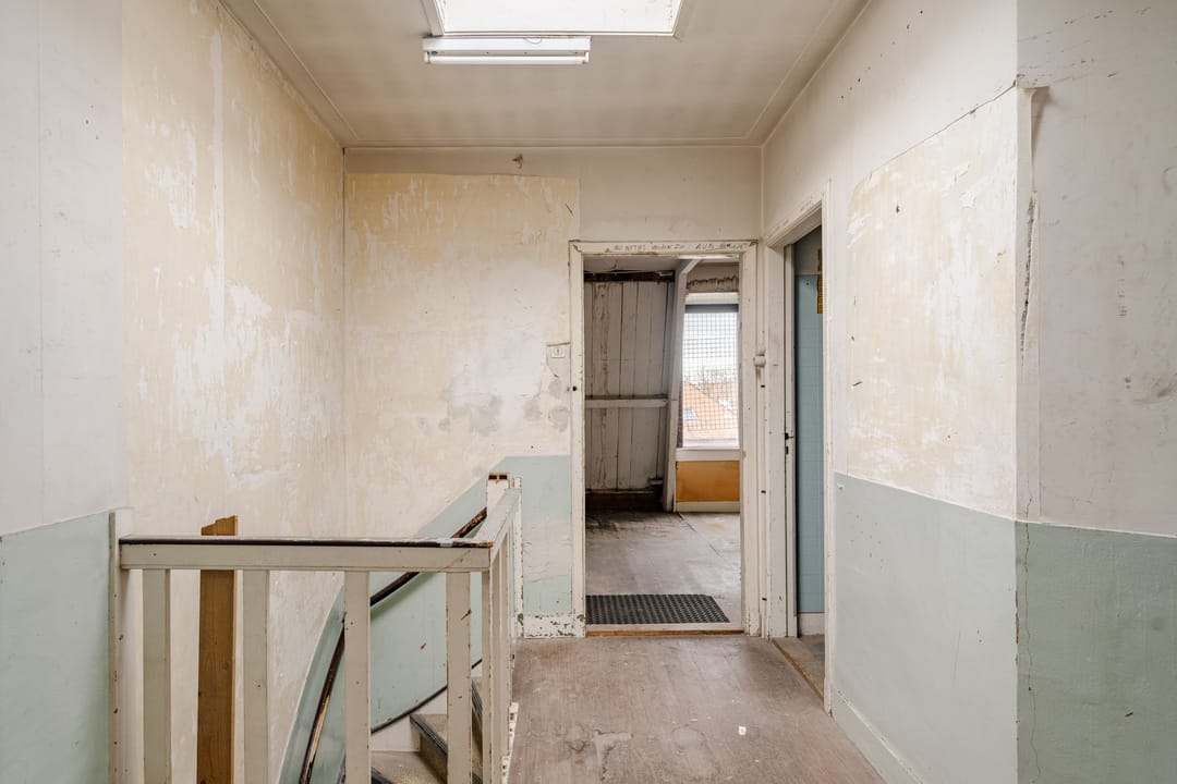 Entree aan de linkerzijde voor de bedrijfsruimte, evenals de entree voor de eerste en tweede verdieping van de linker voormalige woning thans opslagruimte. Aan het begin bevindt zich ook de gasmeter.
