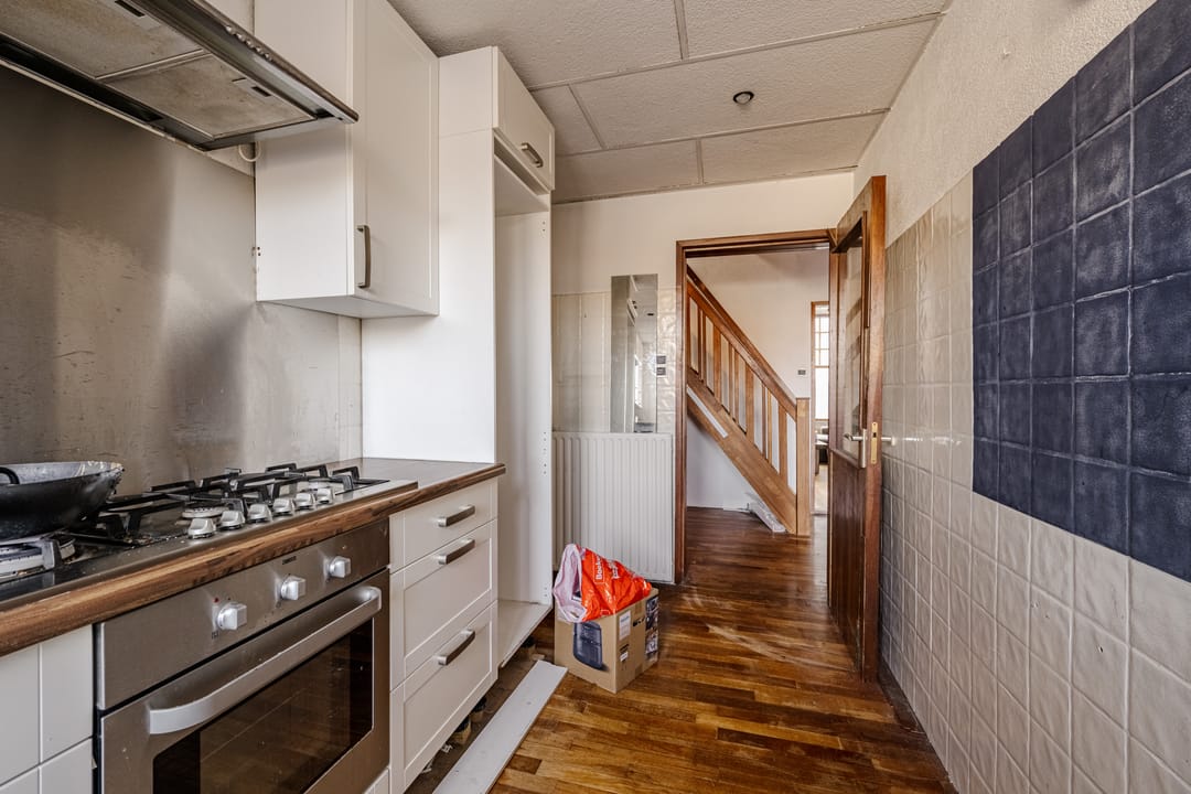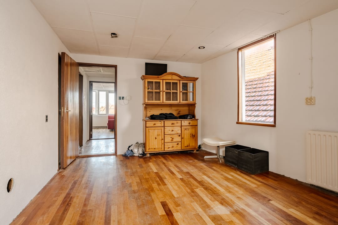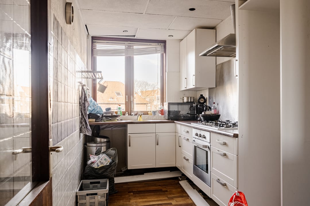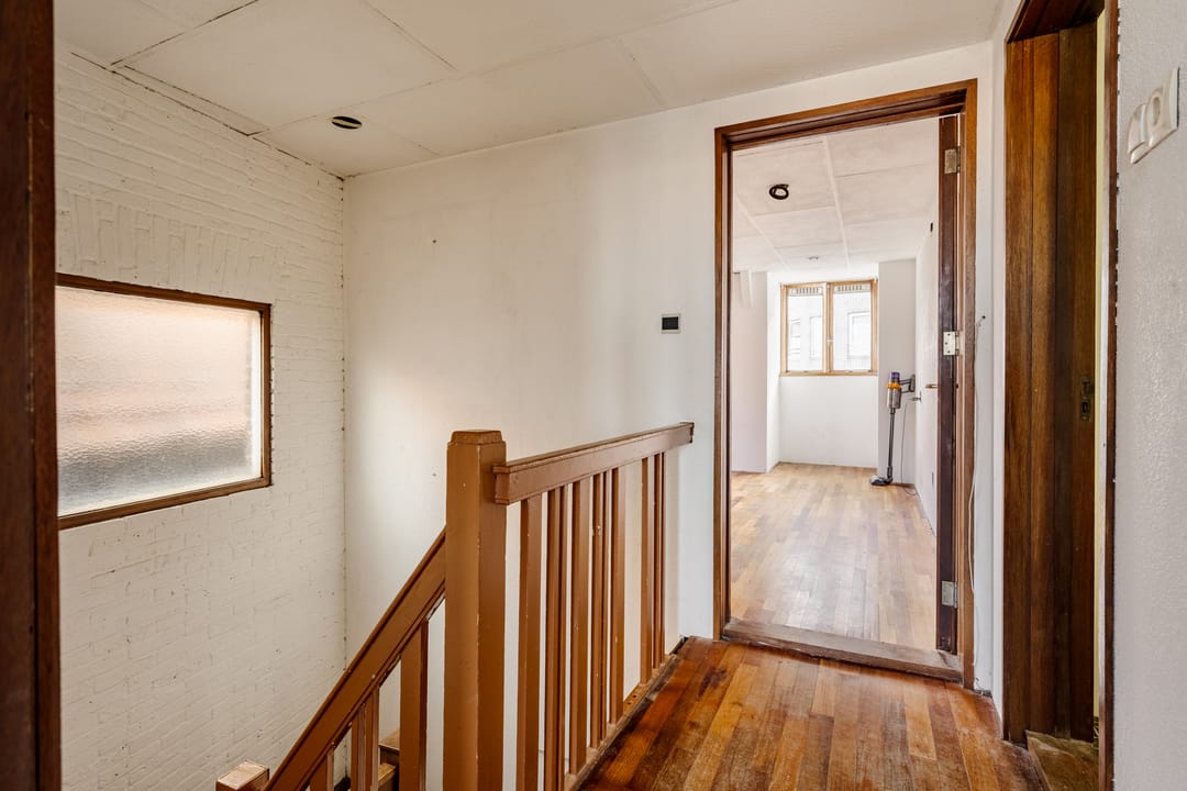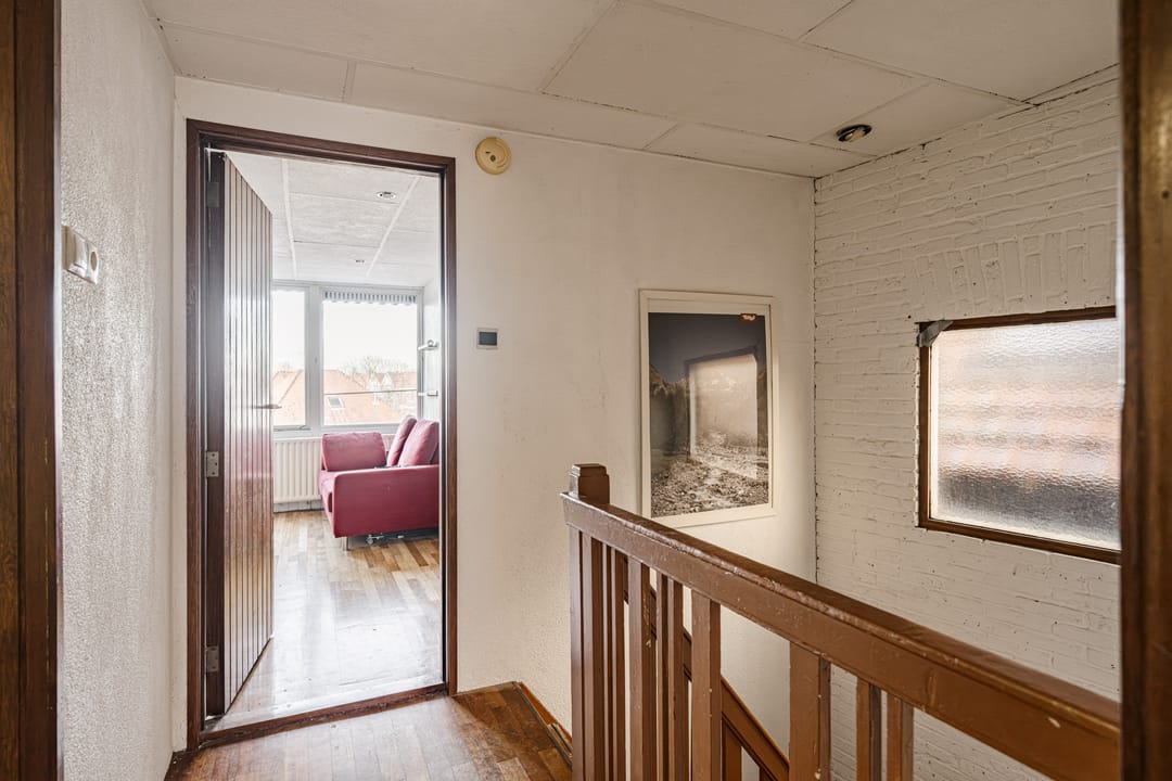 Eigen entree met tochtportaal en opgang. Gedateerde dubbel bovenhuis met op de eerste etage een woonkamer, keuken, toilet, slaapkamer en toegang tot dakterras. Tweede etage; 2 slaapkamers, en badkamer.