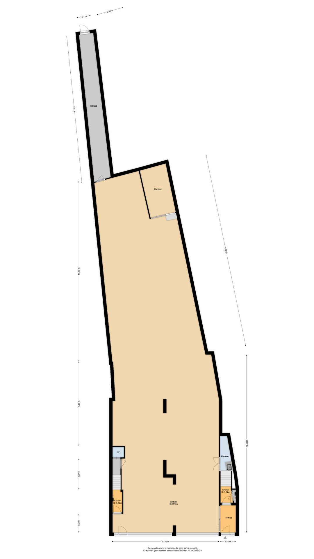 De bedrijfsruimte is circa 30 meter diep en circa 10 meter breed en loopt enigszins taps toe. Deze ruimte is voorzien van drie hangende industriële, gasgestookte heteluchtverwarmers/unit heaters.