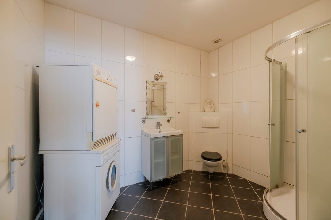 De begane grond beschikt over een praktische bedrijfshal met overheaddeur, waardoor het pand uitstekend geschikt is voor opslag, werkplaats of lichte bedrijfsactiviteiten. De ruimte is efficiënt ingedeeld en goed toegankelijk voor laden en lossen.