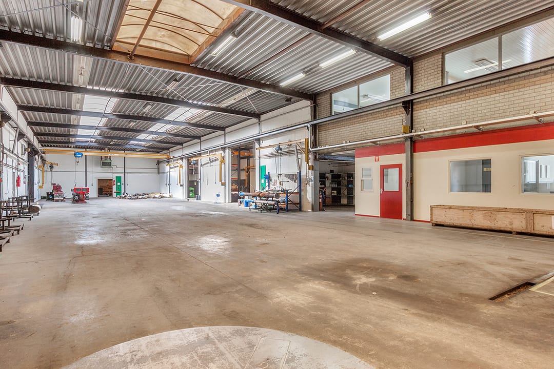 Royale multifunctionele bedrijfsruimte met een drukvaste betonvloer, TL-verlichting, meerdere lichtstraten, 2 elektrisch bedienbare segmentdeuren, uitgebreide groepenkast en 2 kraanbanen met 4 kraanliggers van 3.2 ton.