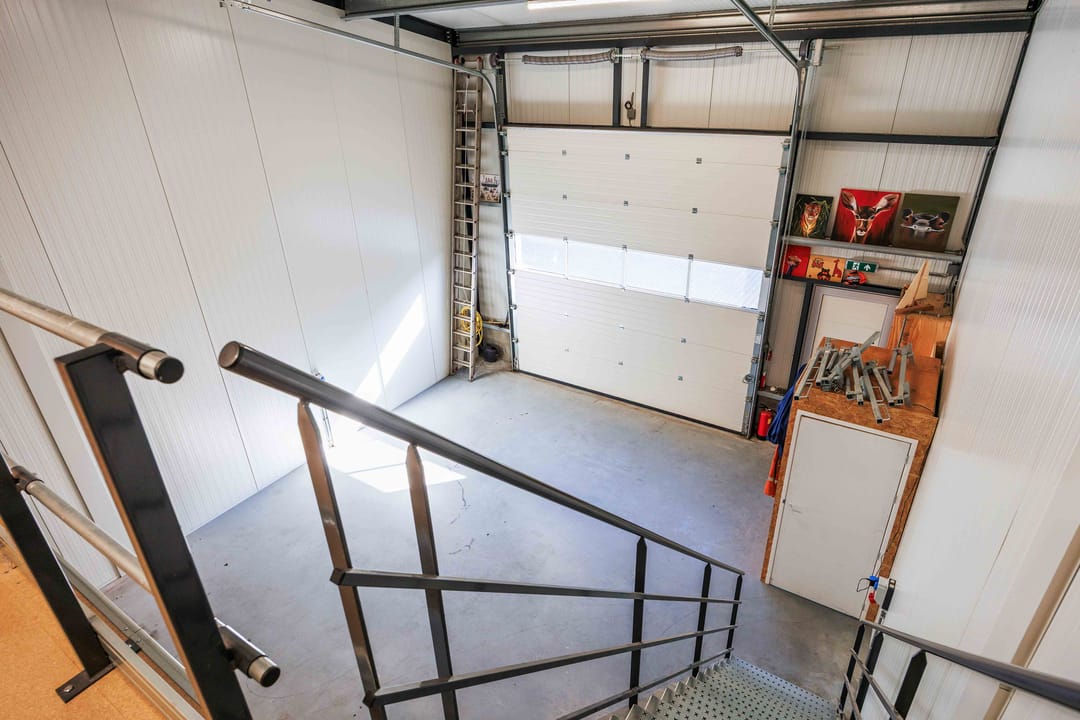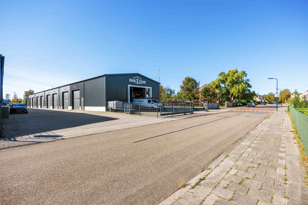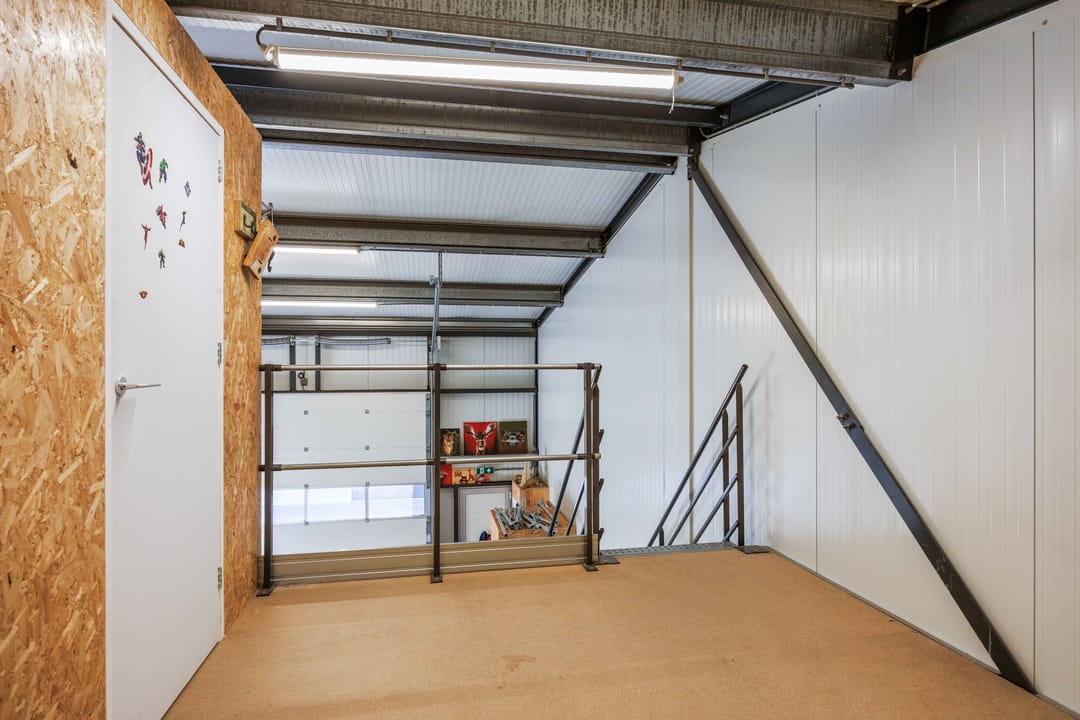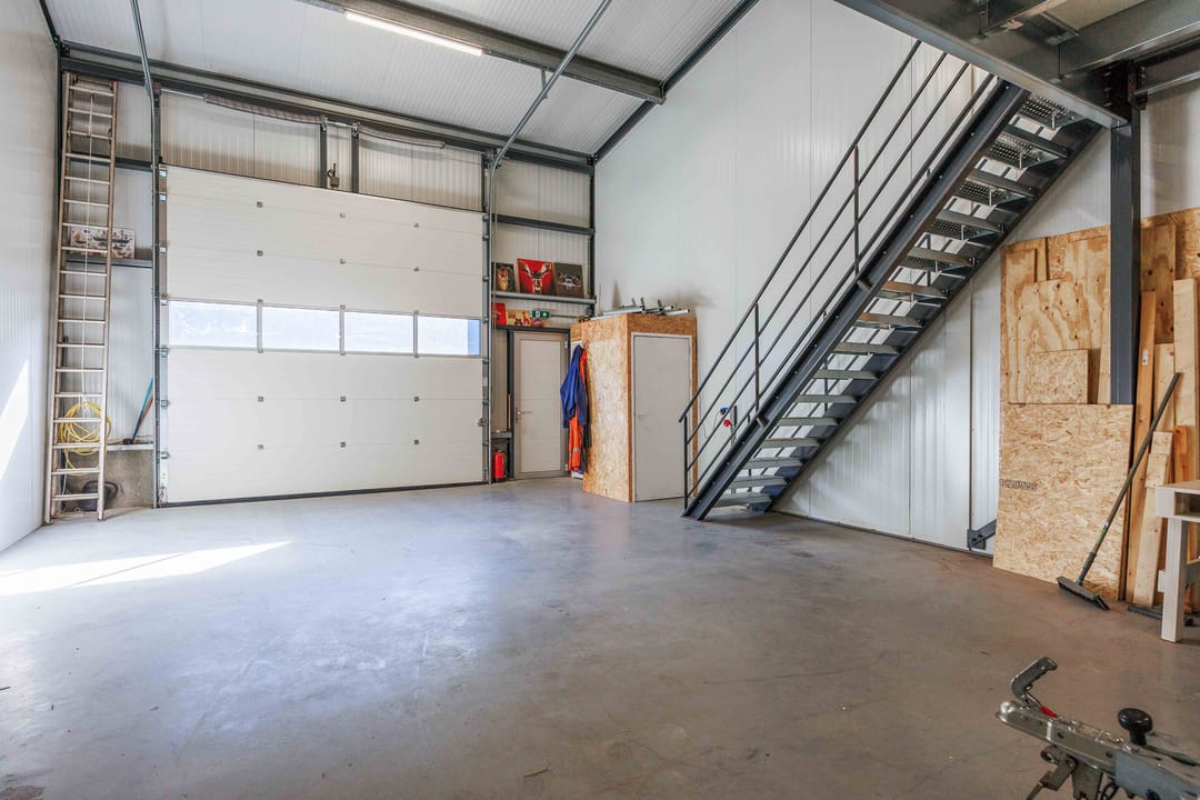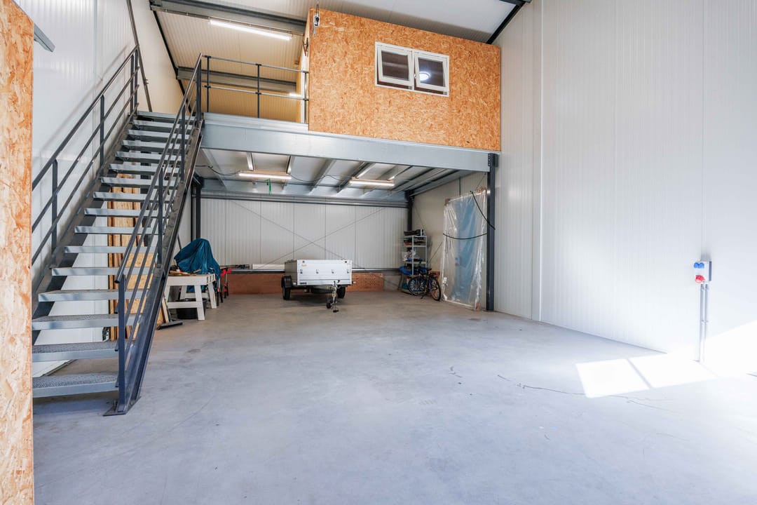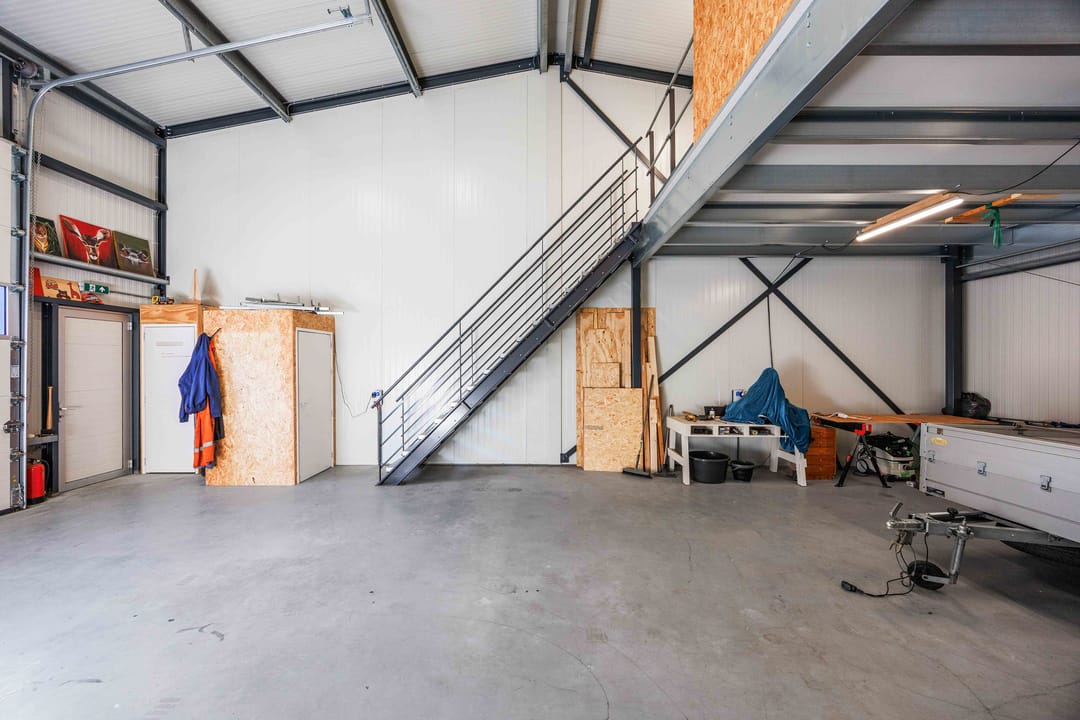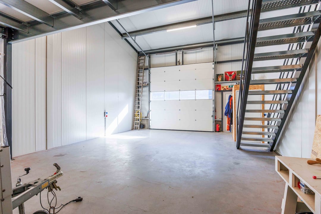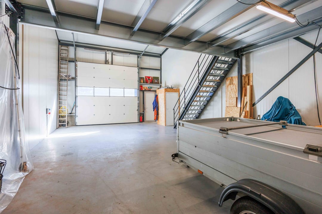 B.g.: entree middels loopdeur in kunststof pui en handbediende overheaddeur. Ruimte van ca. 7,00 x 12,50 m¹ = 86 m²; De nokhoogte is ca. 6,10 m¹, de goothoogte is ca. 5,00 m¹. Er is een meterkast (8 groepen, incl. krachtstroom), een spoelbak en een toilet.