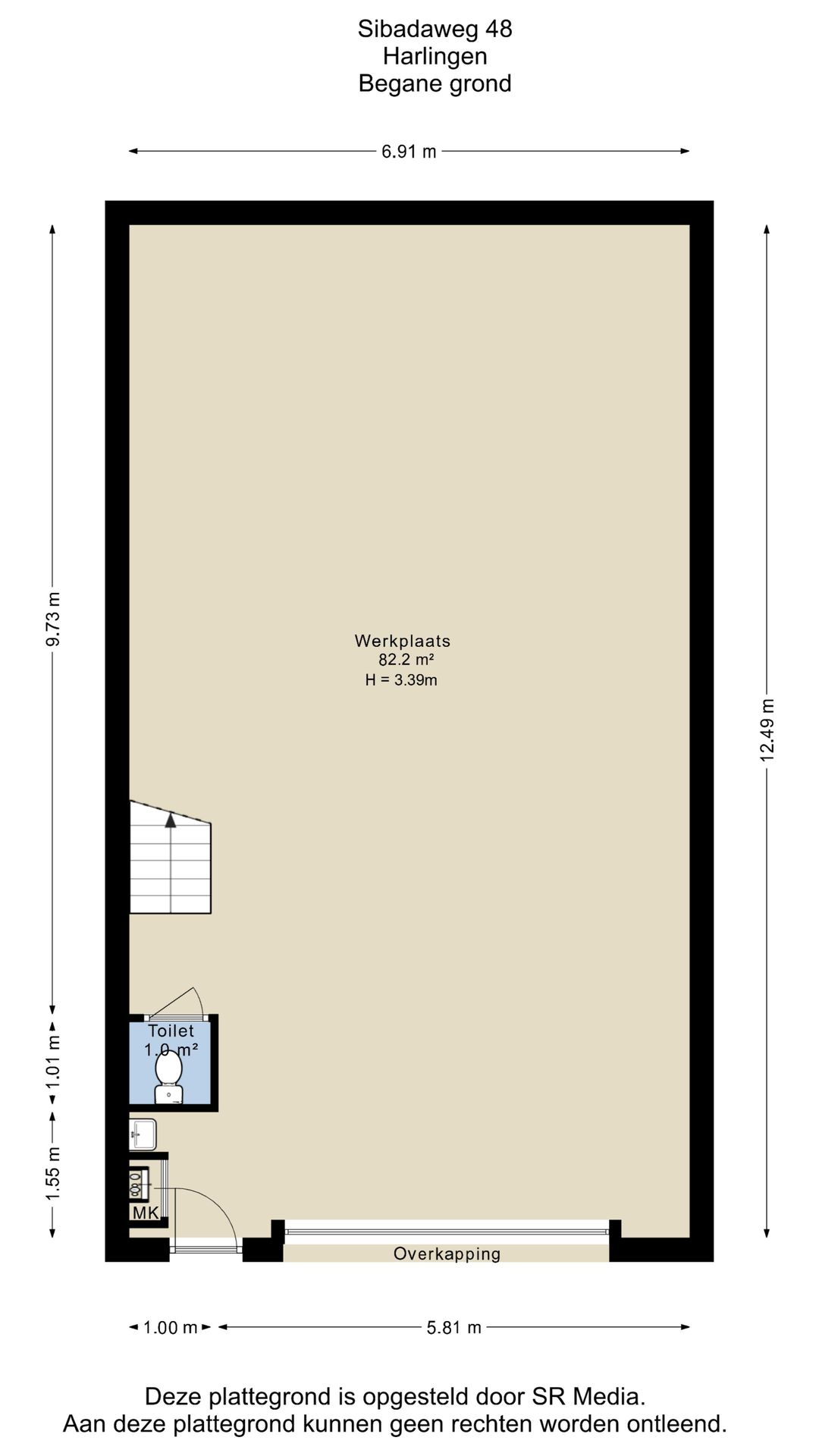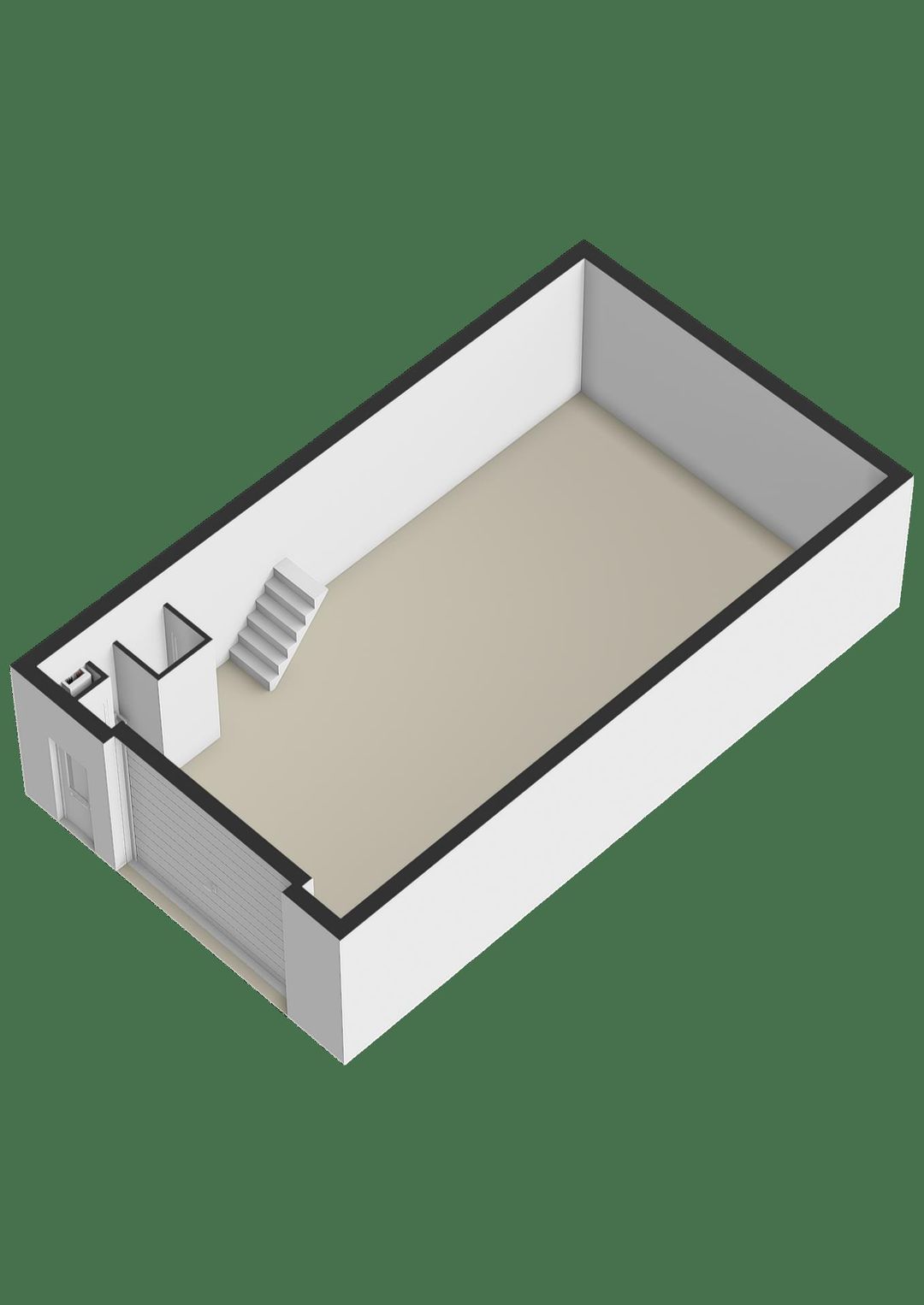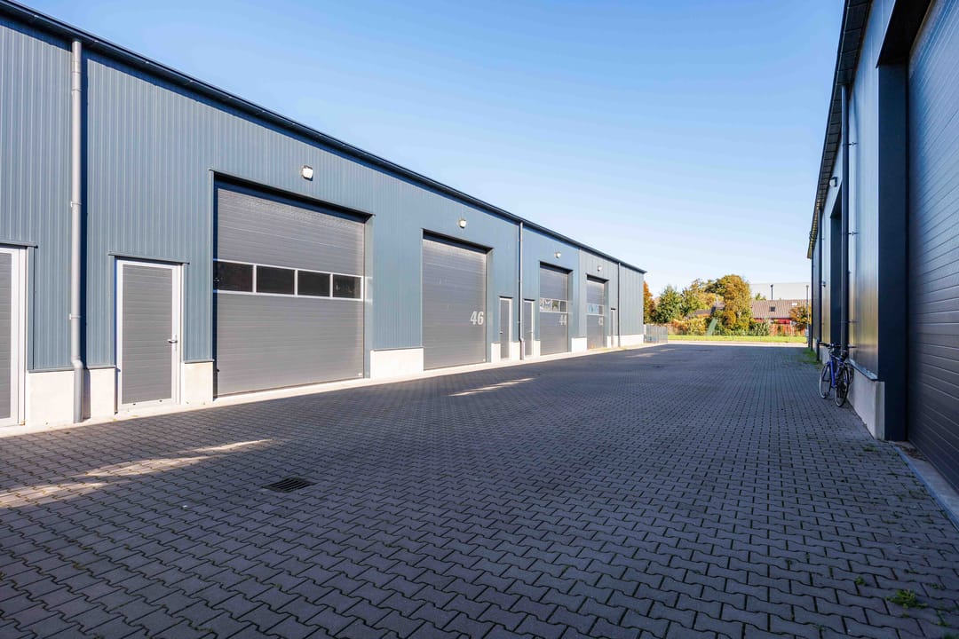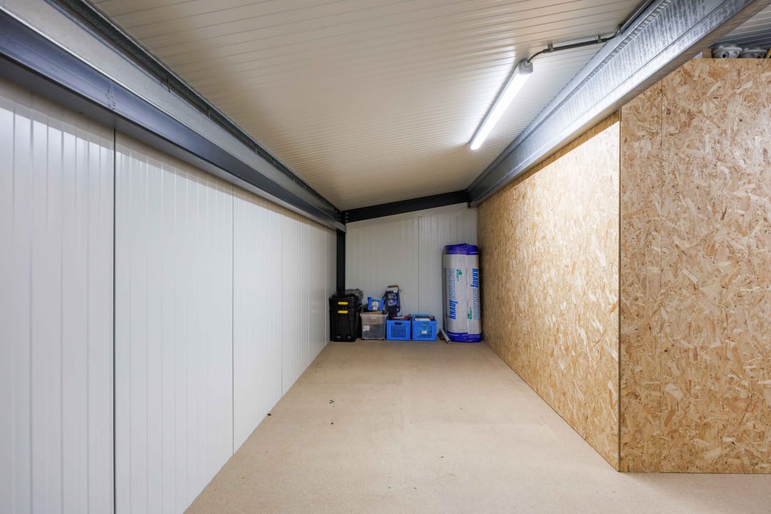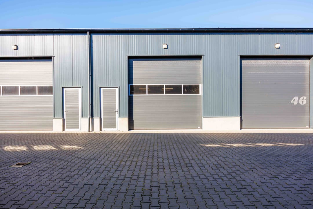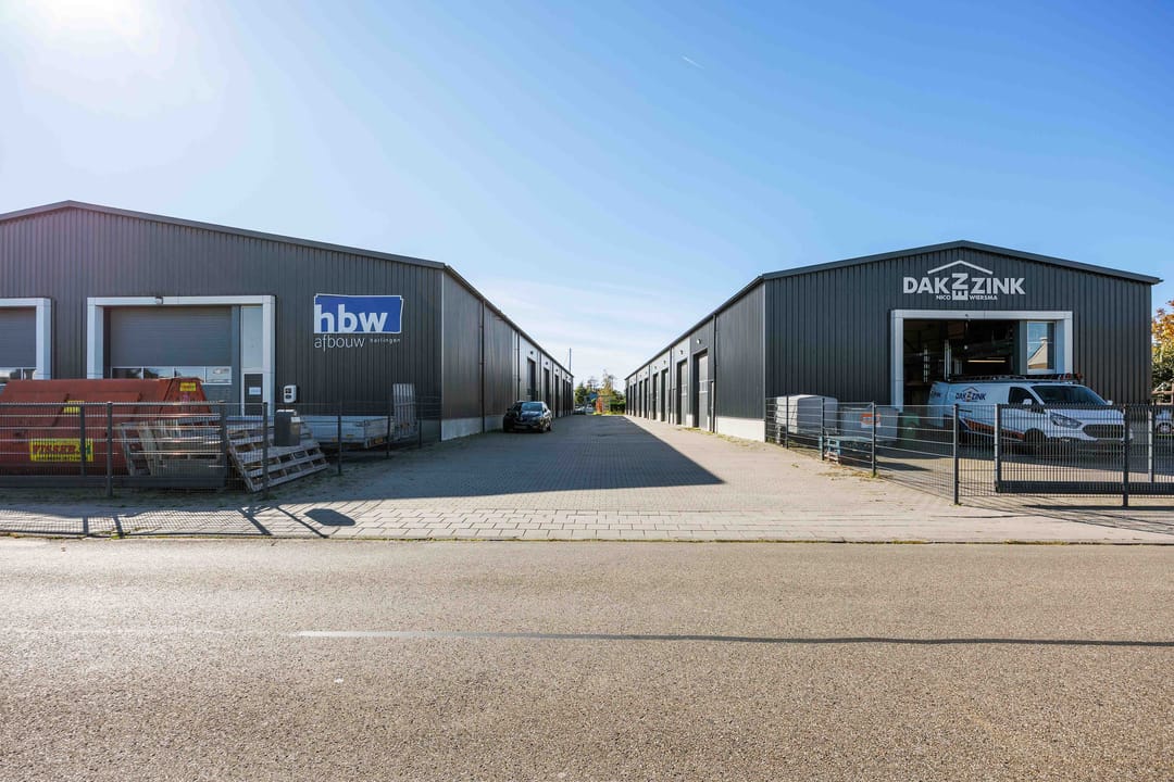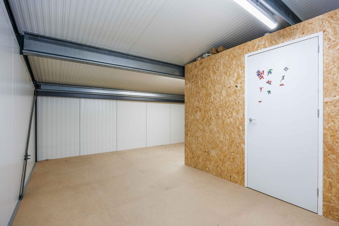 B.g.: entree middels loopdeur in kunststof pui en handbediende overheaddeur. Ruimte van ca. 7,00 x 12,50 m¹ = 86 m²; De nokhoogte is ca. 6,10 m¹, de goothoogte is ca. 5,00 m¹. Er is een meterkast (8 groepen, incl. krachtstroom), een spoelbak en een toilet.