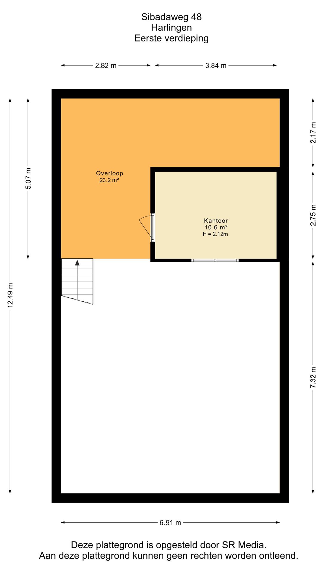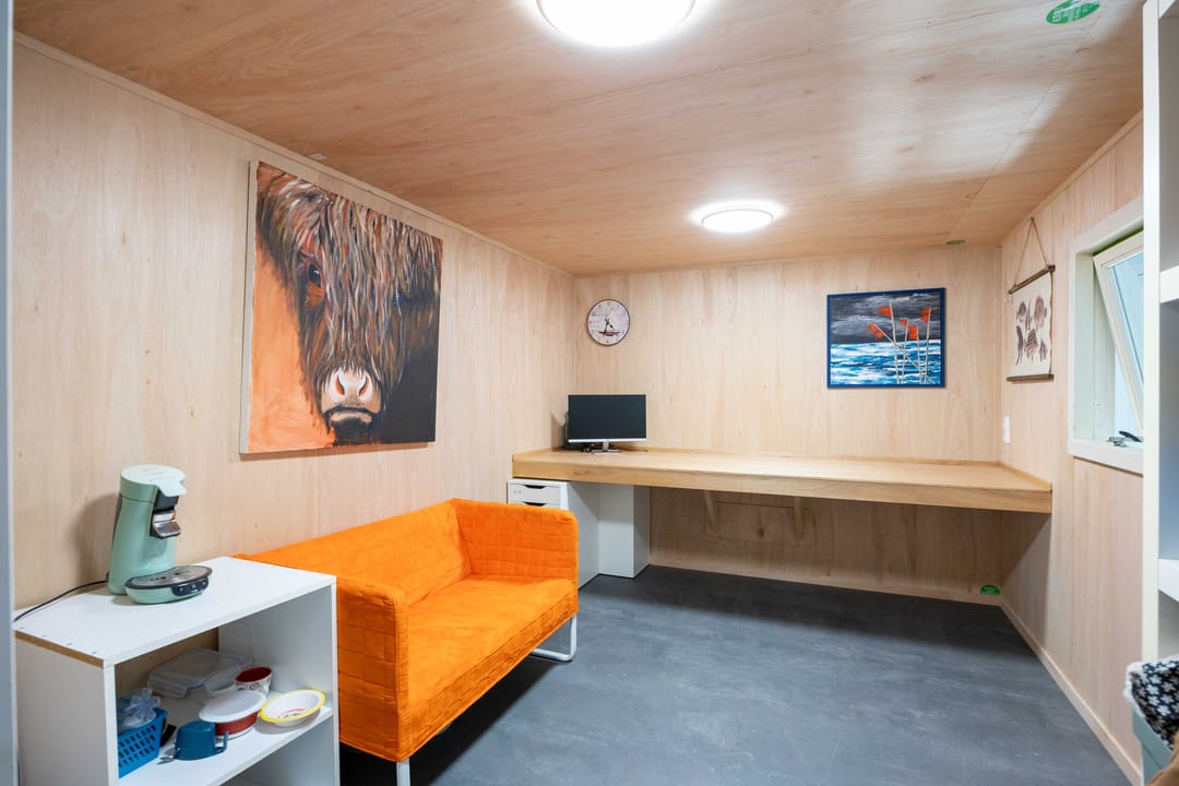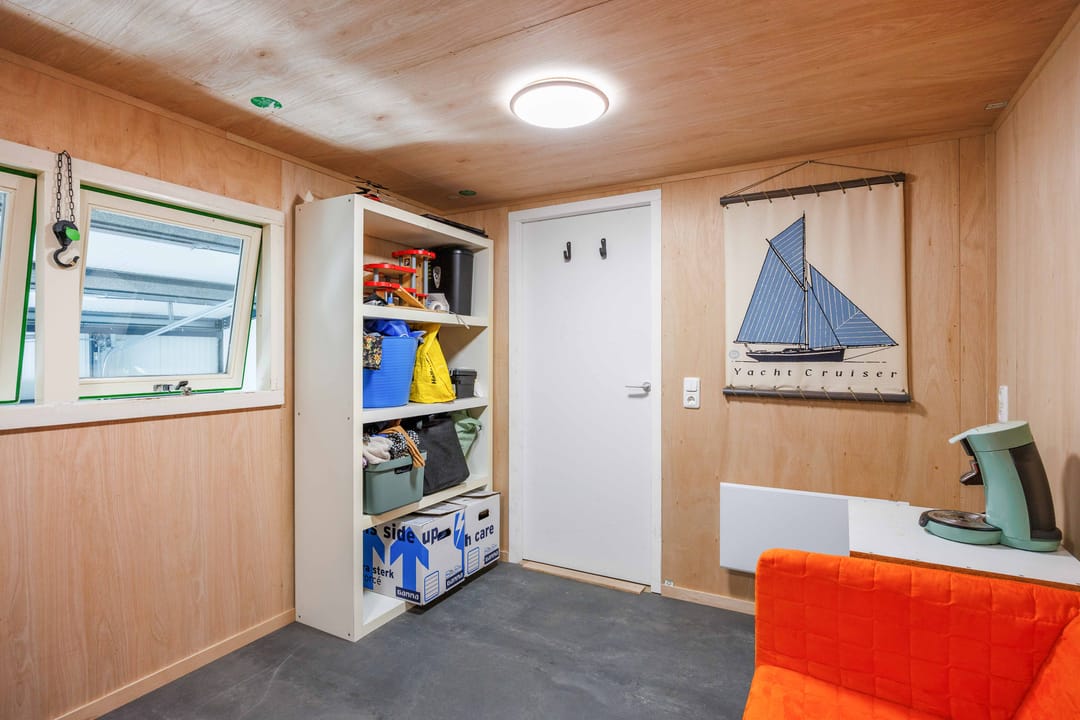 Boven: verdiepingsvloer van ca. 35 m² met een keurig kantoortje van ca. 11 m², voorzien van een vast bureaublad, verlichting, elektrische radiator en 2 ramen.