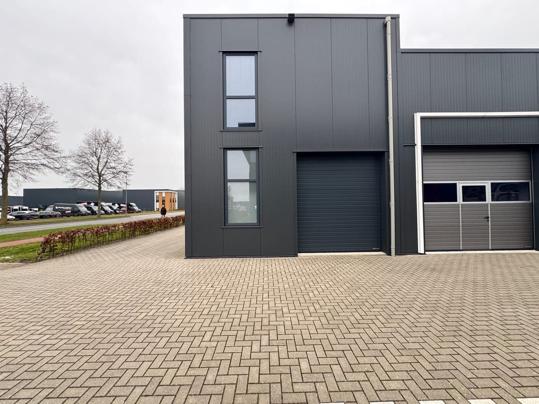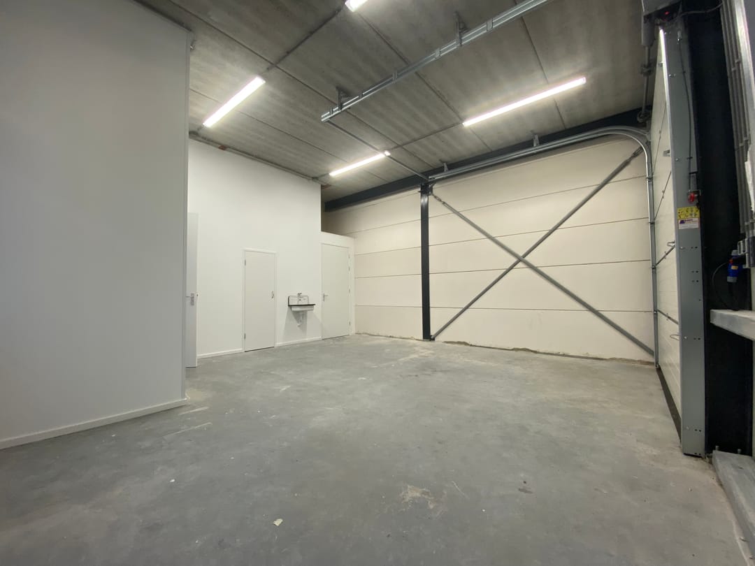 - Overheaddeuren, krachtstroom, betonvloer, toilet, pantry, airconditioning, inbouwarmaturen en te openen ramen
