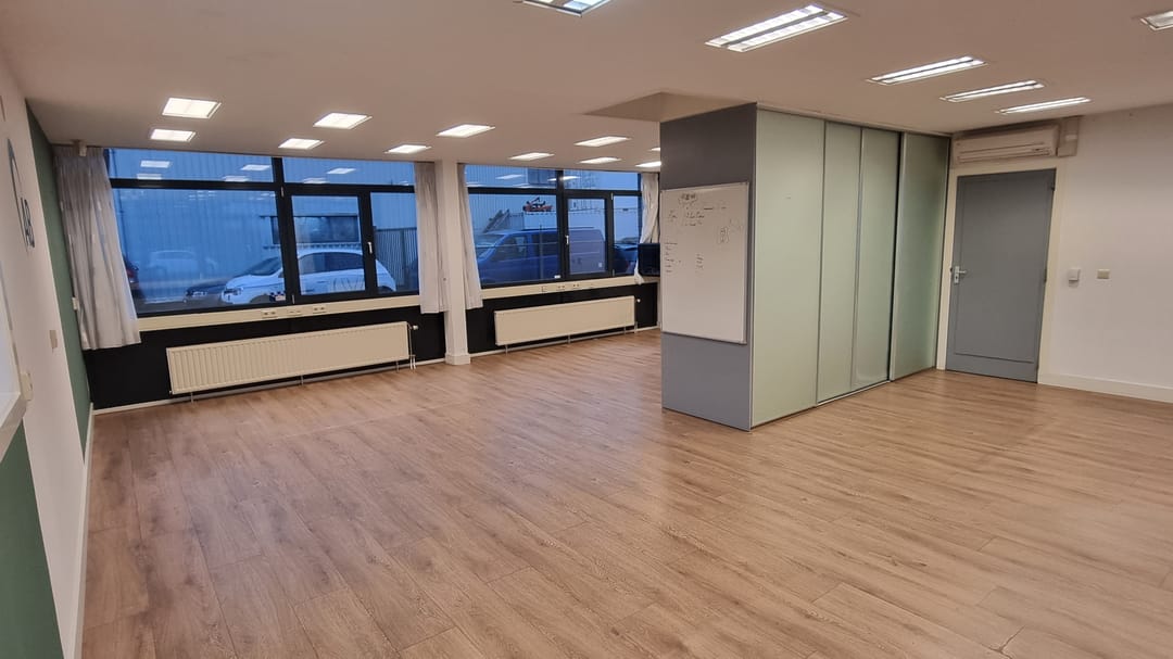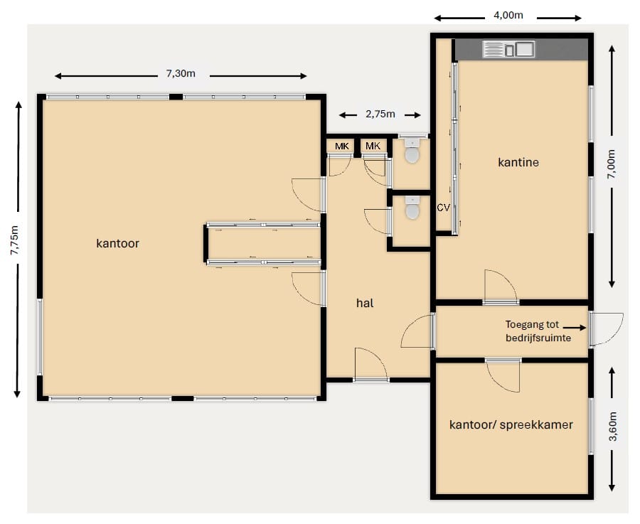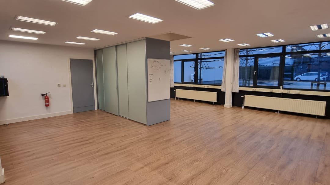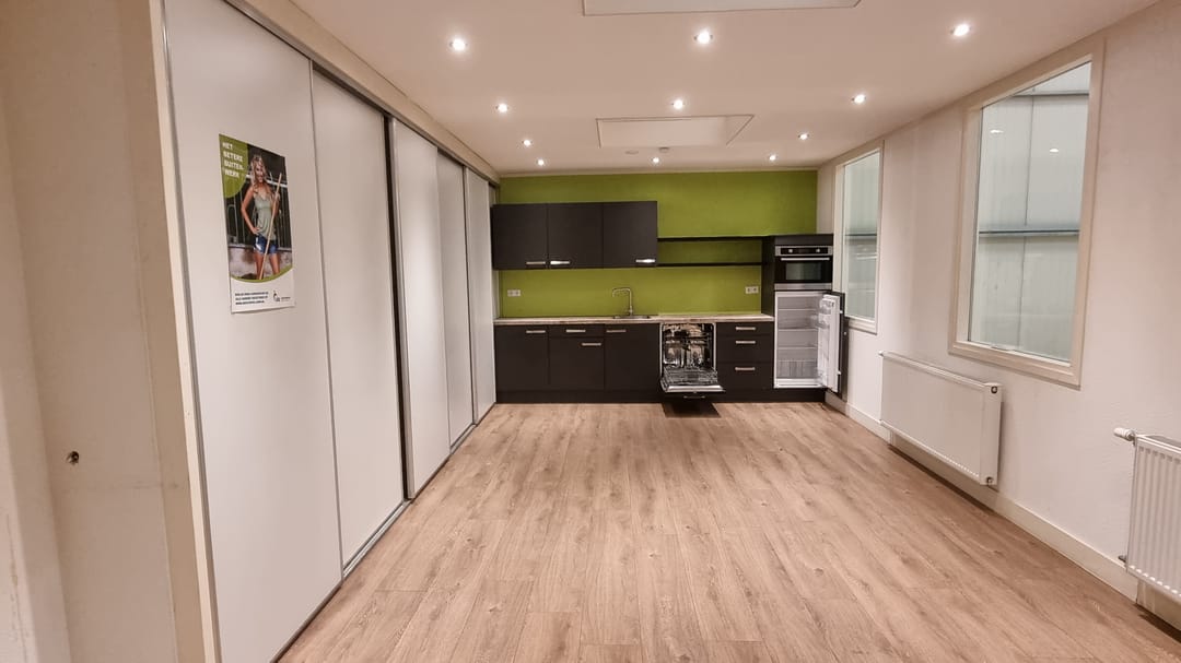 - Kantine, groot ca. 28m², voorzien van keukenopstelling, schuifwandenkast (opstelplaats cv-ketels)