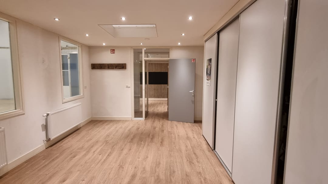 - Kantoorruimte, groot ca. 56m², ingericht met twee schuifwandenkasten, toegang tot bergzolder