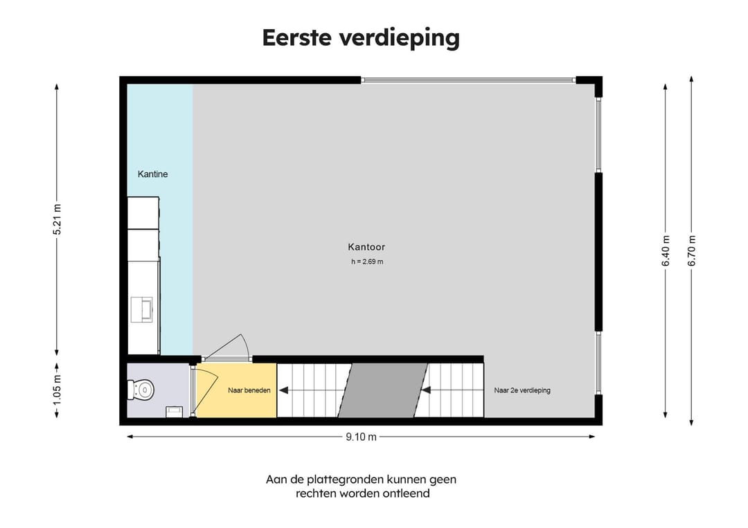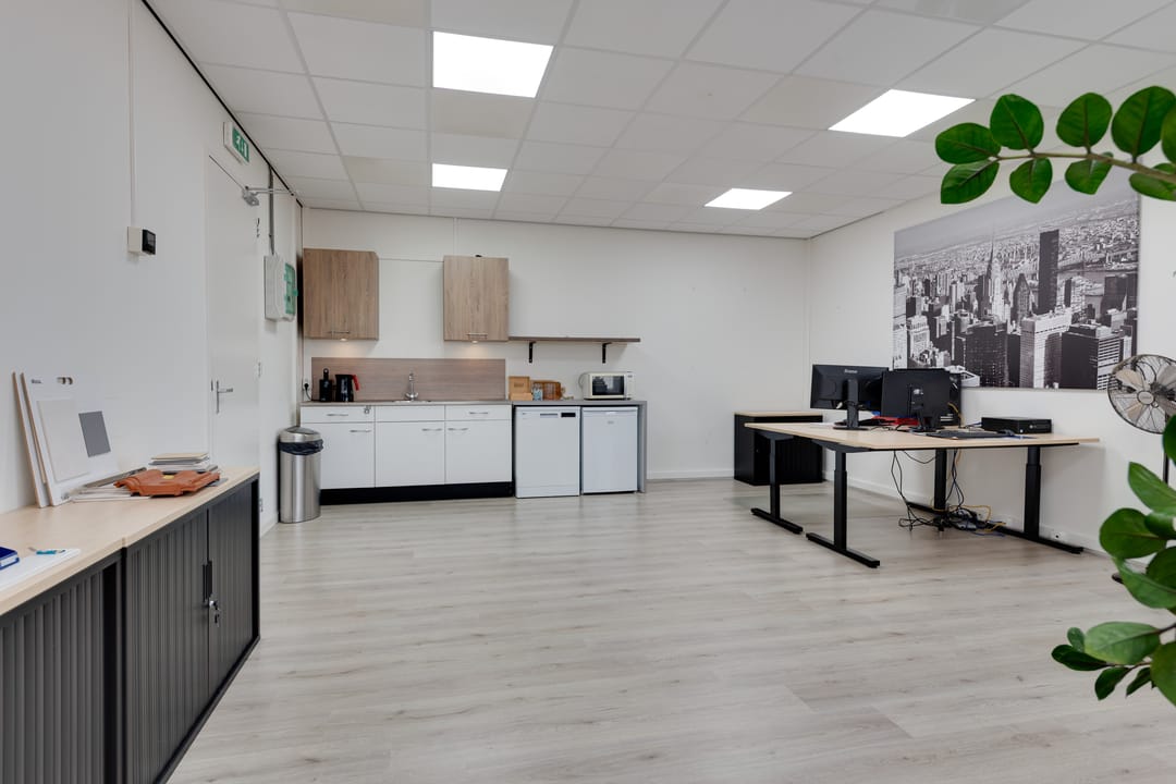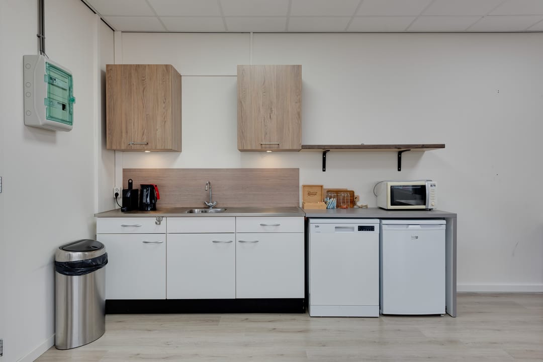 Op deze verdieping is eveneens een toilet aanwezig, voorzien van een wasbakje. Daarnaast beschikt de eerste verdieping over een klein keukentje, waardoor medewerkers eenvoudig koffie of thee kunnen zetten en een lunch kunnen bereiden. Dit draagt bij aan een comfortabele werkomgeving en maakt het pand geschikt voor dagelijks intensief gebruik.