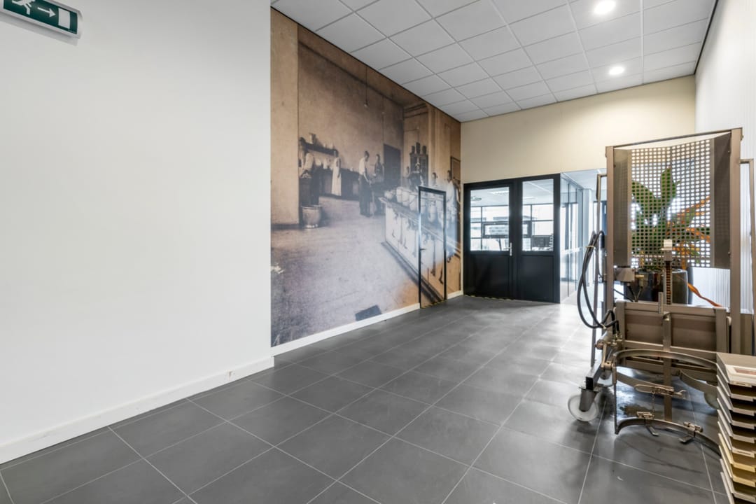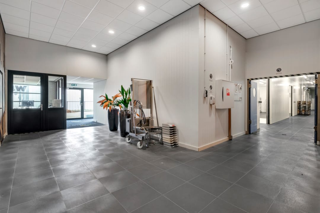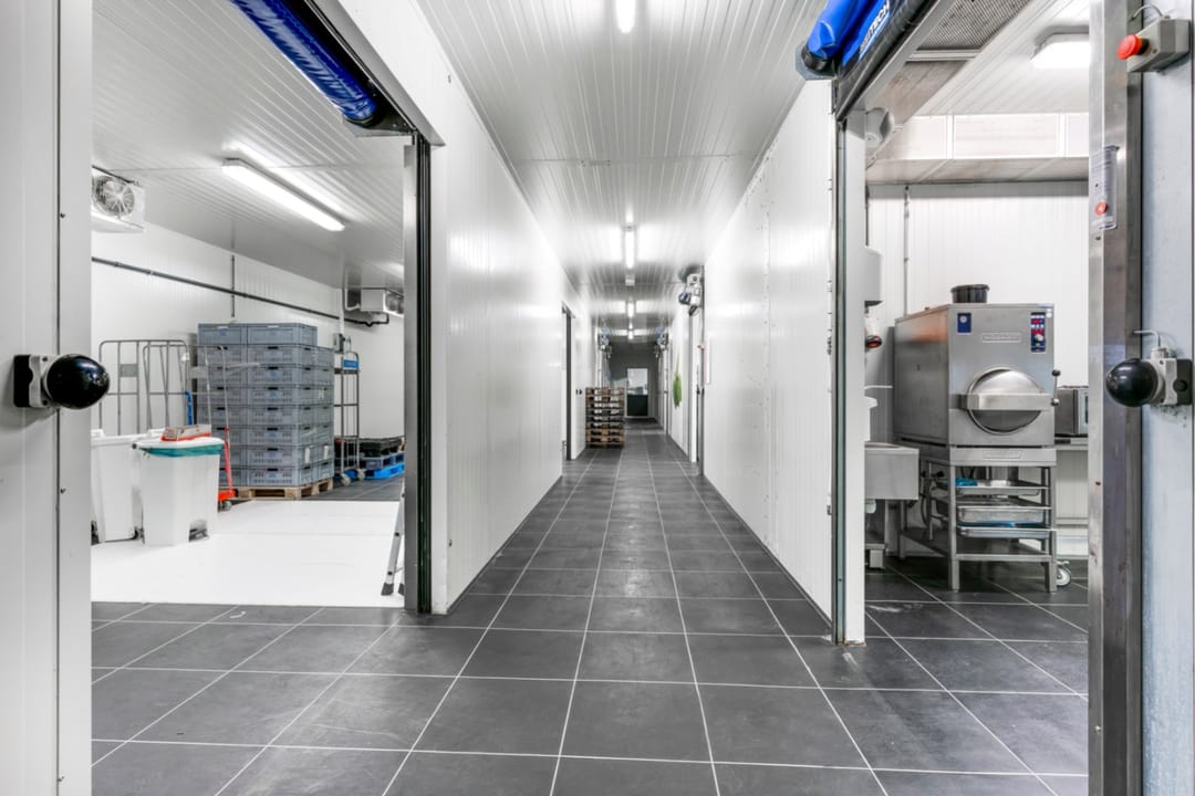 Entree/ontvangsthal met toegang tot het kantoor, bedrijfsbureau, dames- en heren kleedruimtes met toiletten, de productieruimte met koelsysteem en diverse opslagruimten. De productieruimte is voorzien van 4 elektrische overheaddeuren. Op de begane grond zijn tevens een demokeuken, de verpakkingsruimte en diverse koel- en vriesruimten gelegen. Op de eerste verdieping bevinden zich 3 kantoren, voorzien van laminaatvloer en airconditioning.