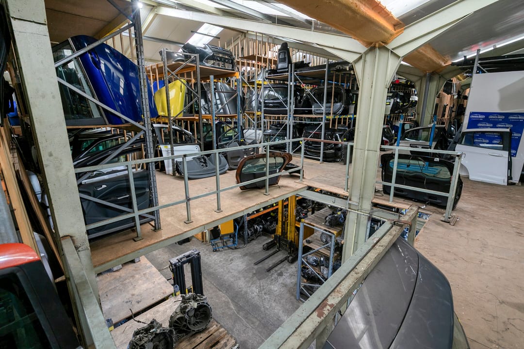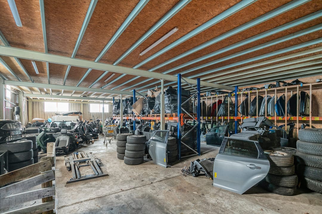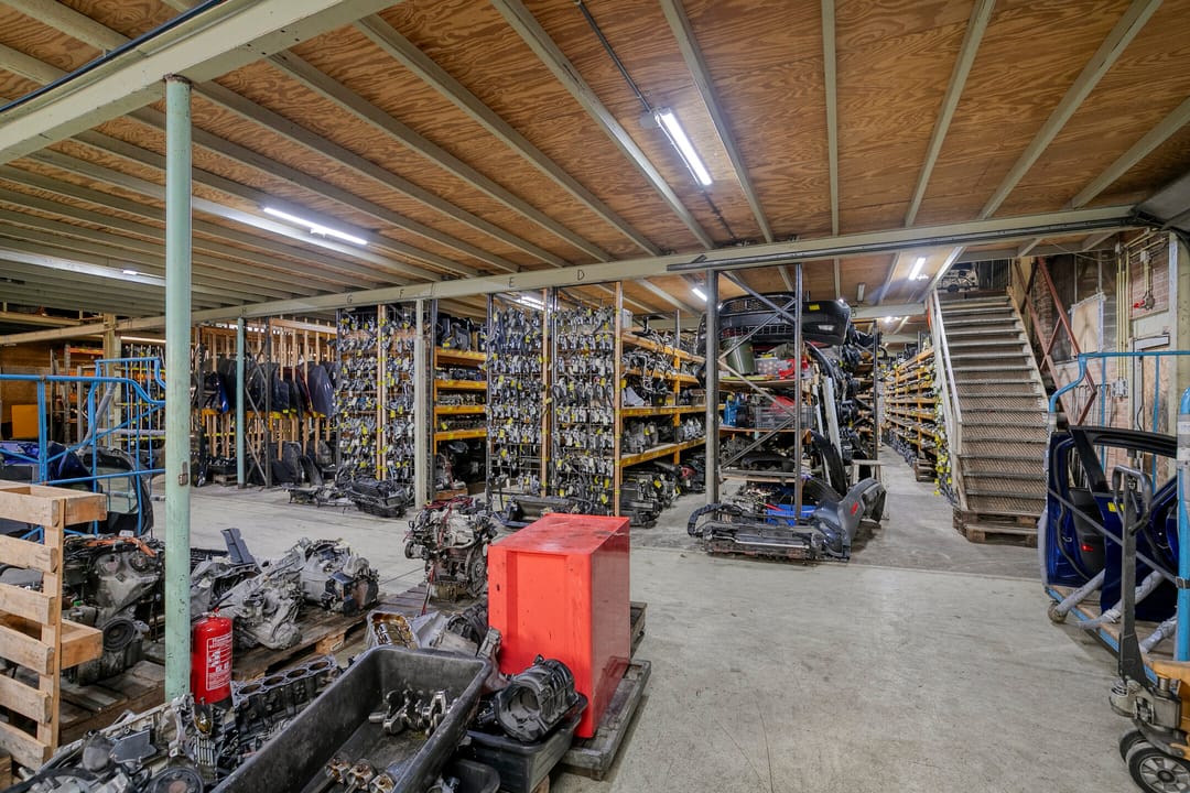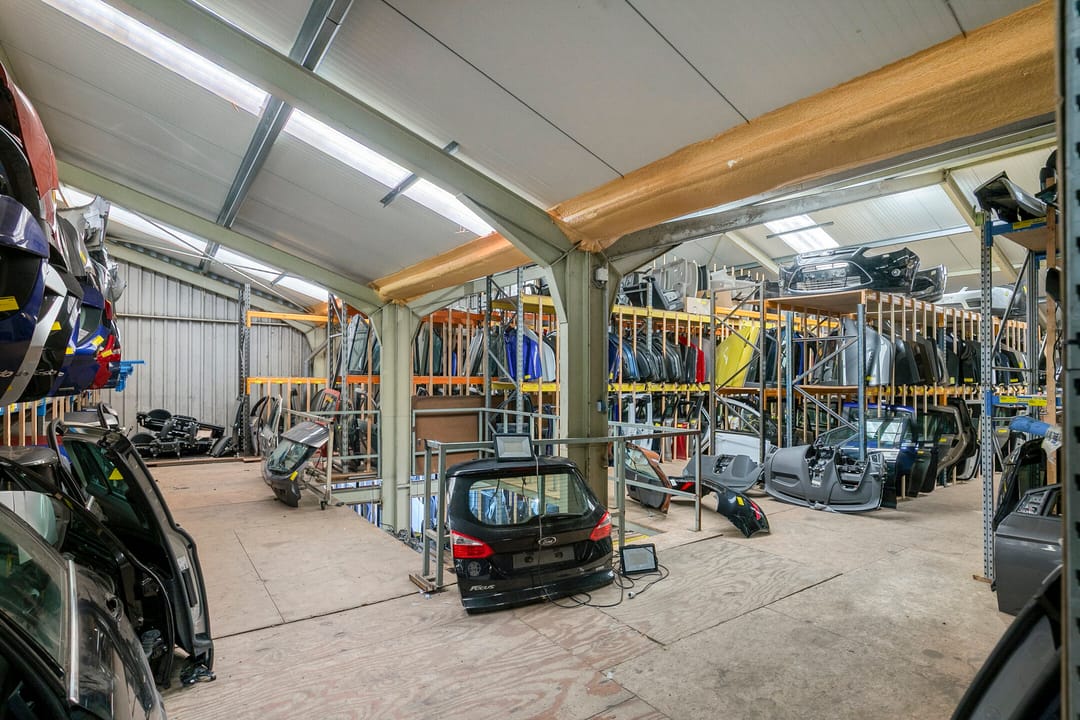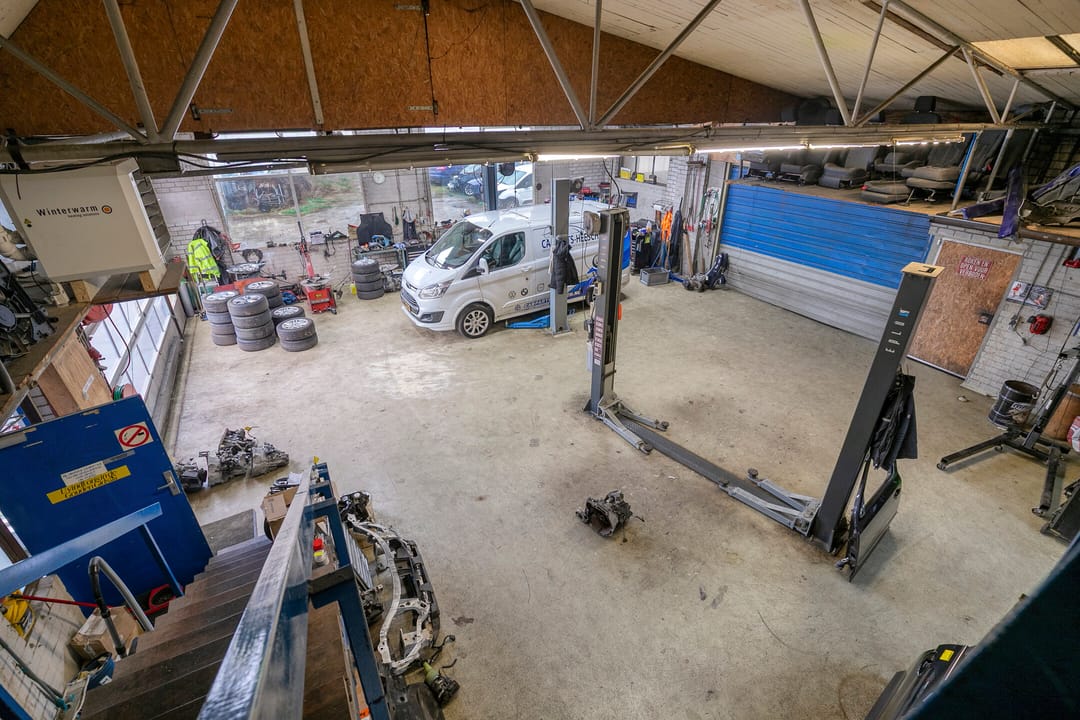 De werkplaats is deels voorzien van een houten verdiepingsvloer, welke als magazijn dienst doet en voorzien van een trekbank voor het richten van schade voertuigen.